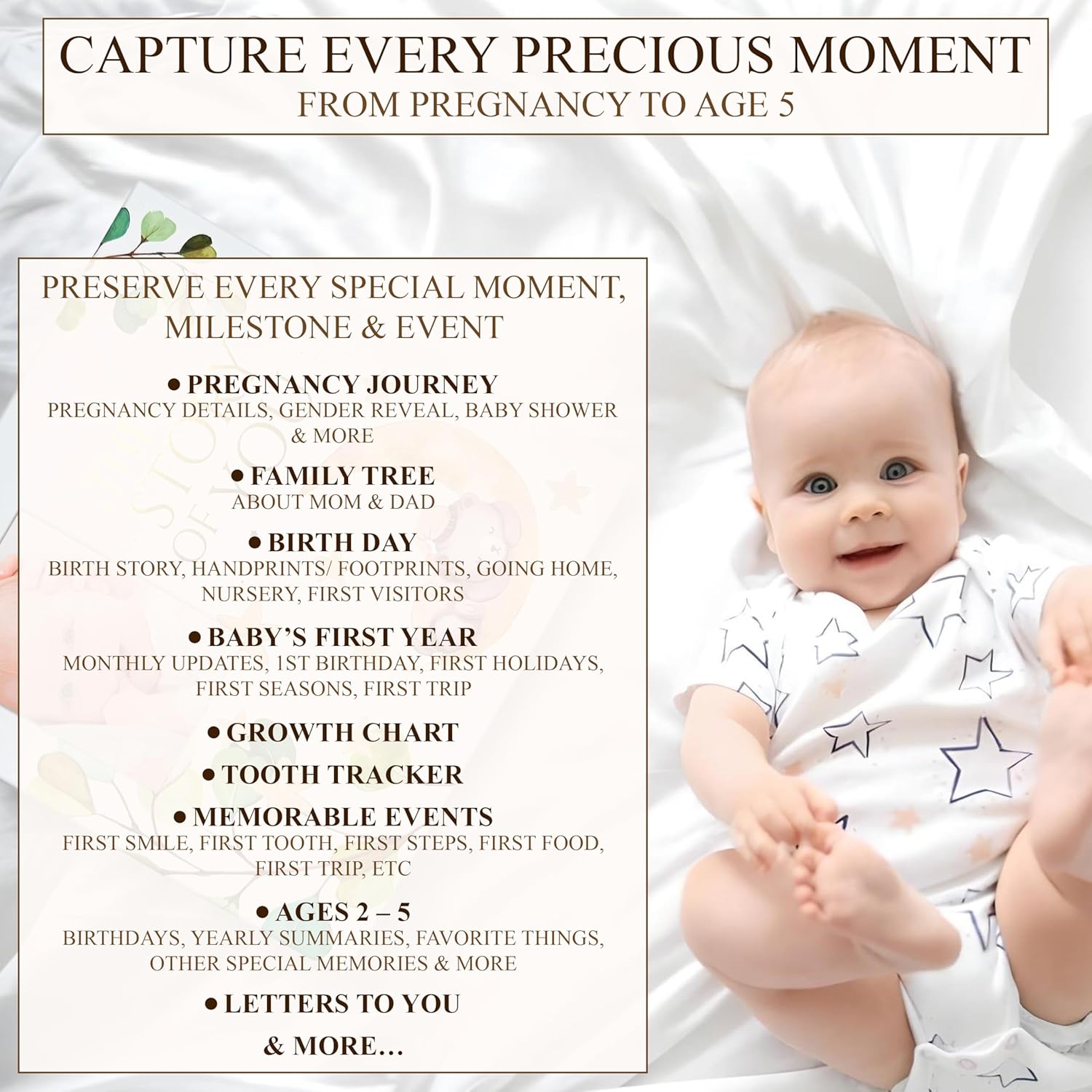 - [RECORD EVERY EVENT FROM BIRTH TO AGE 5]: Cherish every moment with our beautifully designed memory book. More than a baby scrapbook, it's an essential pregnancy journal for first-time mom & an ideal baby shower gift. Covering all milestones, with ample photo space & keepsake folders. It's more than a book, it's a first-time mommy must-have. Make every moment count with our keepsake book.