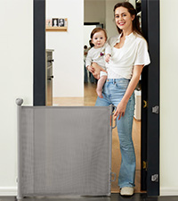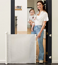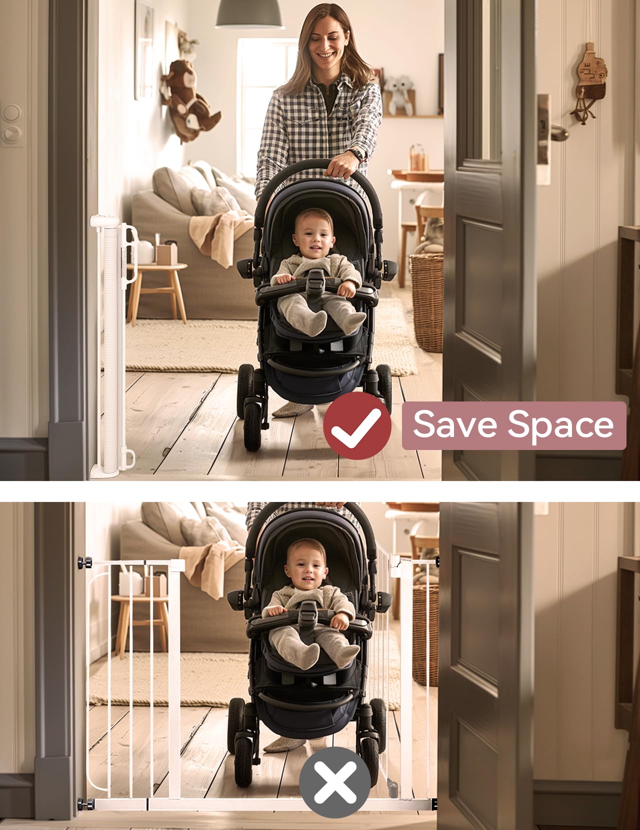 Momcozy retractable baby gate are suitable for all sizes of door widths compared to traditional baby gate , saving space and allowing more space to pass through.