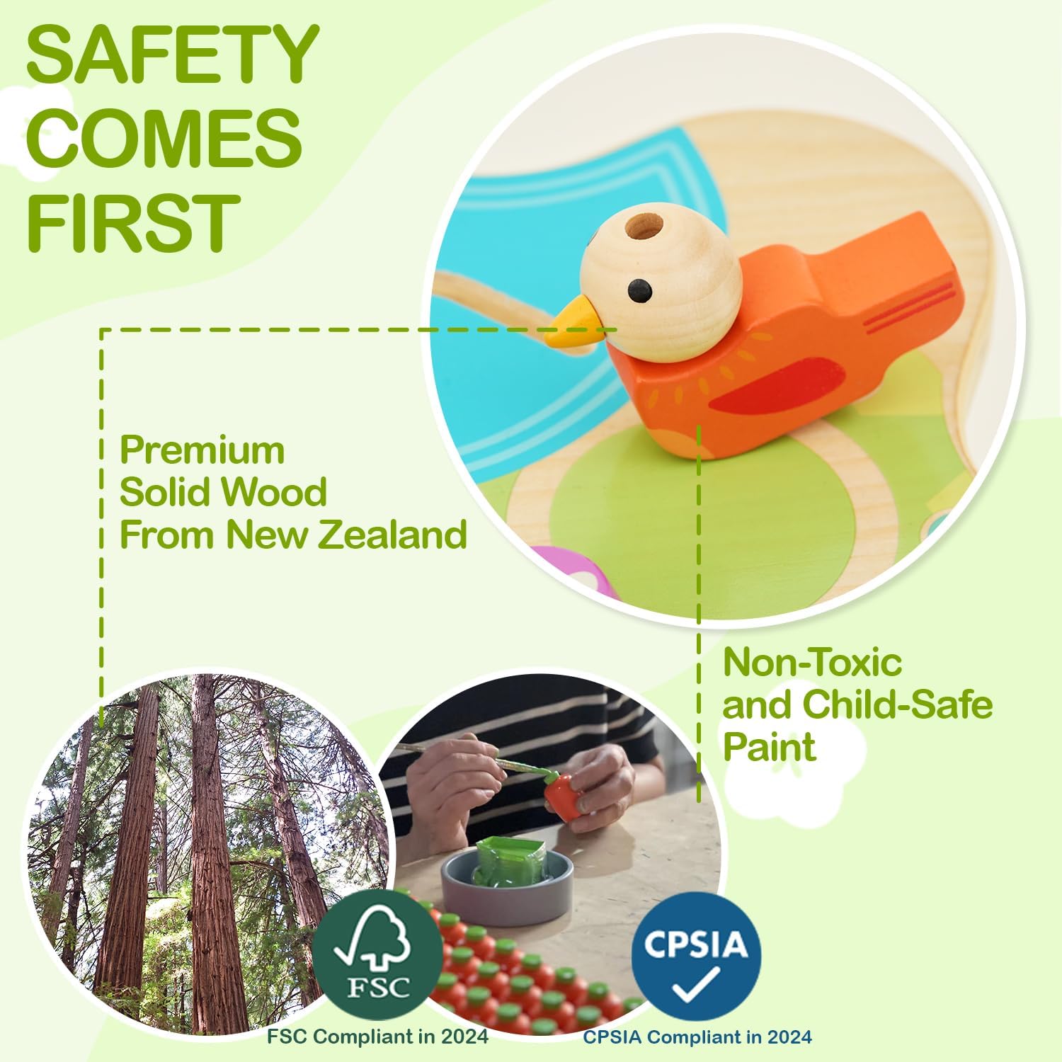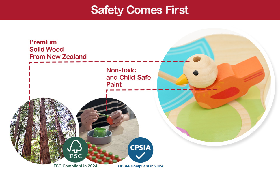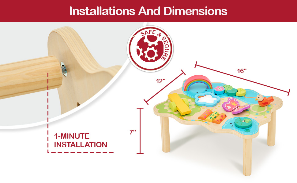 • Safety Comes First: Crafted from high-quality solid wood from New Zealand, this busy activity table is designed to provide a safe and durable play environment for toddlers. It has passed rigorous safety tests and received the Children's Product Certificate from a CPSC accredited laboratory, ensuring a safe play environment for little ones.