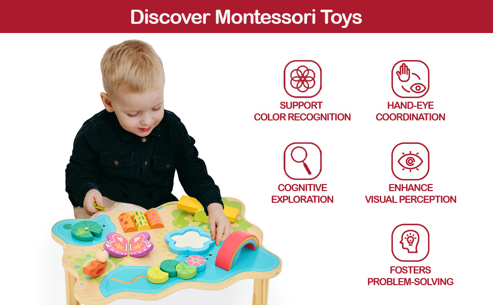 • Montessori-Inspired Learning: Following Montessori principles, this activity table encourages self-directed play and skill development. From sensory engagement to problem-solving, it promotes creativity, curiosity, and confidence, fostering essential early learning experiences for toddlers.
