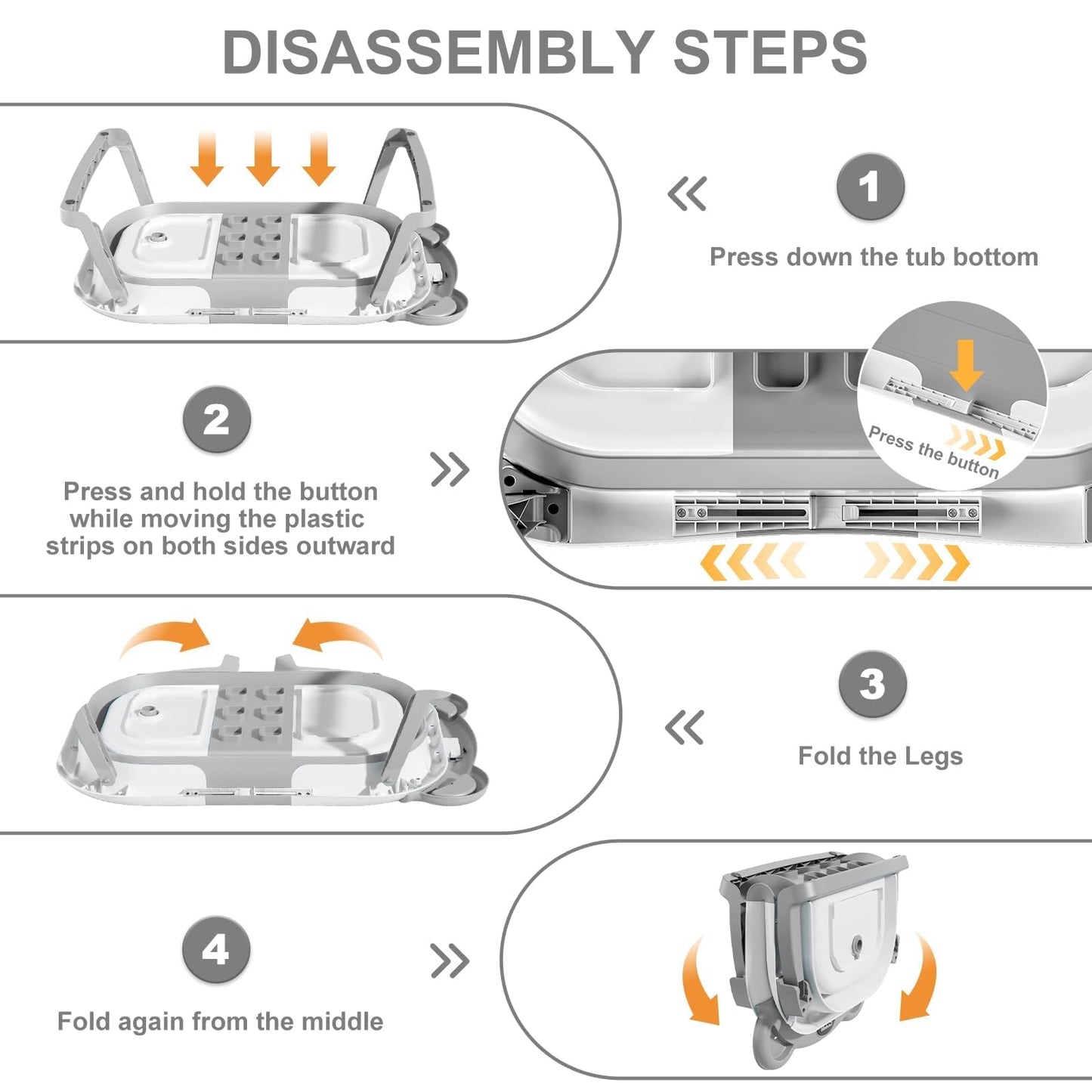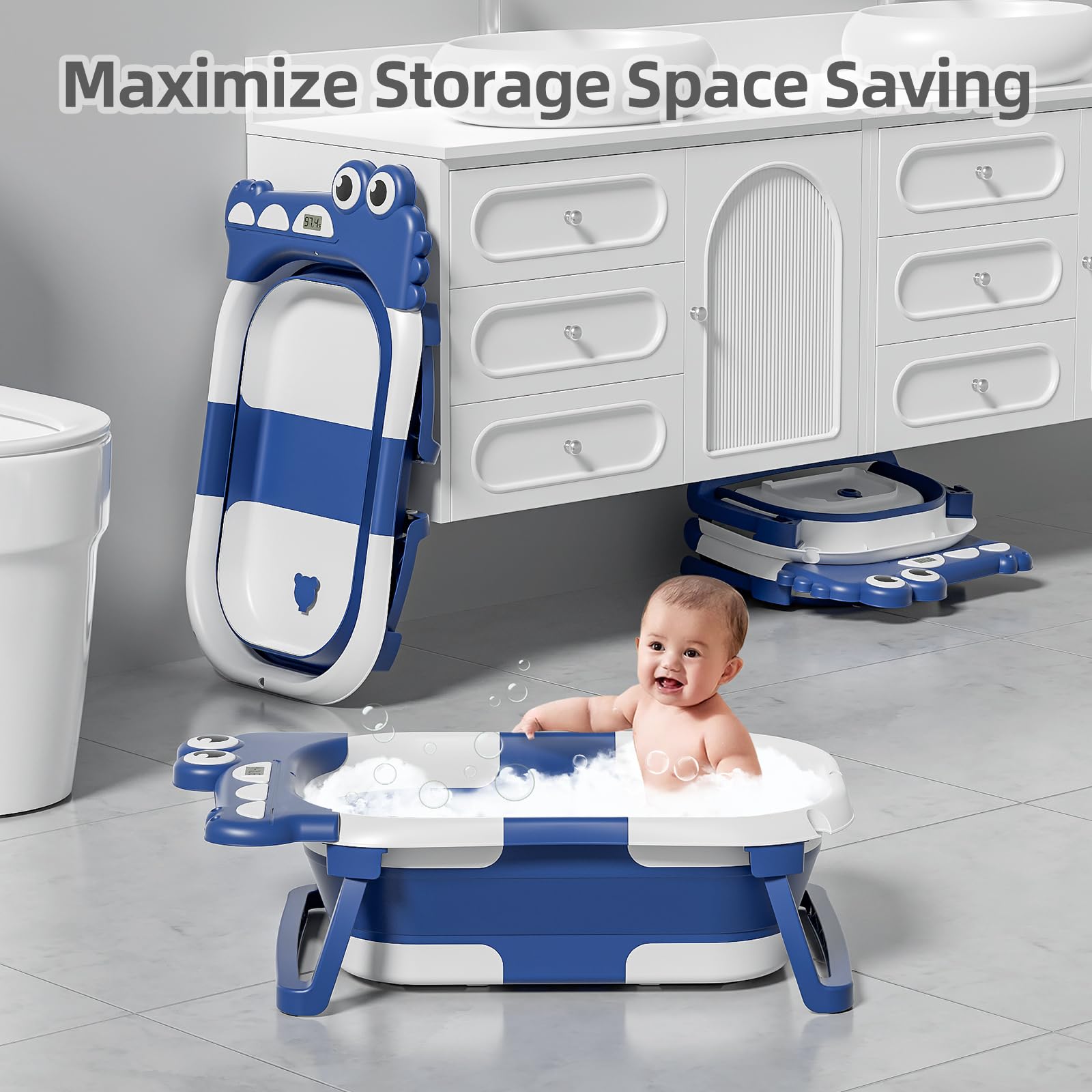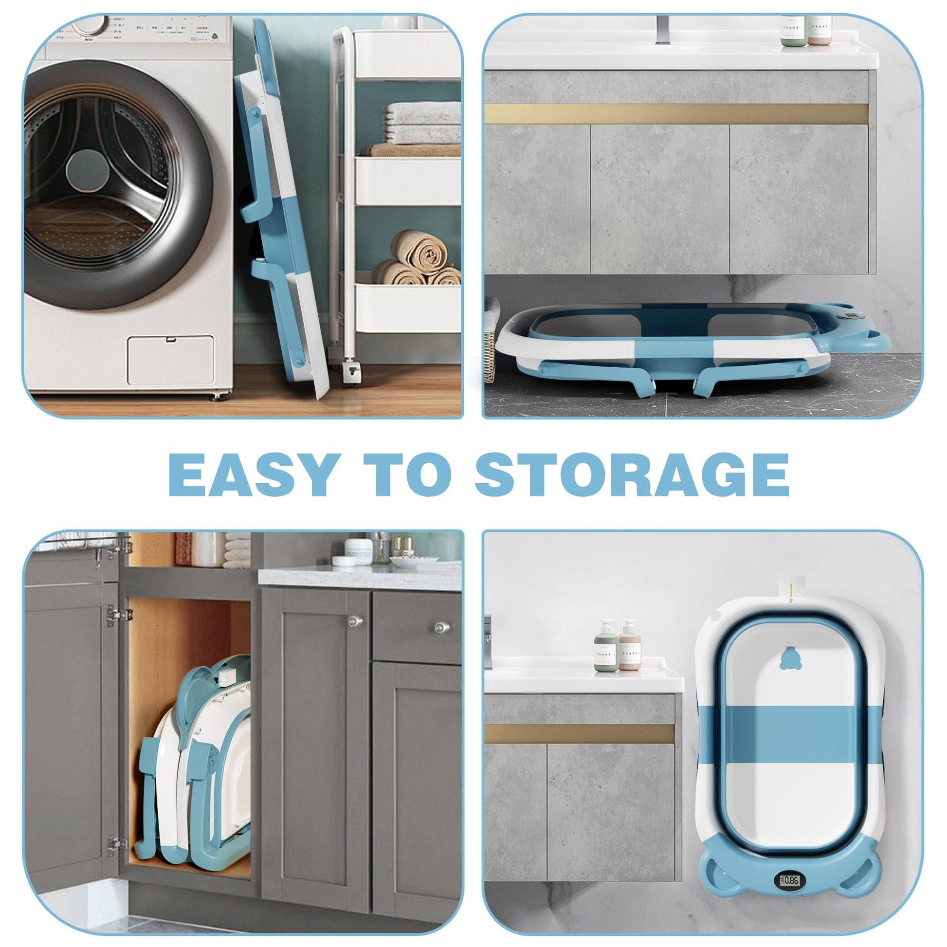 - 【Double-Fold Collapsible Design】Our upgraded baby bath tub can be effortlessly folded in just two steps to a thickness of under 4 inches. It even folds in half, enabling convenient storage in any corner, making it a space-saving solution.