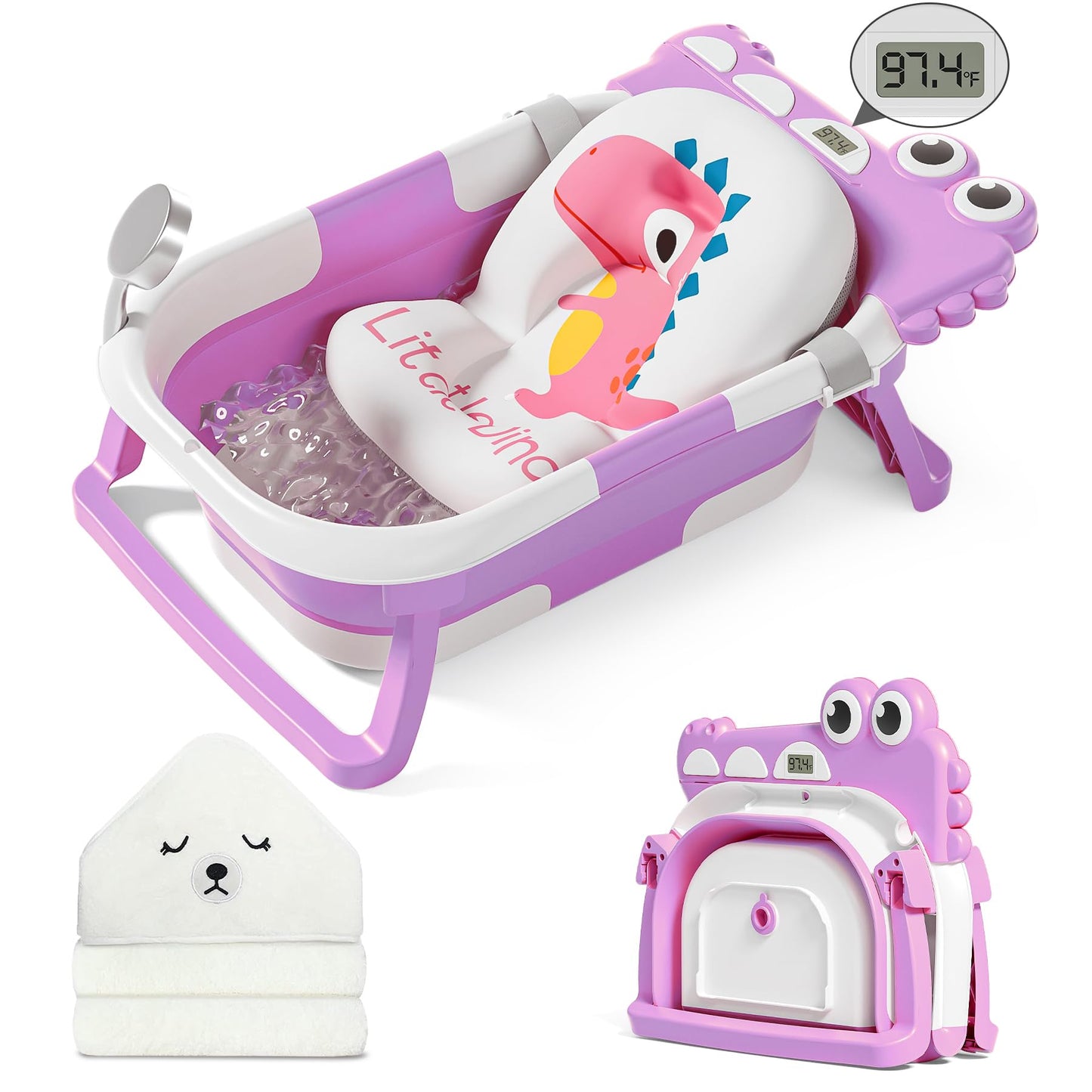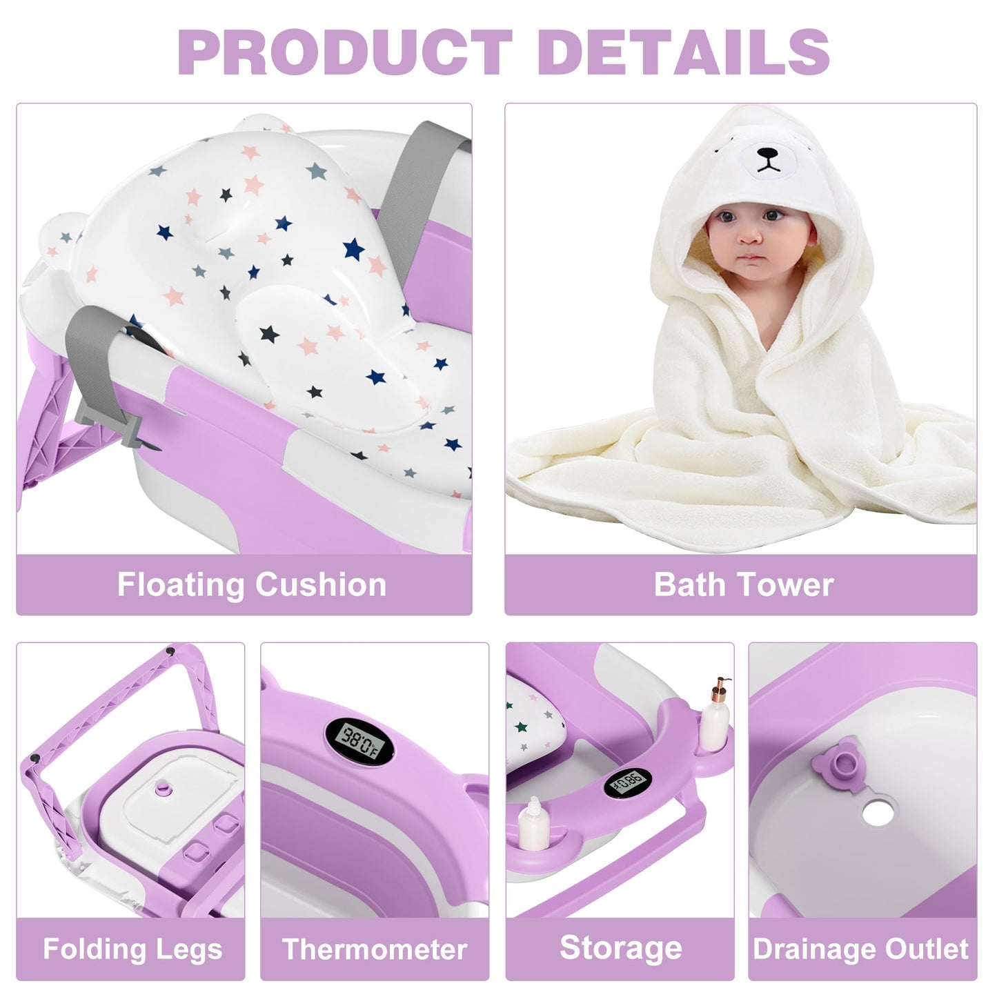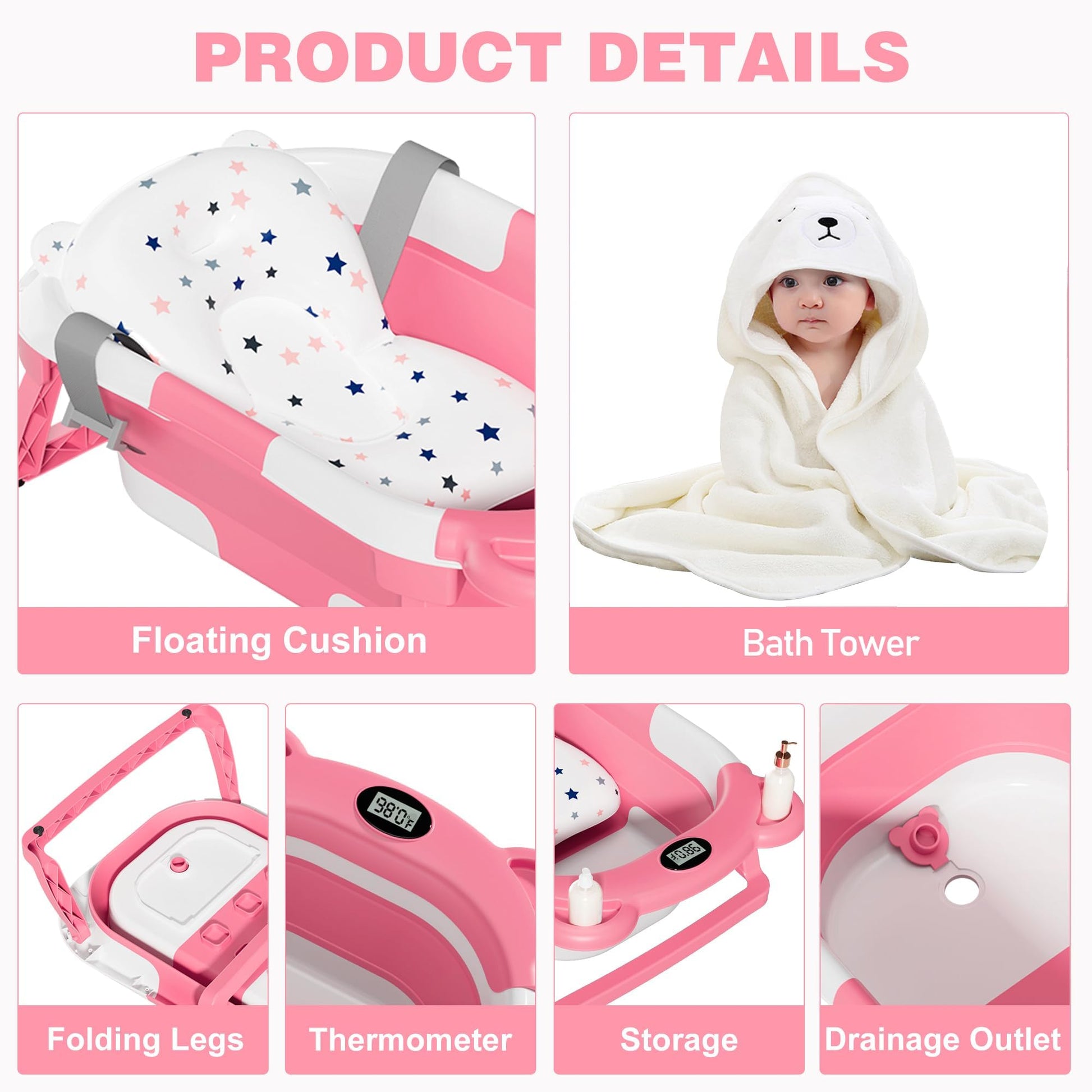 MoreFeel Collapsible Baby Bathtub for Newborn with Thermometer & 1 Hooded Towel & 1 Soft Floating Cushion,Portable Travel Bathtub with Drain Hole, Durable Foldable Baby Tubs for Infants to Toddler
