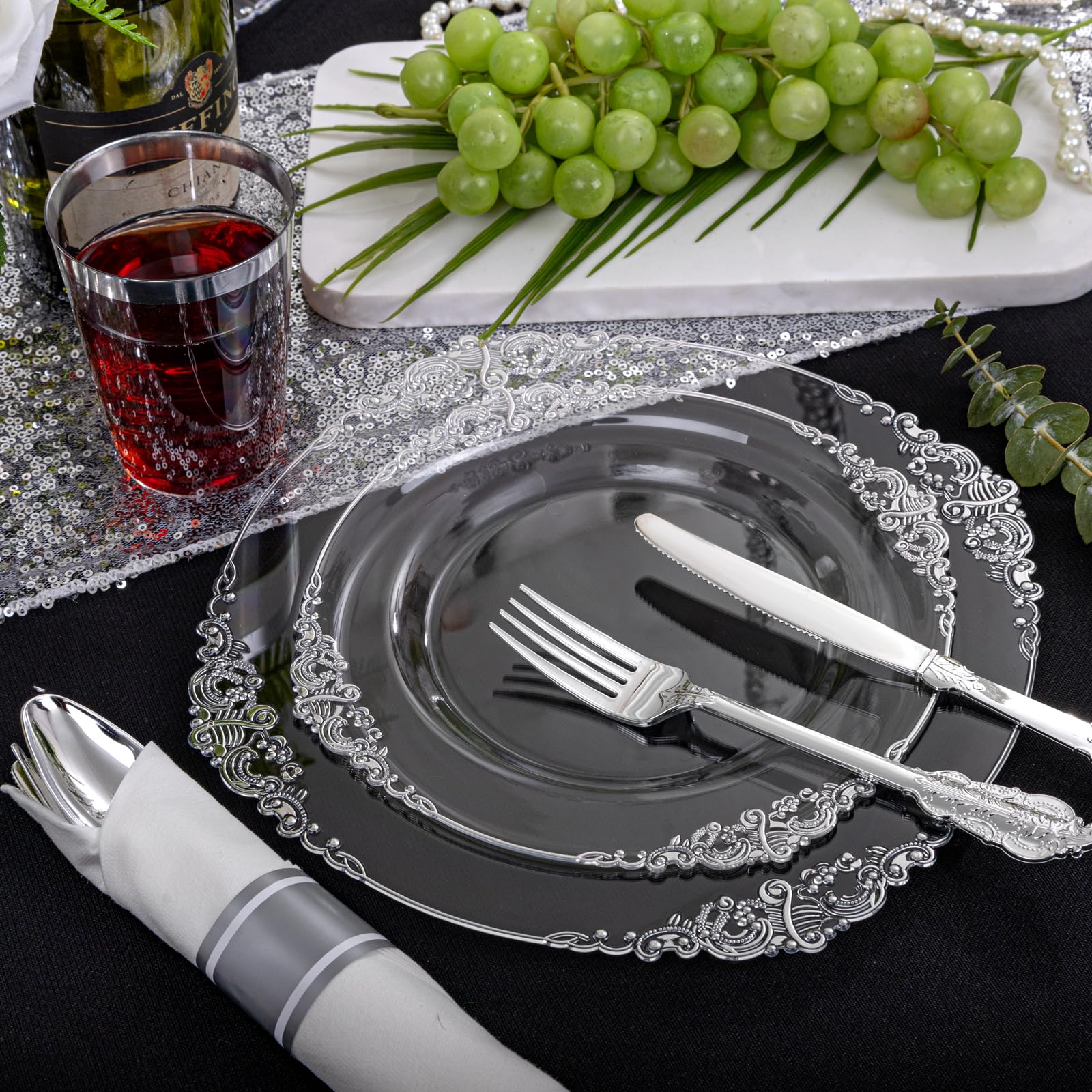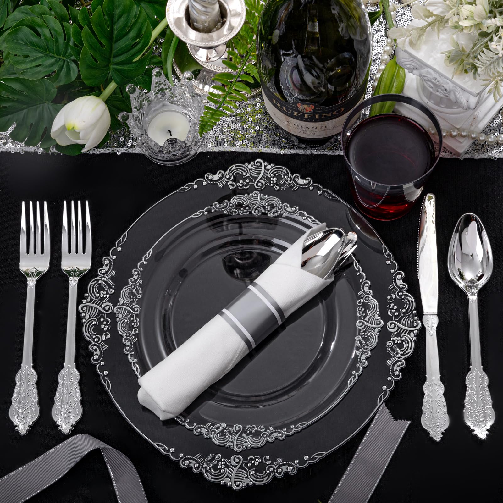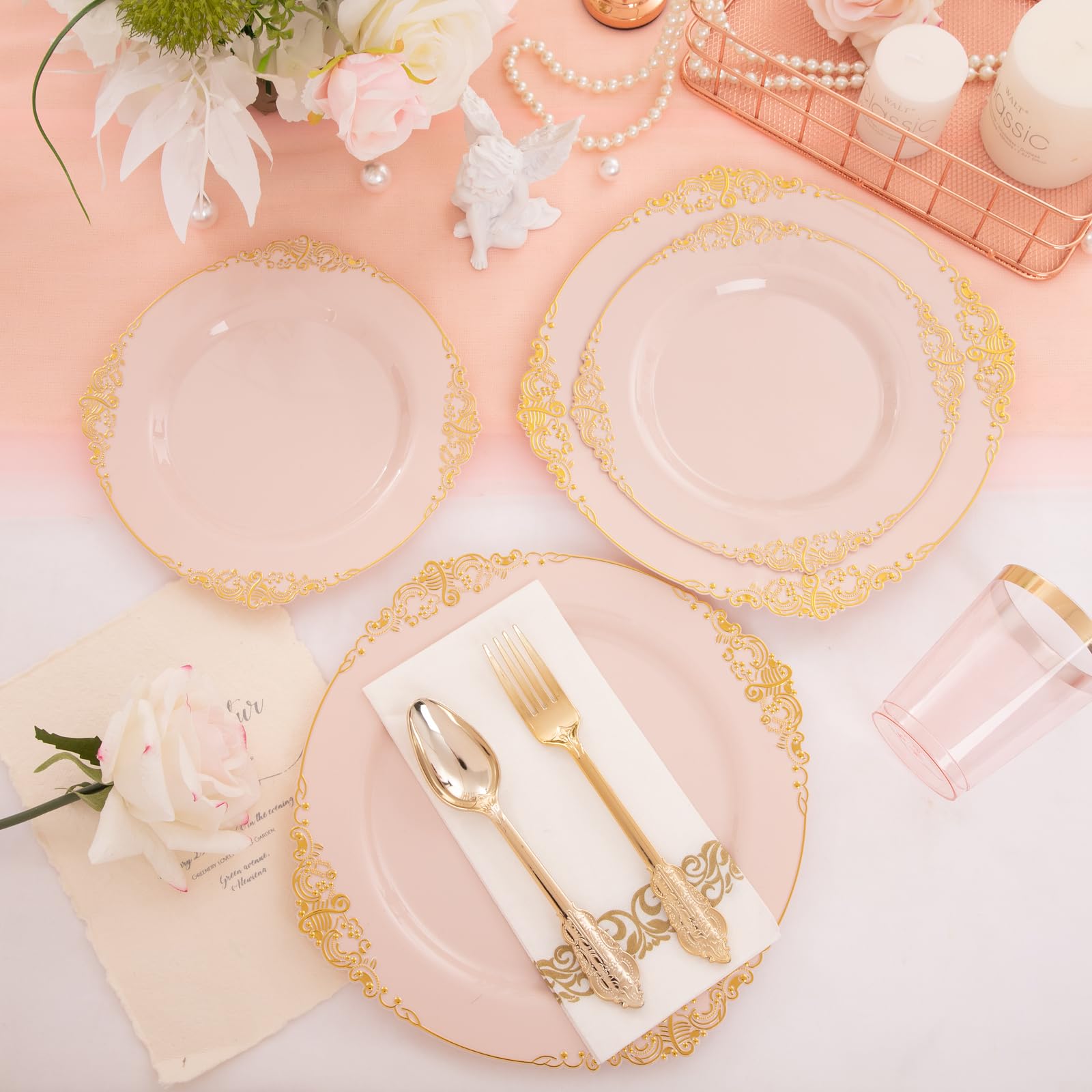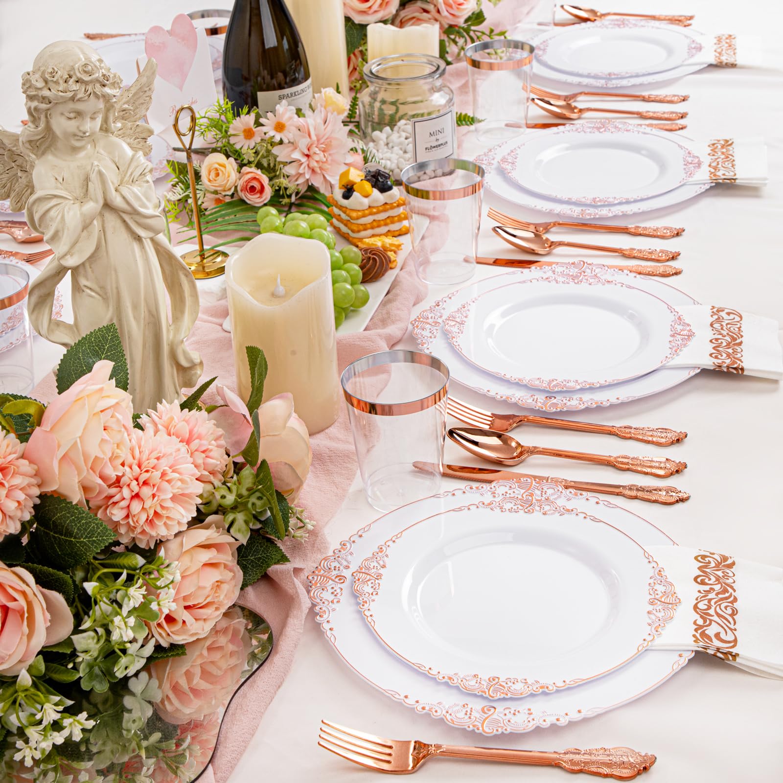 Morejoy 175PCS Rose Gold & Silver Plastic Dinnerware Set: 25 Plates, 25 Forks, 25 Knives, 25 Spoons, 25 Cups, 25 Napkins - Perfect for Wedding & Party