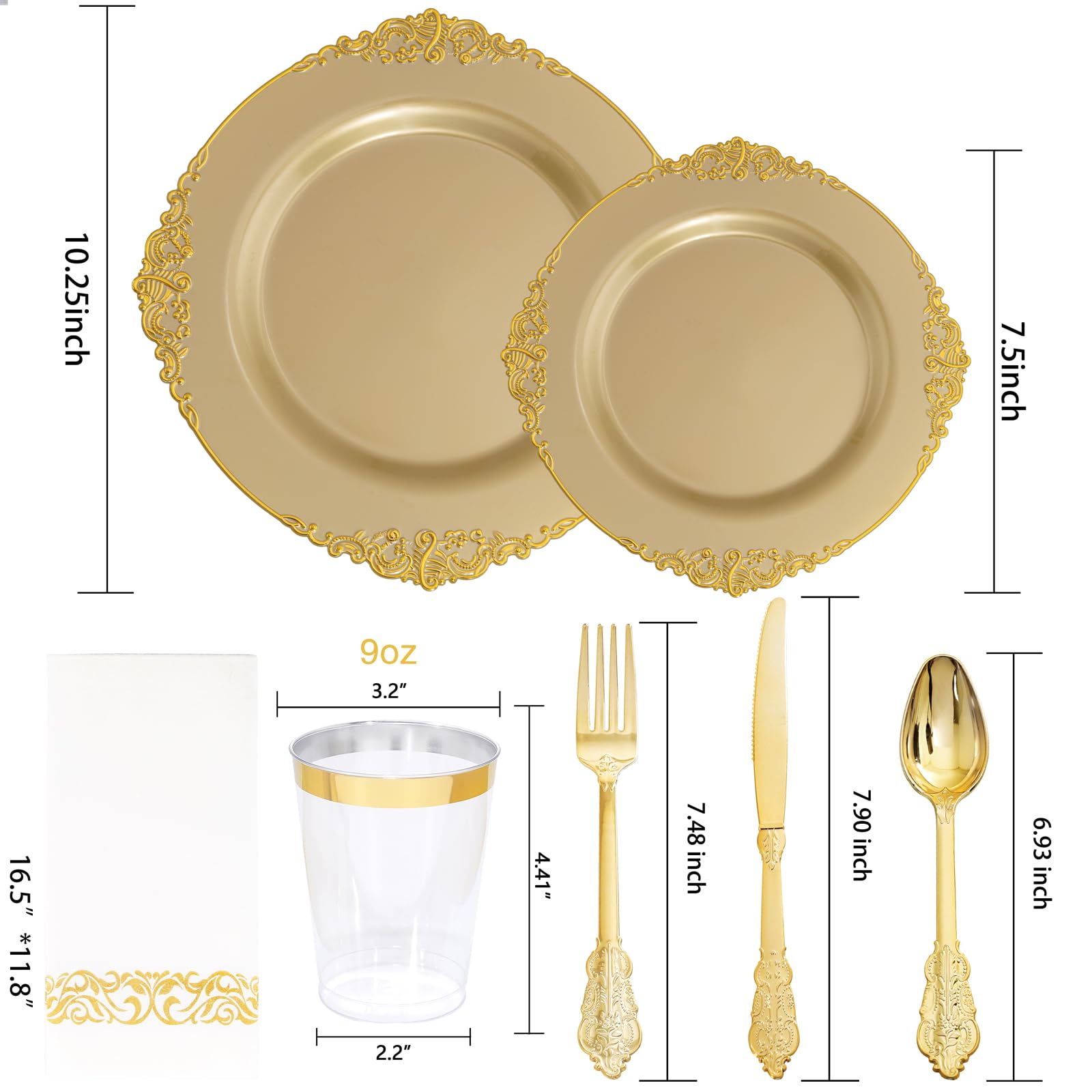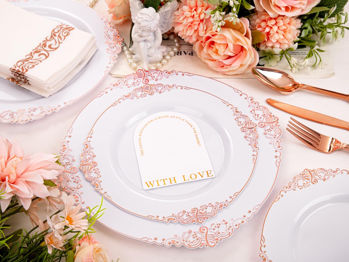 - Elegant Design - Rose gold plastic plates makes people feel elegant. These gold plastic plates are based on white plastic plates, with rose gold rim, showing nobility and elegance. The rose gold curve of the white plastic plates are gorgeous and smooth, allowing users to fall in love at first sight.