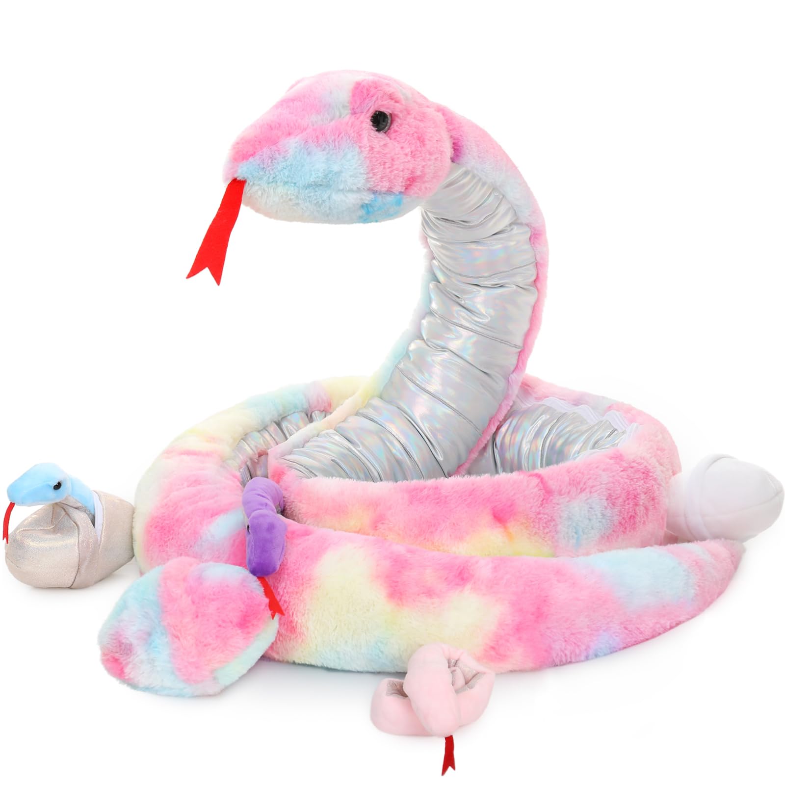 - Perfect Gifts: 120 inches, perfect for cuddling and snuggling. The large stuffed snake plush with babies is soft, fluffy, and colorful. It is a fun addition to your stuffed animal collection and will bring a smile to you. Perfect and coolest gift for Christmas, Halloween, Birthday Party, etc. By the way, it's a must-have for any snake lover or prankster