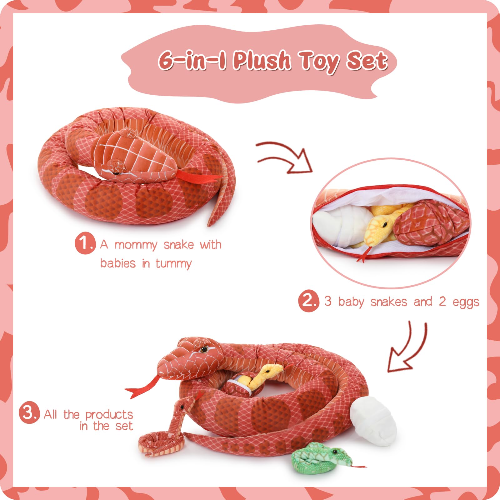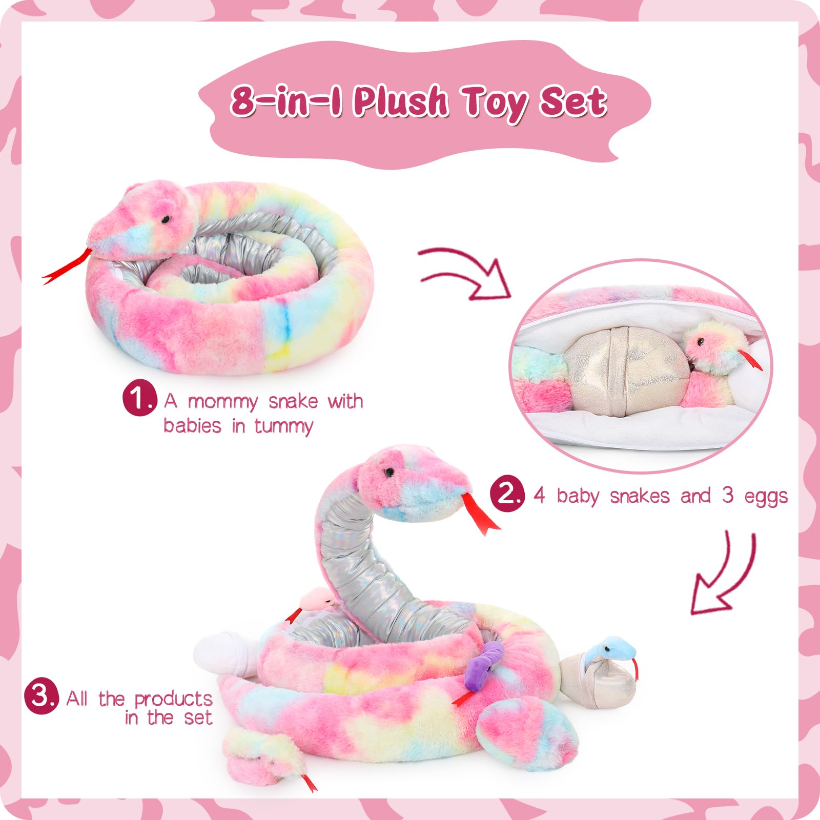 - Learn to Share: Unique stuffed snake with babies offers more opportunities to play with friends and family. 6-piece stuffed animals: Mommy stuffed snake and four different colored small snakes will help children learn to share with their friends and family and will make their relationship with them even closer