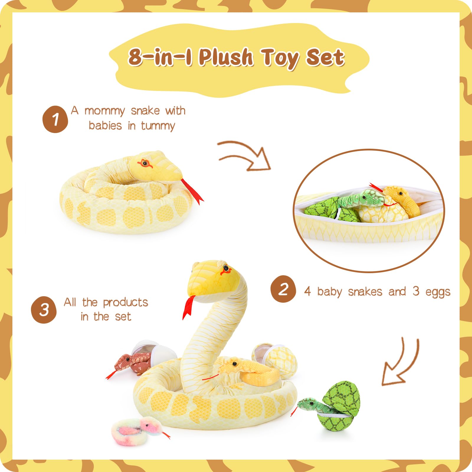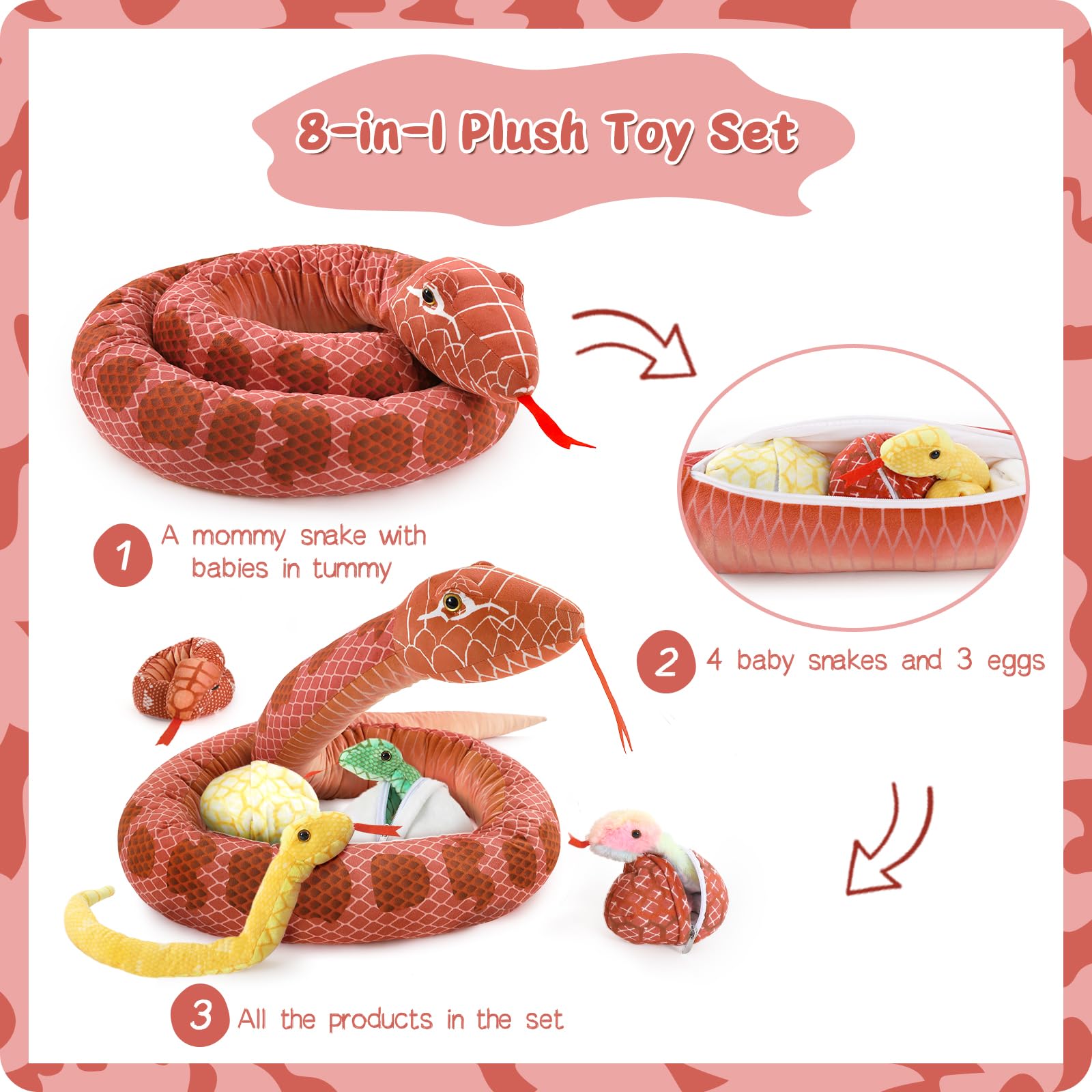 MorisMos Snake Stuffed Animals Plush Toy 120 Inch Giant Snake Plush with Babies Stuffed Snake Toys for Kids Plush Party Decorations Favors Prank Props, 4 Snake Babies, 3 Snake Eggs