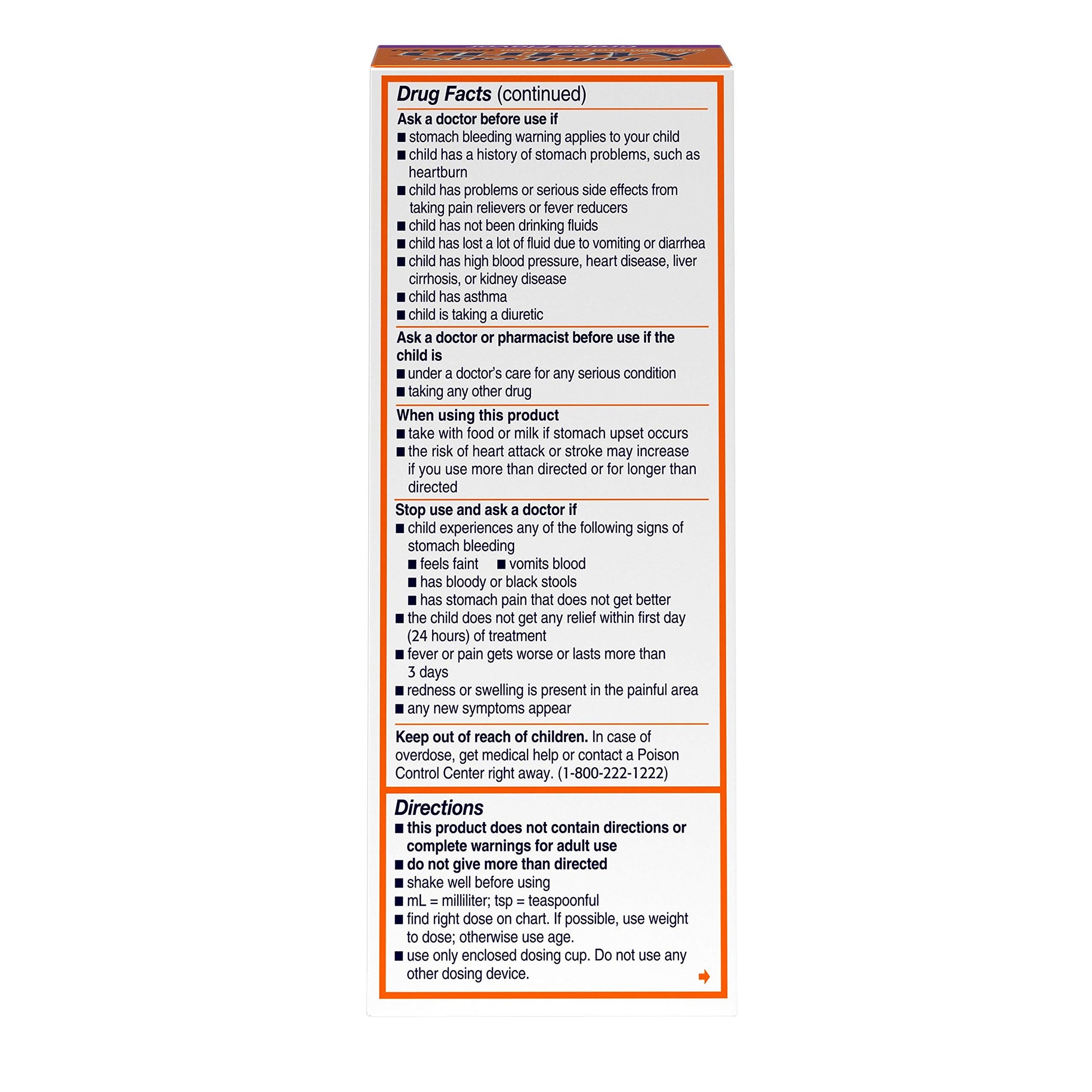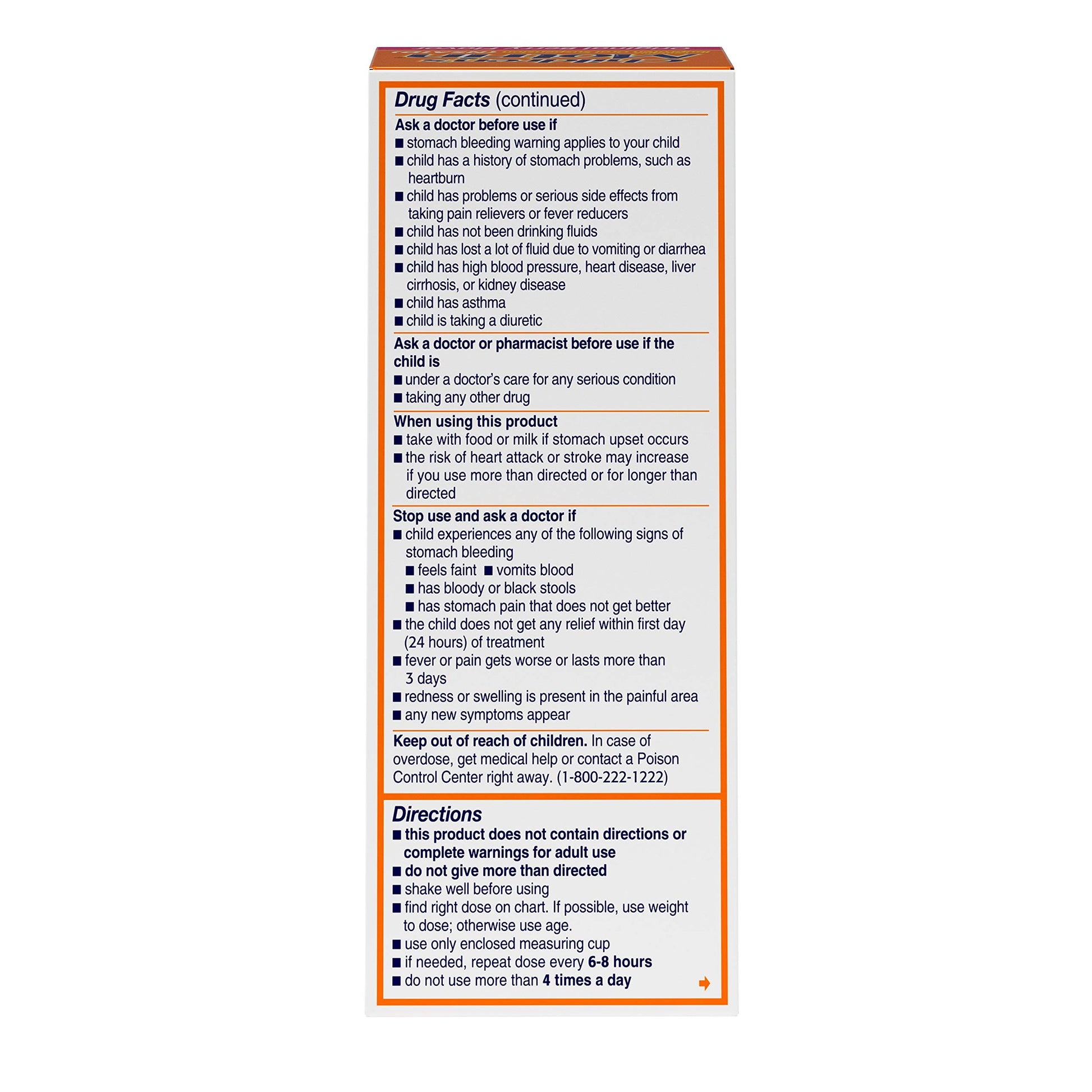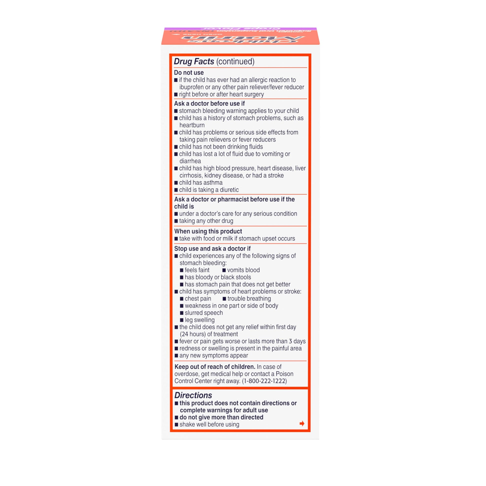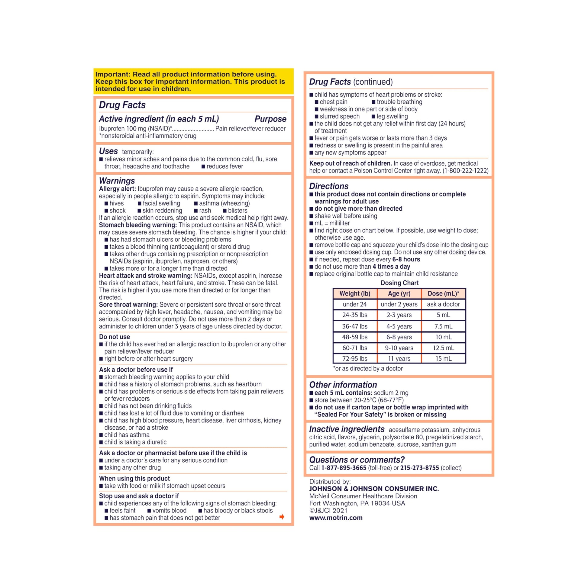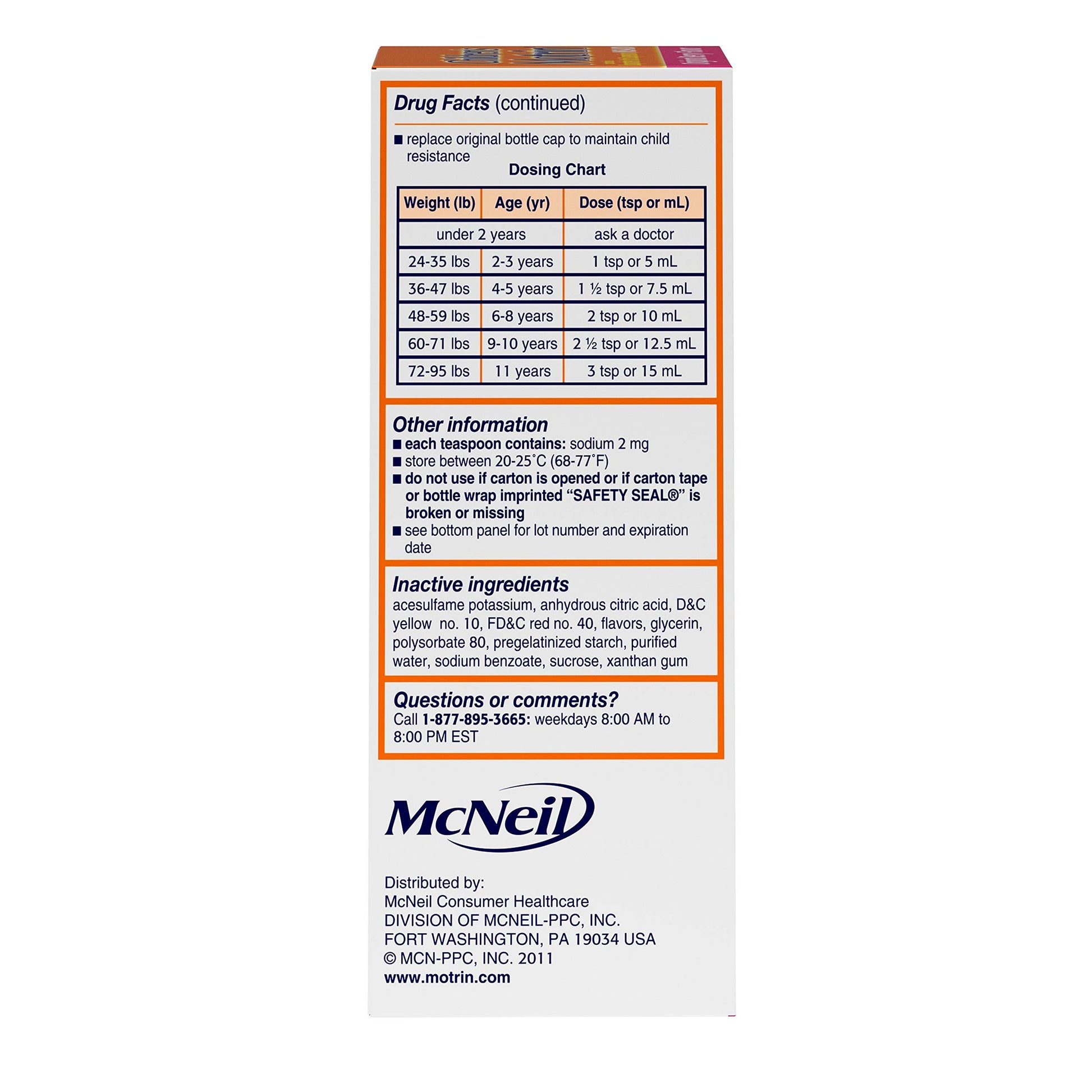 - 8-fluid ounces of Children's Motrin Oral Suspension Liquid Medicine with Ibuprofen in a dye-free berry flavor to help temporarily reduce fever and relieve pain due to the common cold & flu