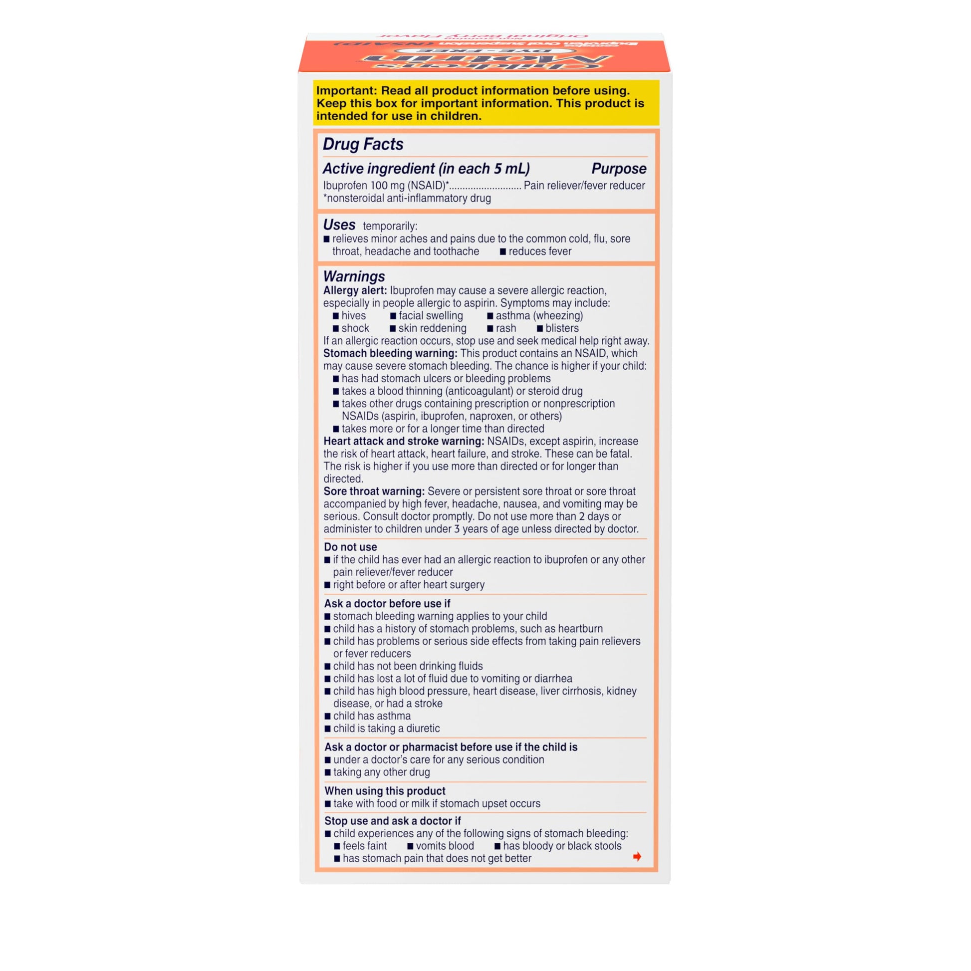 - This dye-free oral suspension medicine for kids contains 100mg per 5mL of ibuprofen, a known NSAID painreliever and fever-reducer to provide relief from pain due to the cold & flu