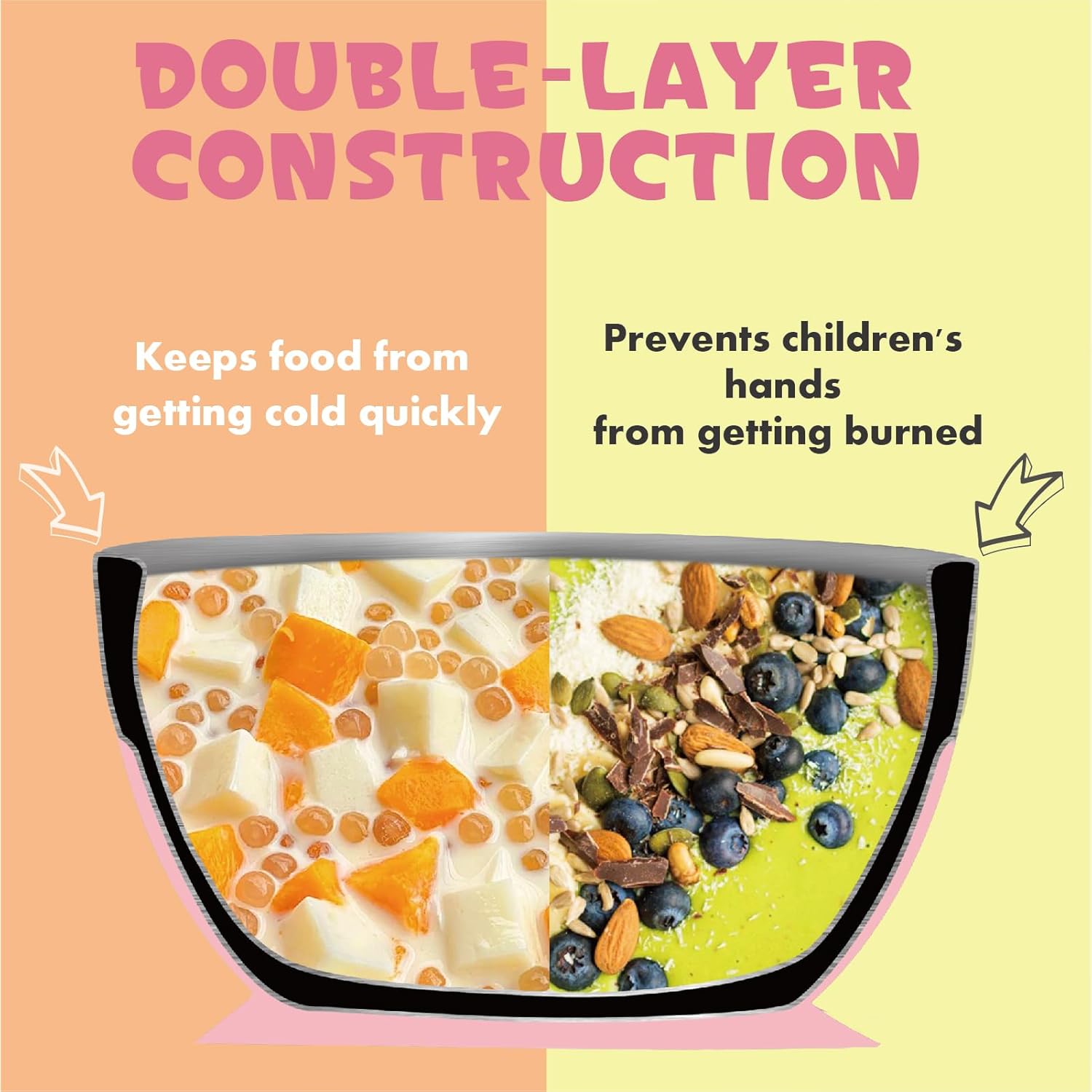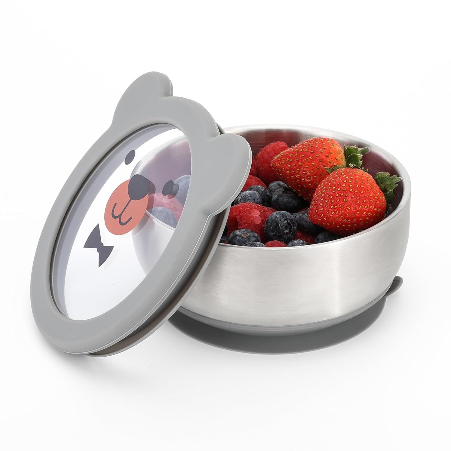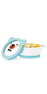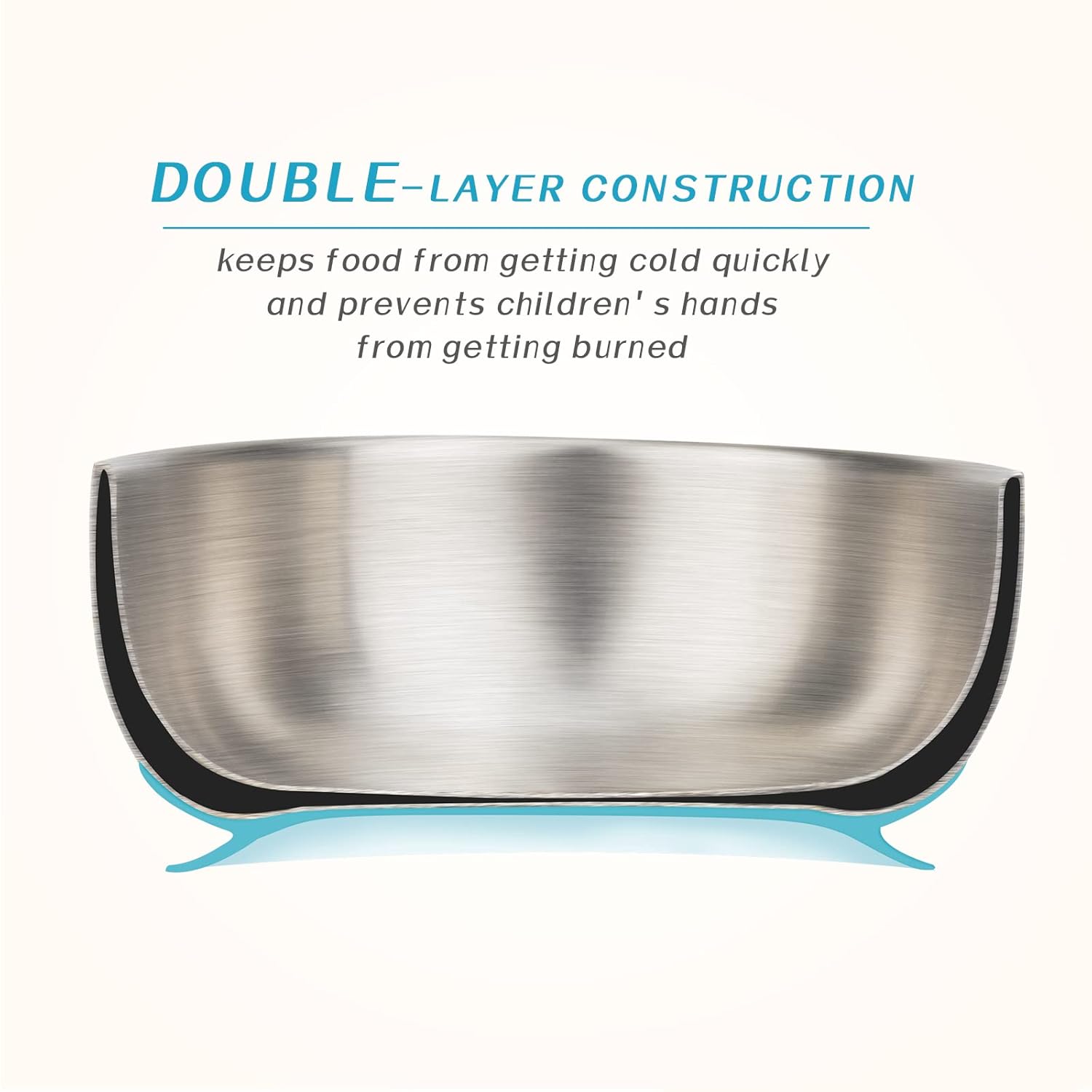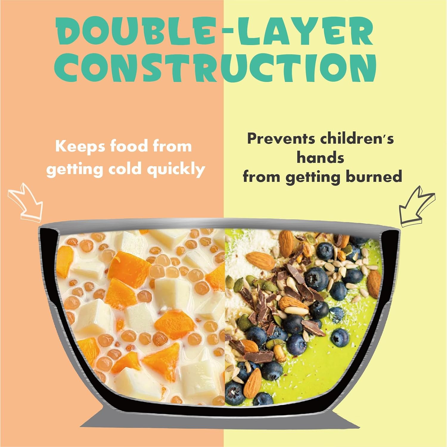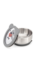 - This insulated baby bowl features a double-layer stainless steel construction that prevents heat transfer and keeps food warm while protecting the baby's hands from scalding. Comes with an airtight lid made of tempered glass and silicone to keep leftovers fresh and you can feed your baby on the go. Our silicone baby feeding bowls are made dishwasher-safe and freezer safe, so just put the silicone suction bowls into the dishwasher after the meal.