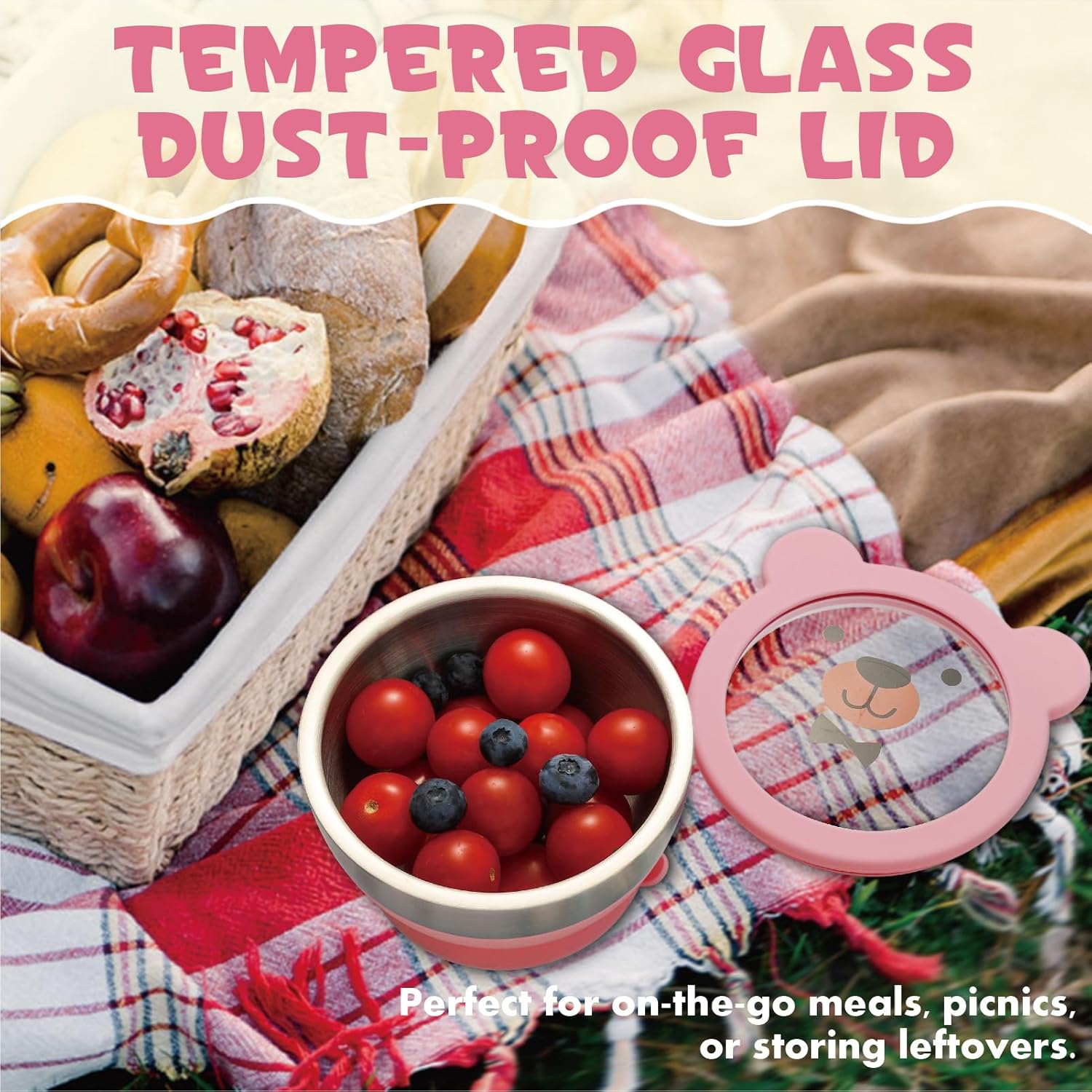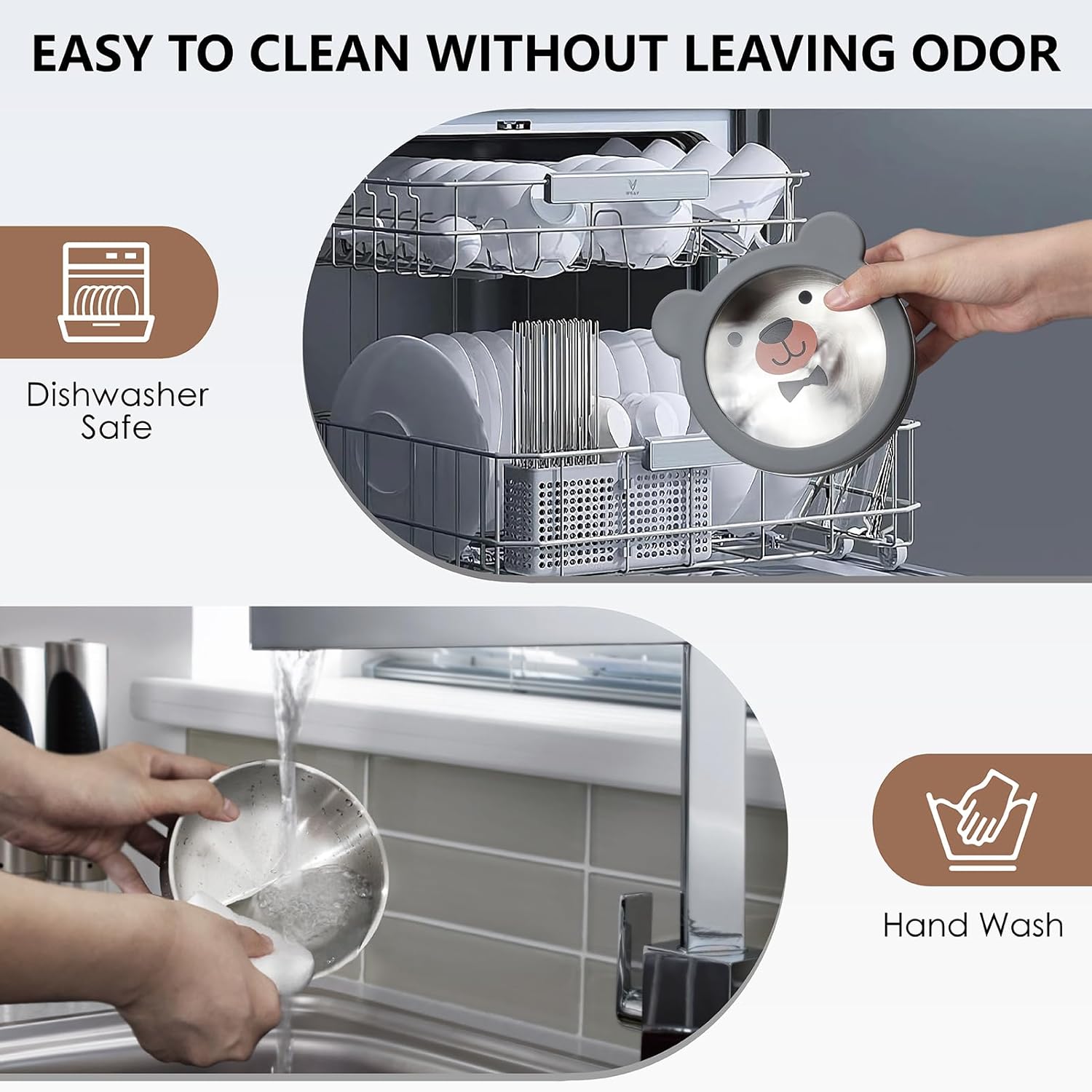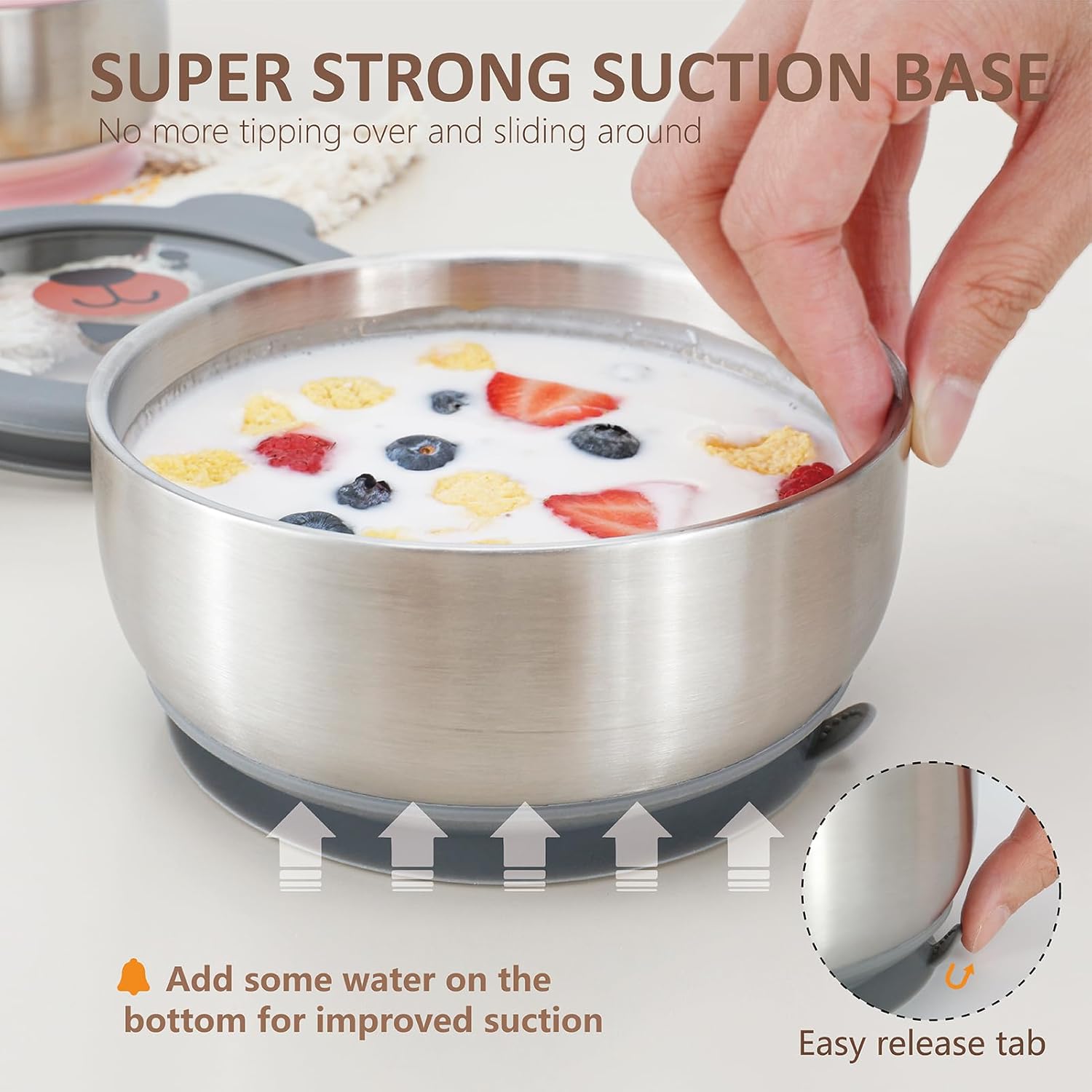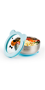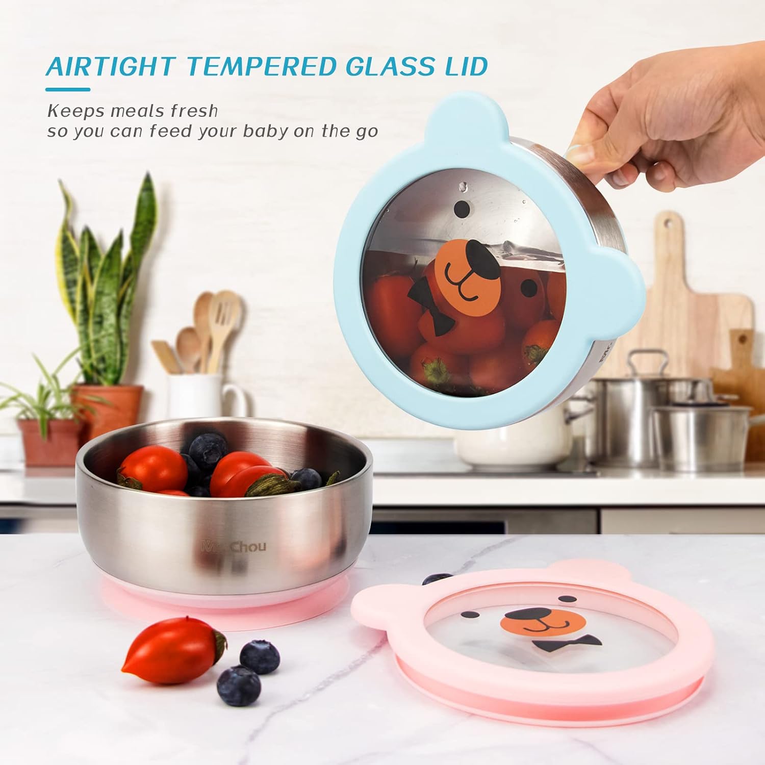 MR.CHOU 304 stainless steel bowls are double-walled to prevent heat transfer, keeping food warm while preventing baby's little hands from getting burned. The silicone bottom with strong suction holds the bowl firmly on any smooth surface, making mealtime mess-free. It also comes with an airtight lid, which can be used to cover leftover food for kids to keep it fresh, and say goodbye to waste.
