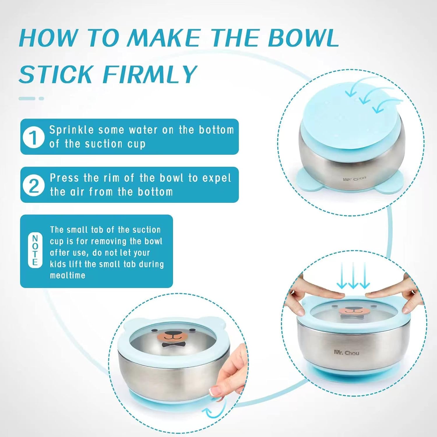 - Are you tired of picking up your child's bowl over and over? Still worried about your child making a mess on the floor while eating? Add this set of baby self-feeding bowls to your cart now and say goodbye to throwing, dumping, and tossing. MR.CHOU baby bowls are designed to provide parents with a convenient and hassle-free way for their children to practice self-feeding without worrying about mealtime messes.