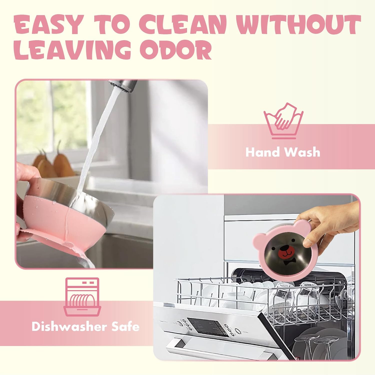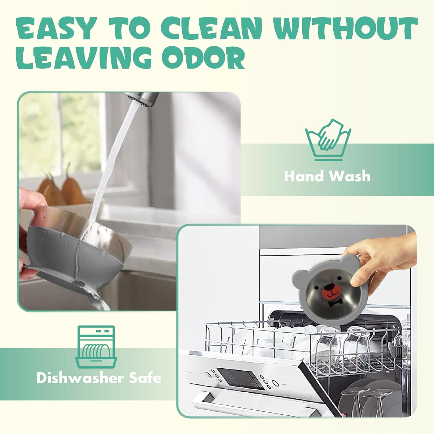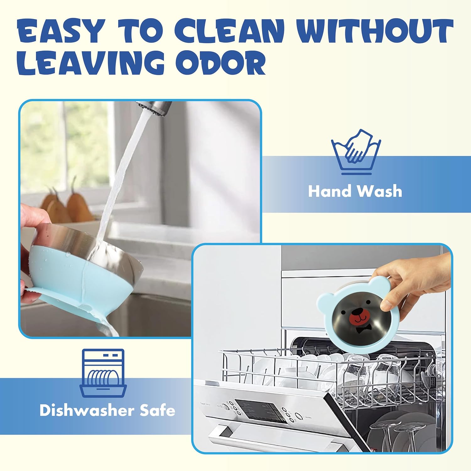 MR.CHOU suction bowls are made of high-quality stainless steel and silicone, which is durable, rustproof, and can be safely used in dishwashers. The one-piece design of the bowl and silicone bottom has no gap for dirt.