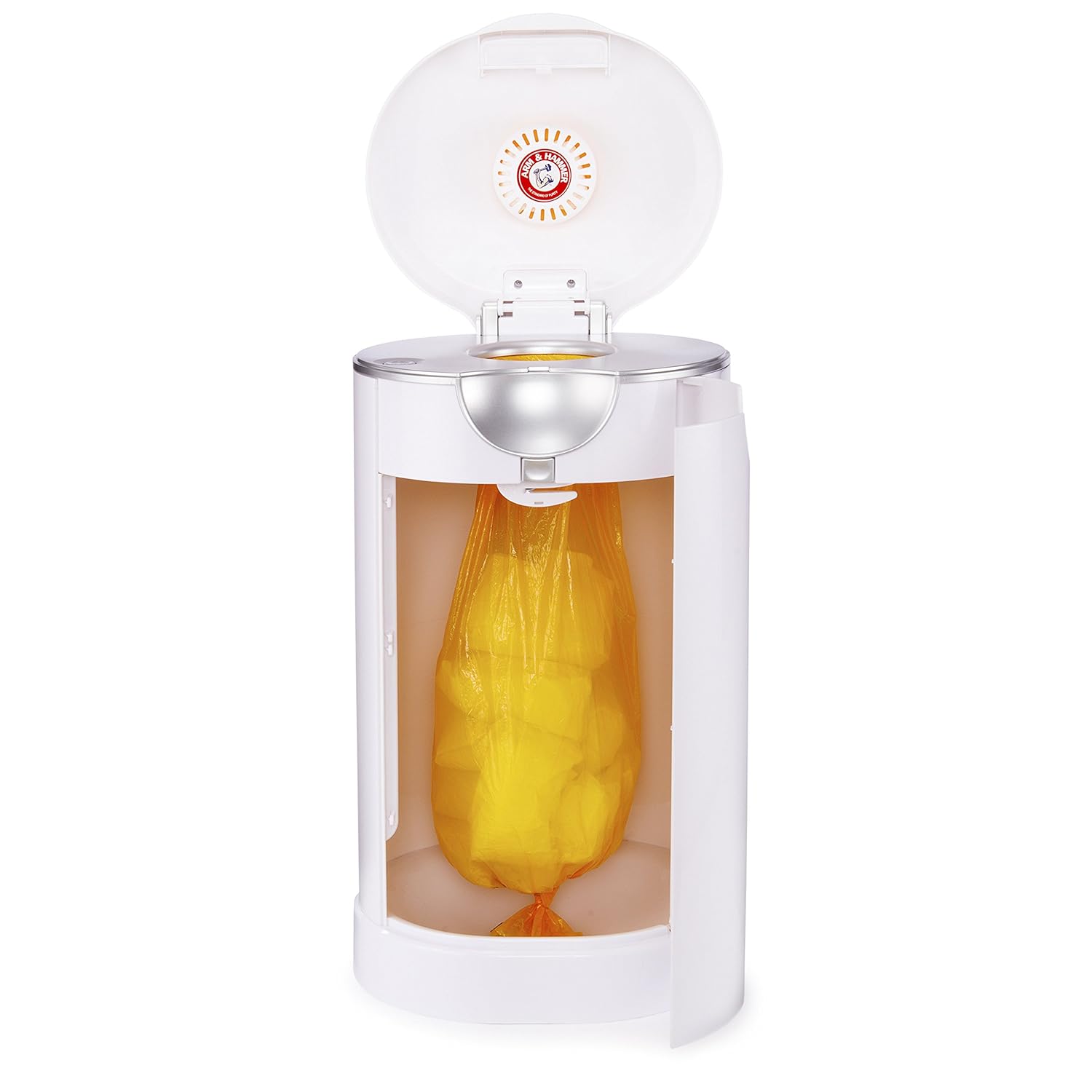 The Arm & Hammer Diaper Pail from Munchkin combines best-in-class odor control with a modern, sleek aesthetic that will look great in any nursery. Munchkin's PAIL™ Diaper Pail relies on the time-tested power of lavender-scented baking soda, which absorbs that dreaded dirty diaper smell. Each time you insert a diaper, the patented self-sealing lid locks the bag, keeping the odor sealed. Once you reopen, no longer will there be that familiar burst of foul air emitted by other pails. The disposal refill rings and bags are a cinch to snap into place, while the side door allows for quick and convenient removal. The vented, lavender-scented baking soda puck continuously absorbs and eliminates odors even when your diaper pail is not in use. Additional refills are sold separately. For every diaper pail sold, Munchkin will plant a tree to help make our environment a better place to live.