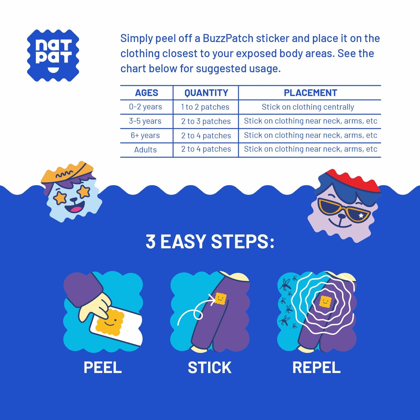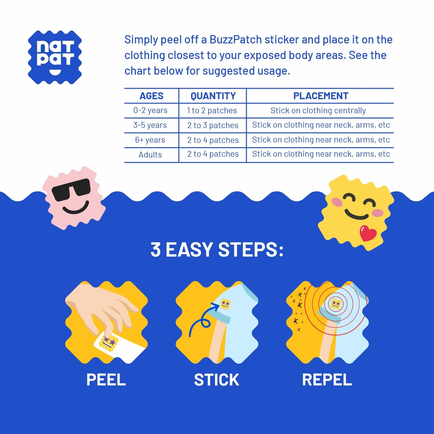 - MEDICAL GRADE ADHESIVE PATCHES – Made from non-woven, medical-grade fabric, NATPAT BuzzPatch Mosquito Patches are durable, water-resistant, and designed to stay in place during all kinds of activities. With a pleasant scent and gentle ingredients, these family-friendly patches offer dependable protection for both kids and adults.
