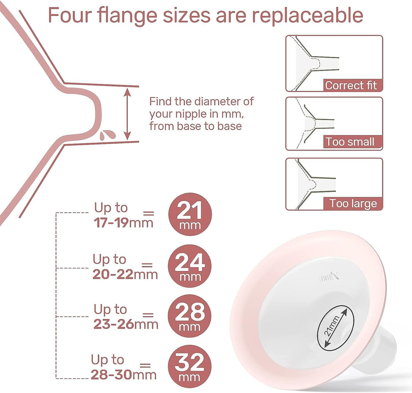 Our breast pump box includes flanges in four sizes(21/24/28/32mm), two of each.
