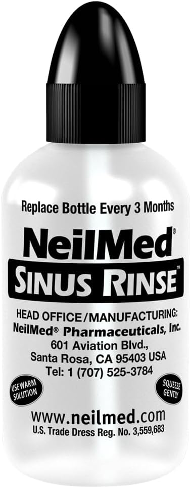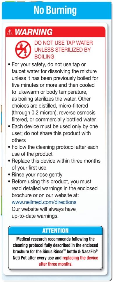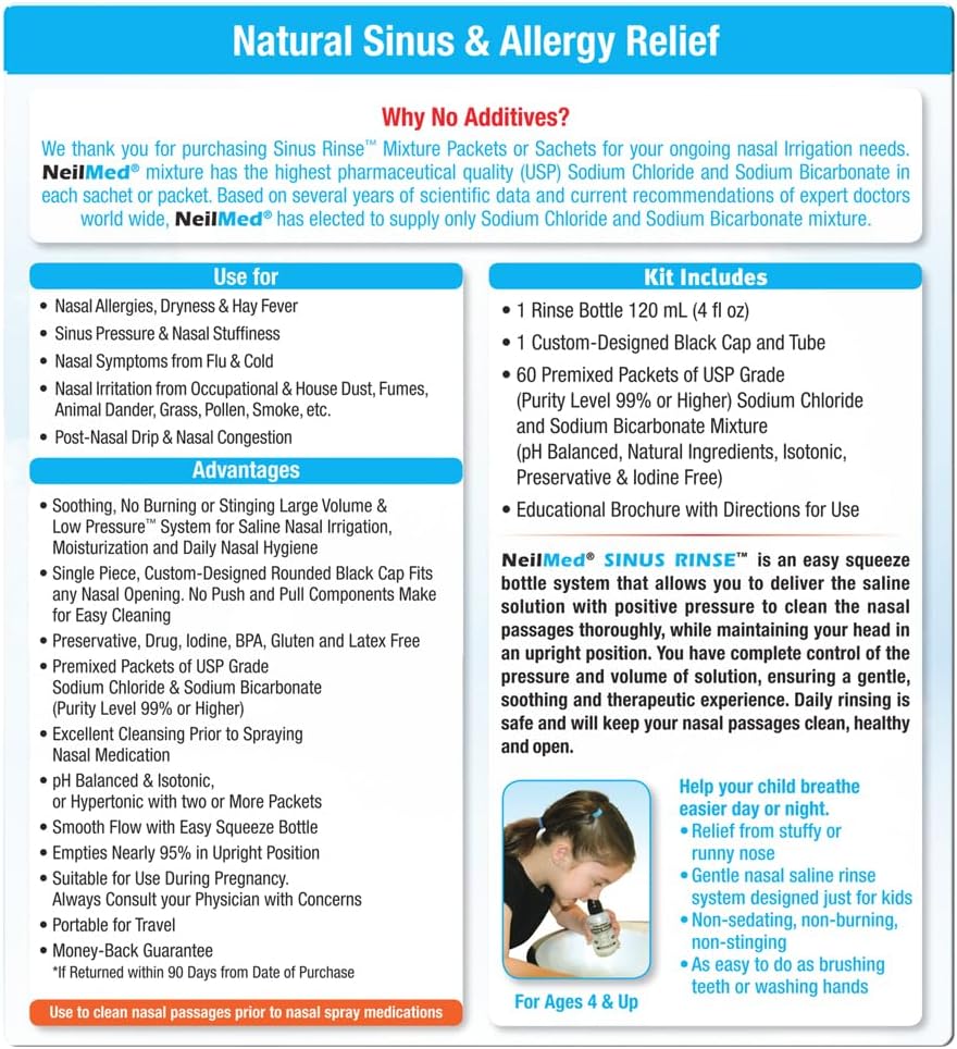 Sinus Rinse¿ Pediatric Kit: 1 Rinse Bottle 4 oz, 1 Custom Designed cap, 1 Tube, 50 pediatric premixed packets of pH balanced sodium Chloride & Sodium Bicarbonate Mixture (USP Grade, Natural Ingredients, Isotonic, Preservative Free & Iodine Free), 1 Full Color Illustrated Educational Brochure. Sinus Rinse¿ Pediatric nasal Kit comes with 50 packets of easy to dispense USP Grade, Preservative Free Sodium Chloride and Sodium Bicarbonate mixture (pH balanced & isotonic for maximum comfort). Easy-squeeze bottle comes with volume marker. Each packet contains precisely measured mixture to mix with 4 oz. (120 mL) of lukewarm water, taking the guesswork out of preparing this solution. The kit also contains step by step directions for use and extensive educational material that is simple to understand. If you suffer from allergies or sinus symptoms, Sinus Rinse¿ helps alleviate nasal allergies, flu & cold conditions, post nasal drip congestion as well as nasal dryness and irritation caused by occupational dust, fumes, animal dander, grass, pollen, smoke, & common house dust. Sinus Rinse¿ is a preservative free, iodine & latex free product. With it's patented pre-mixed packet formula, available as Isotonic or Hypertonic, each rinse offers the advantage of a volume, therapeutic nasal irrigation while moisturizing your entire nasal passages.Please clean with soap & water and let air dry.