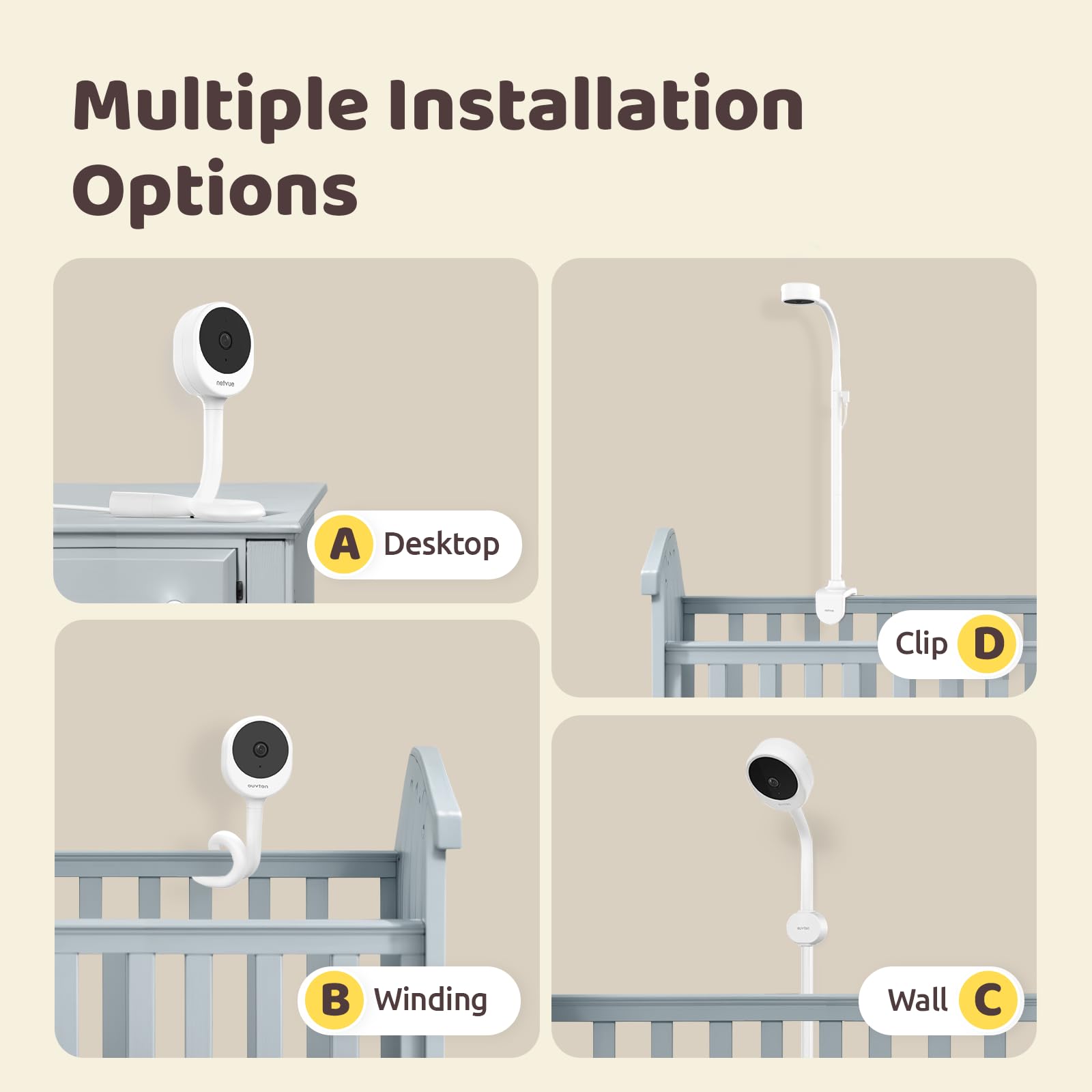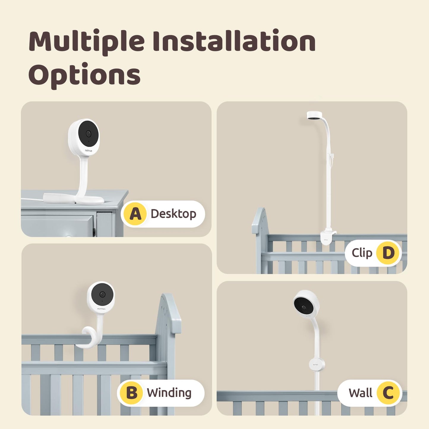 - 【Unique Stand Set-Fits All Baby Cribs!】Our baby monitor's unique stand fits all types of cribs, from cloth to square, round, and more. You can choose to mount it on the wall, clip it in place, set it on your desktop, or wind it around. This ensures that you always have the perfect view, regardless of your crib setup