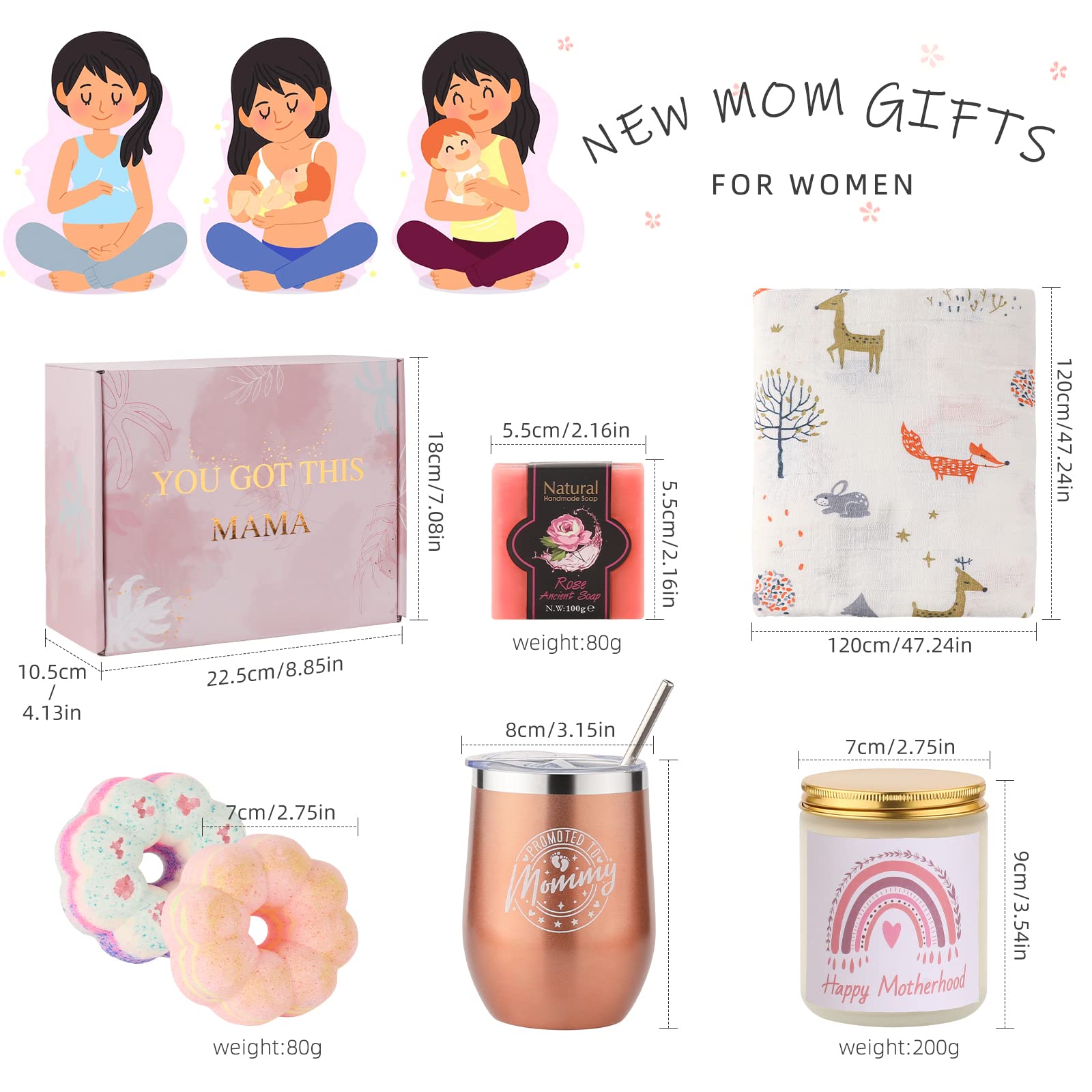 - New Mom Gifts for women -Do you want to encourage an overtired new mom to kick back, relax, and take time to rejuvenate? This spa set includes all the new mom essentials:1*mommy tumbler with straw and cleaning brush,1*muslin swaddle blanket,1*rose essential oil soap,2*bath balls,1*candle,1*greeting card.