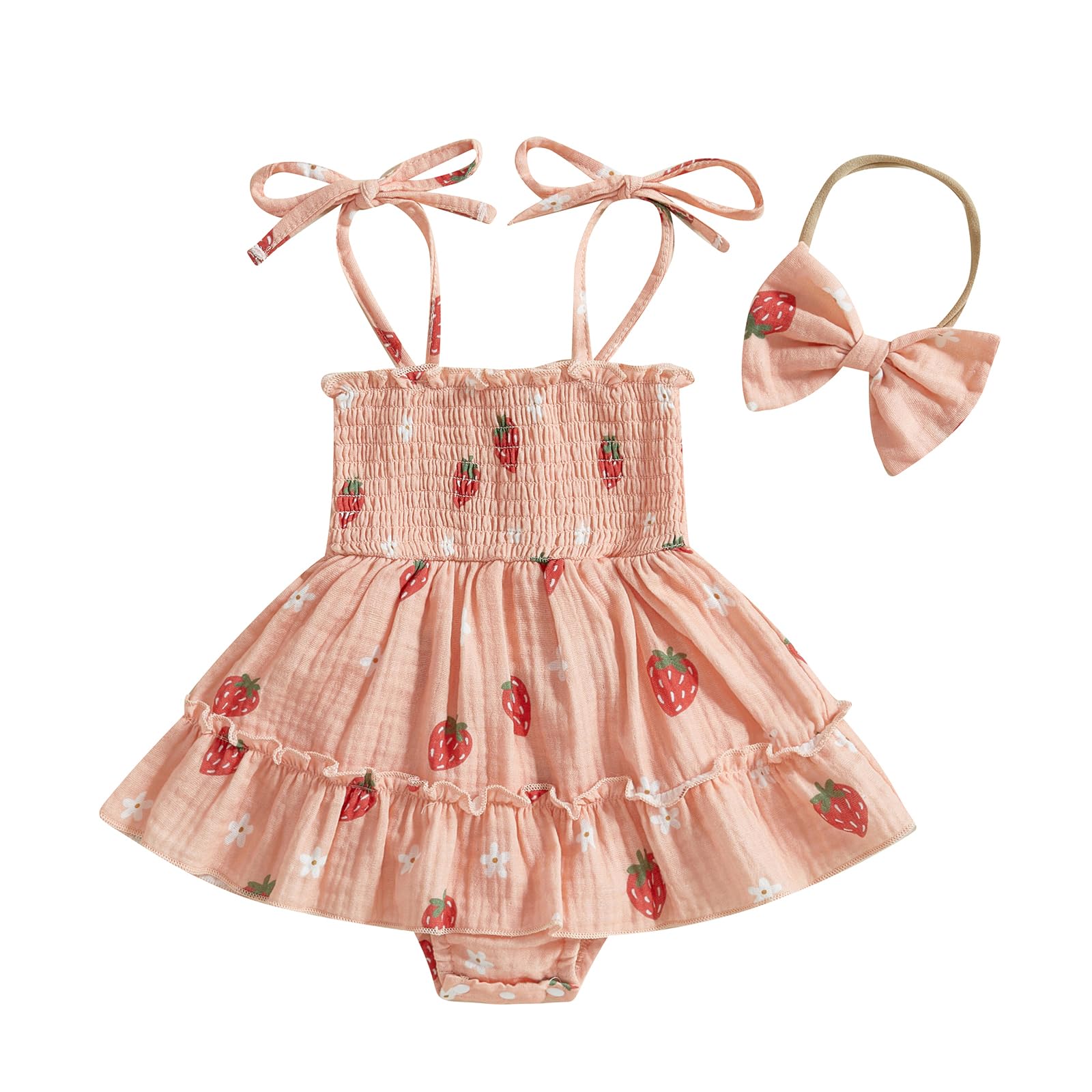 Newborn Baby Girl Romper Dress Sleeveless Tie Up Strap Smocked Strawberry Floral Print Bodysuit Summer Outfit Cotton Clothes