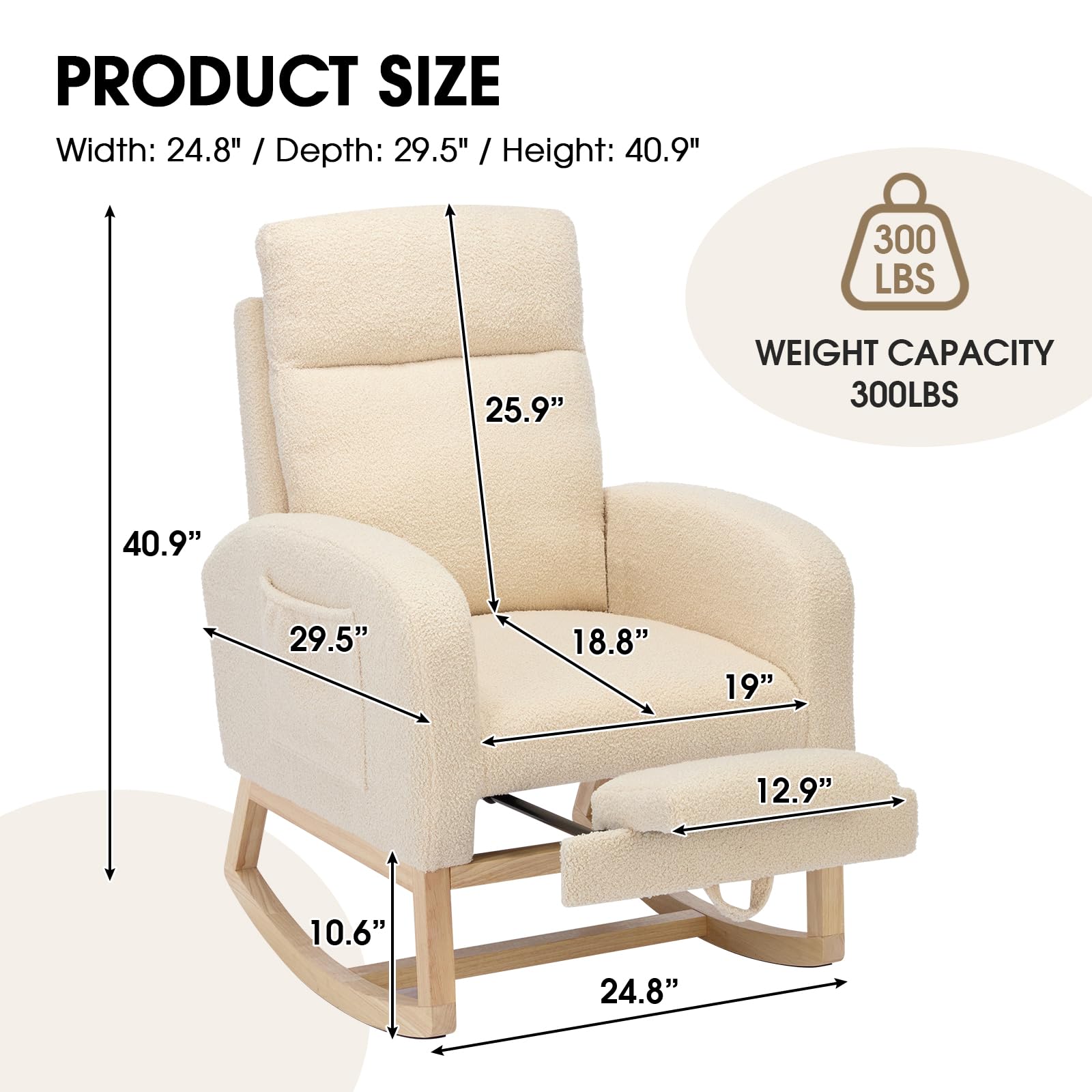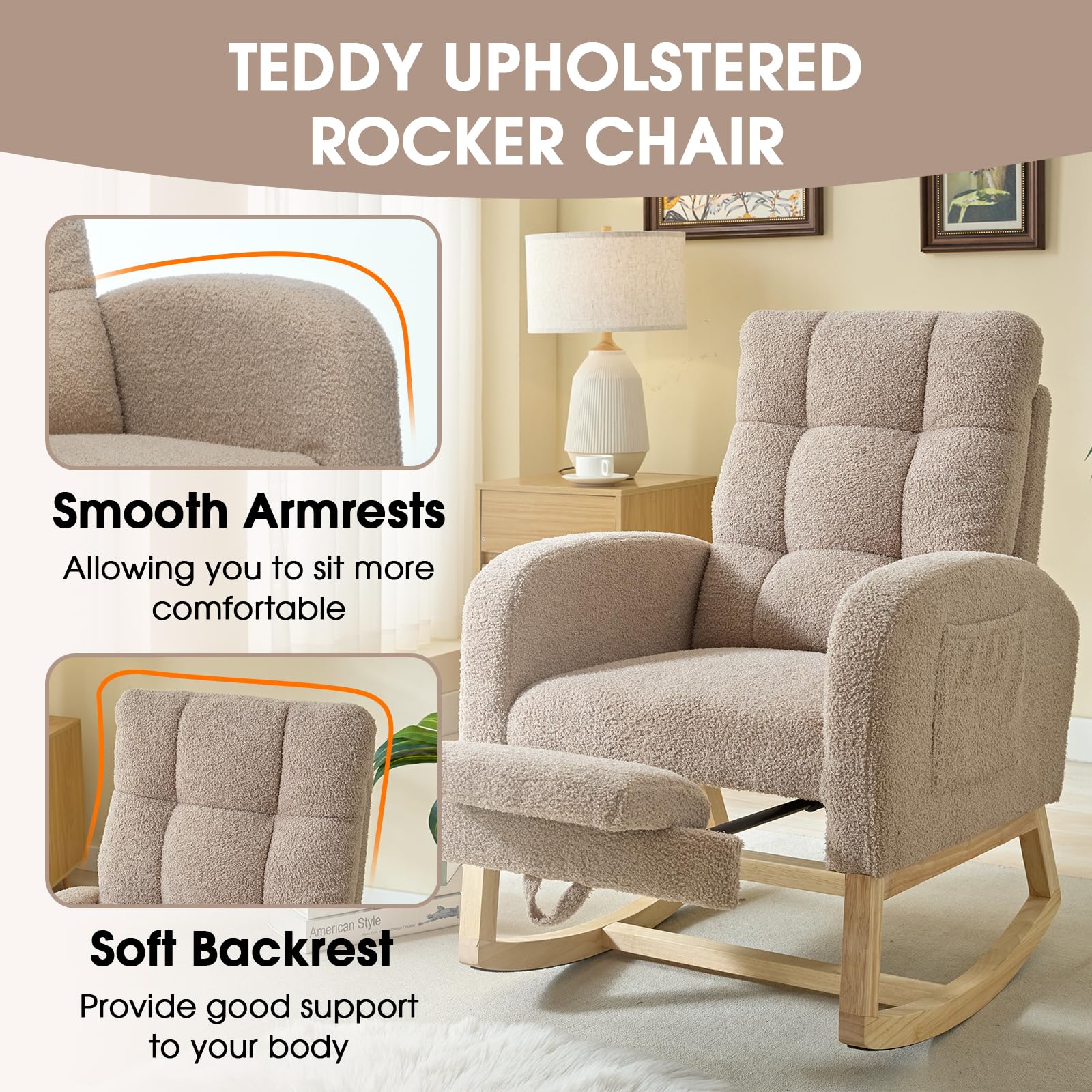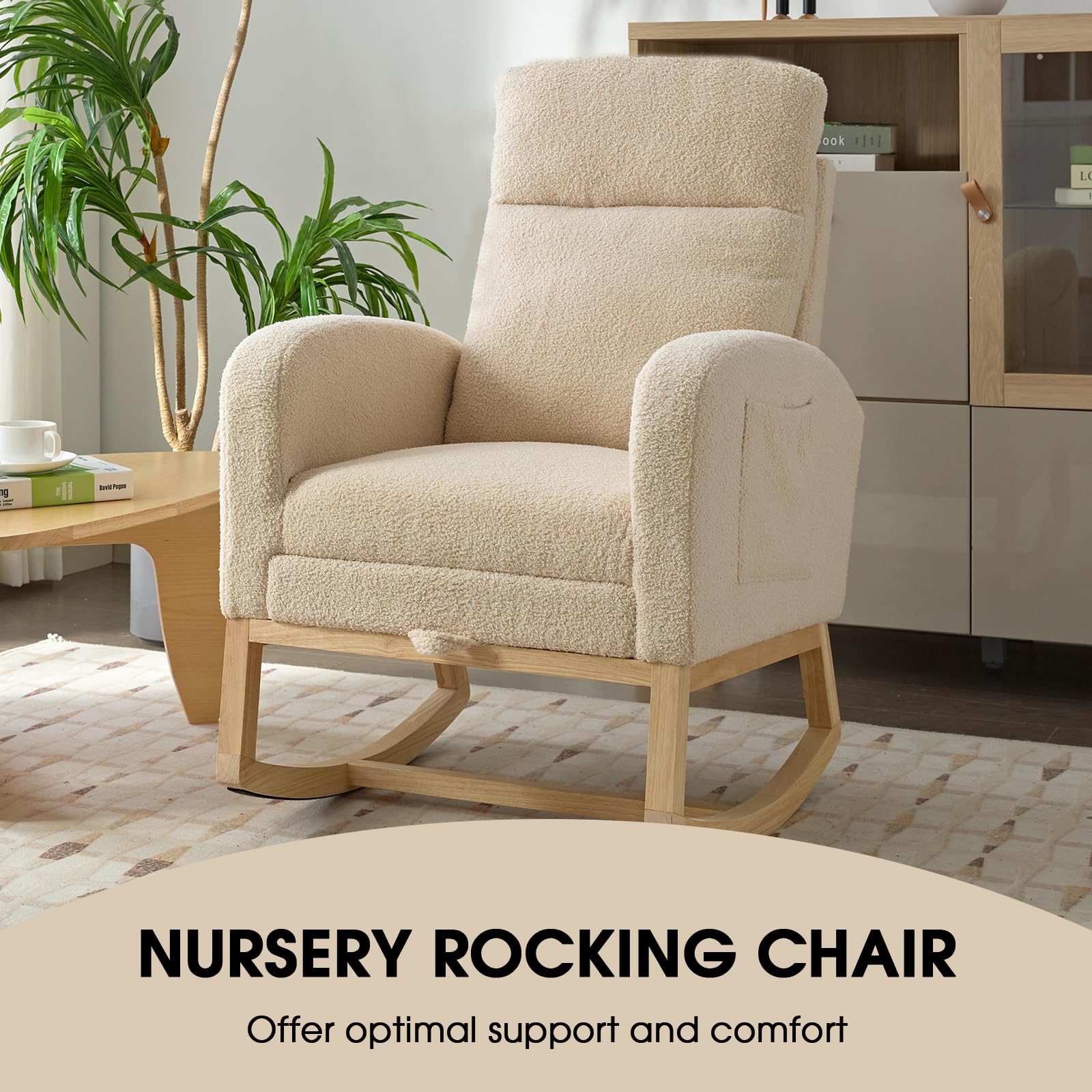 NIOIIKIT Modern Nursery Rocking Chair, Teddy Upholstered Rocking Chair with Footrest, Comfortable Glider Rocker with Side Pocket for Living Room, Bedroom, Nursing Room (Beige)