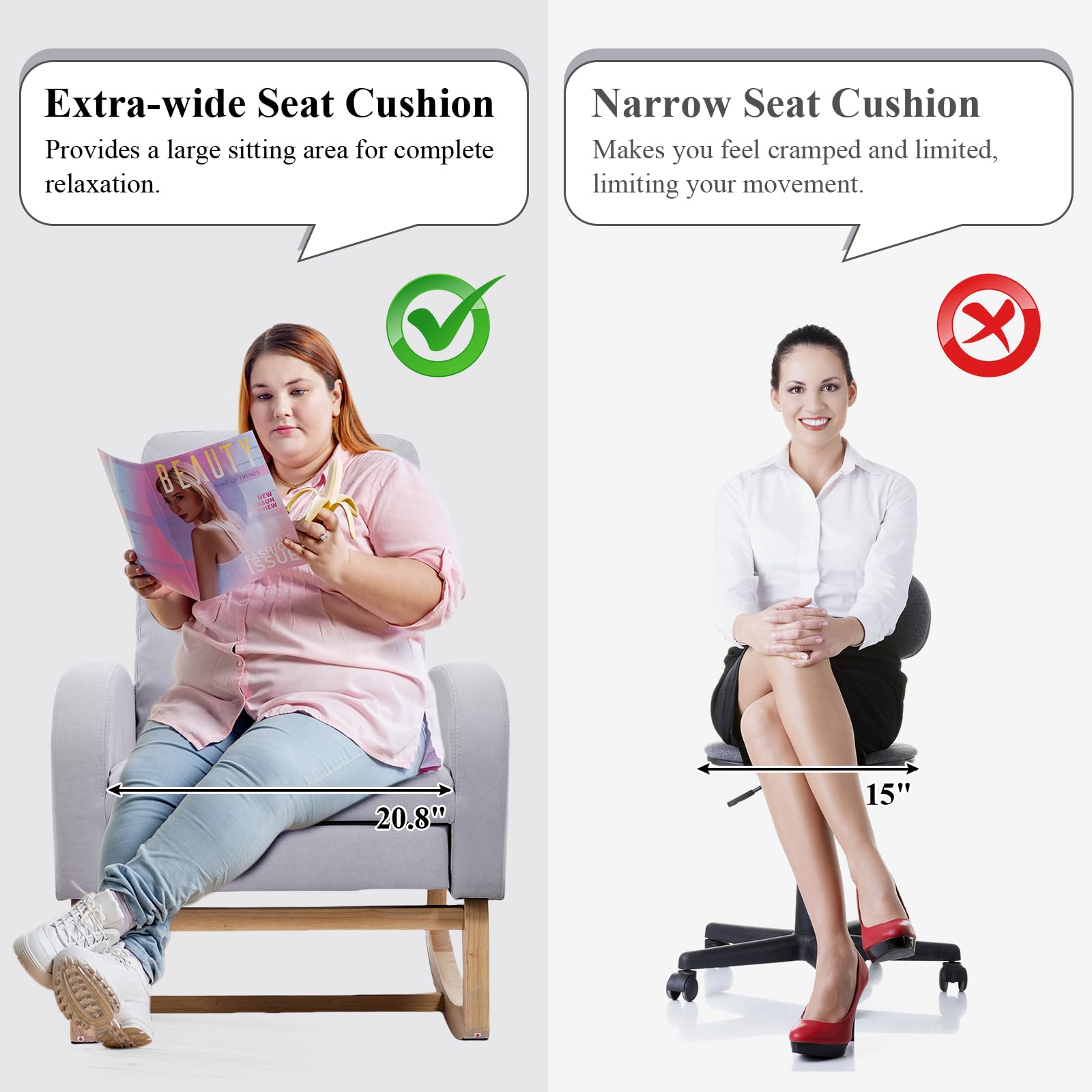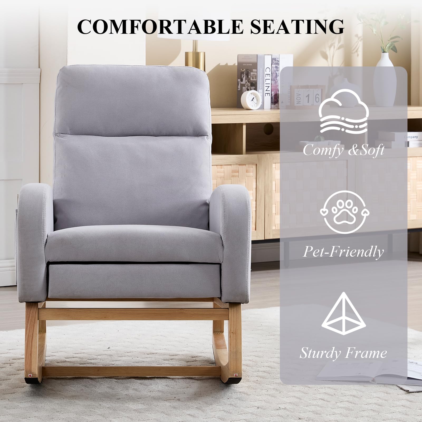 - Rocks Gently - This rocker chair adopts excellent radian design is designed based on the concept of the most comfortable rocking rhythm of the human body and there are non-slip foot pads under the base, making it rock gently and smoothly. Such thoughtful design is very suitable for relaxing or babies nursery, relieving your fatigue of the day effectively. Offer optimal support and comfort.