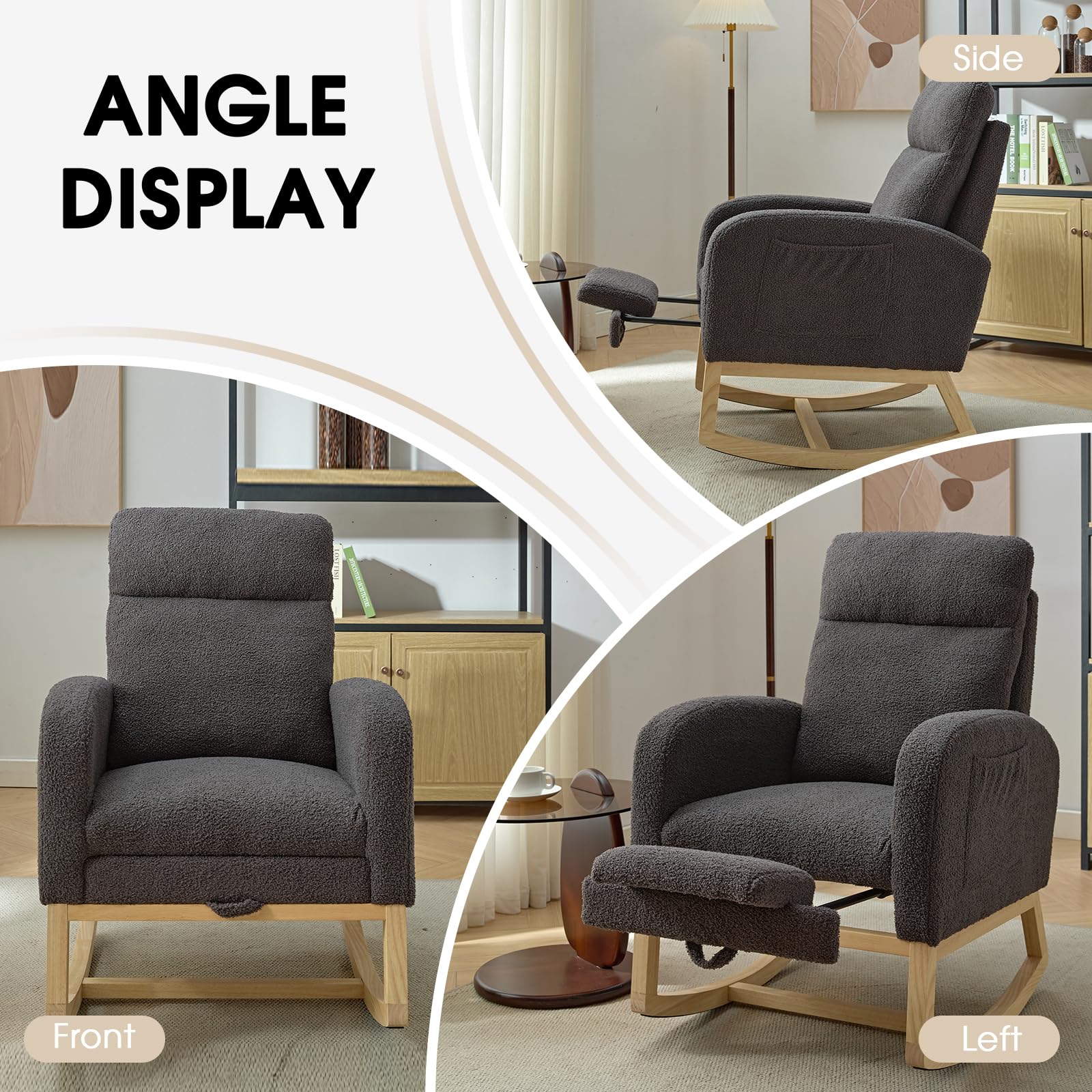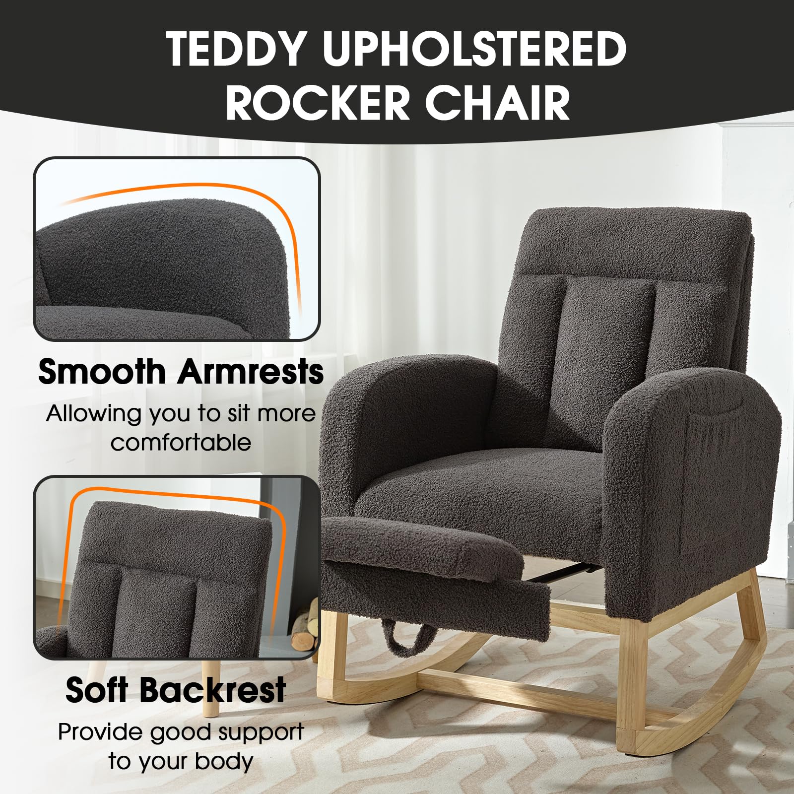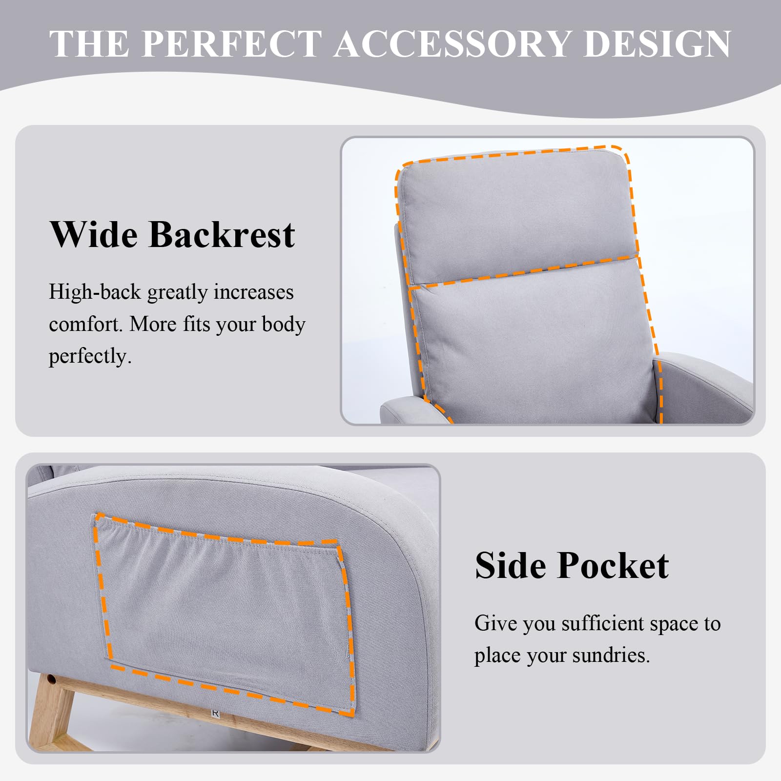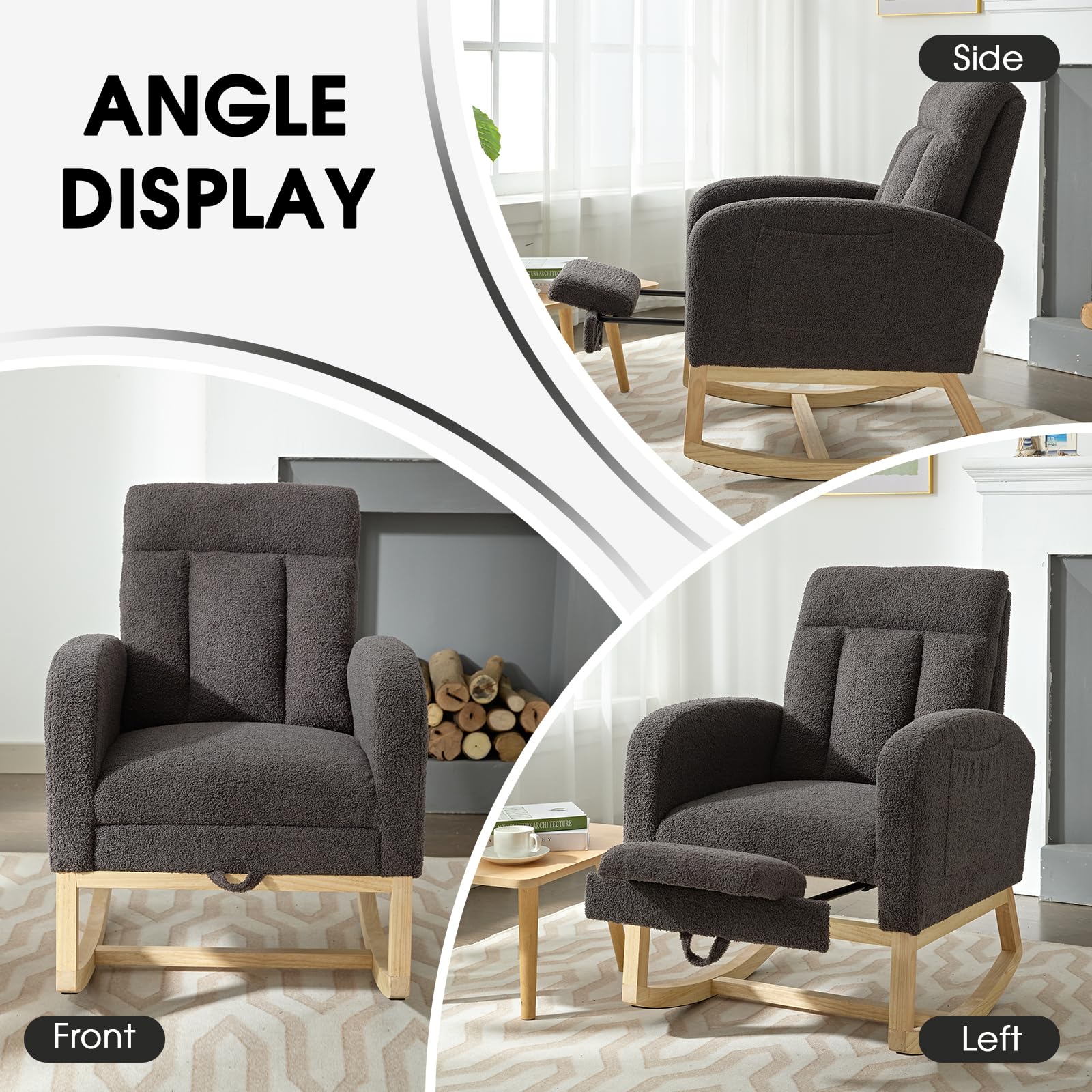 - Adjustable Footrest&Ergonomic Design - Our nursery rocking chair is equipped with good footrest that can provide your feet with extra support , allowing you to sit comfortably even when sitting for a long time. Soft backrest and smooth armrests let your body more easeful, What's more, there is a pocket on the side of the armrest, which is convenient for you to put magazines and TV controller. Provide you with more convenience.