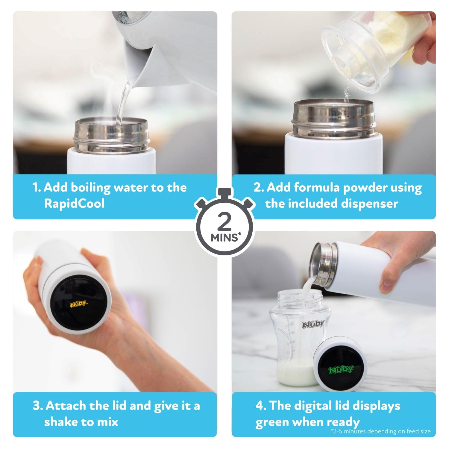 Nuby RapidCool Portable Baby Bottle Maker - With Milk Powder Dispenser and Digital Lid - Ideal for Travel Bottles and Night Feeds - Stainless Steel