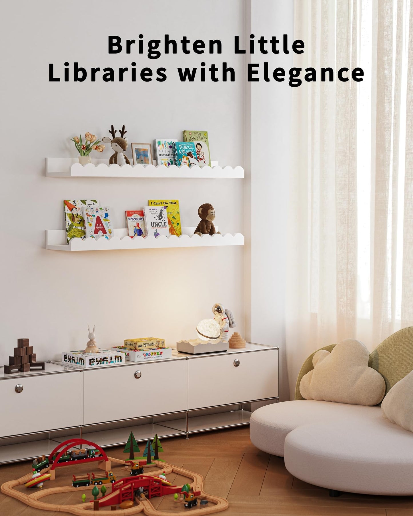 Nursery Book Shelves, 4-Pack White Floating Shelves for Wall Kids, Scalloped Shelves, Wall Book Shelves for Bedroom Kids, Toddler Room, Baby Room, Nursery Decor