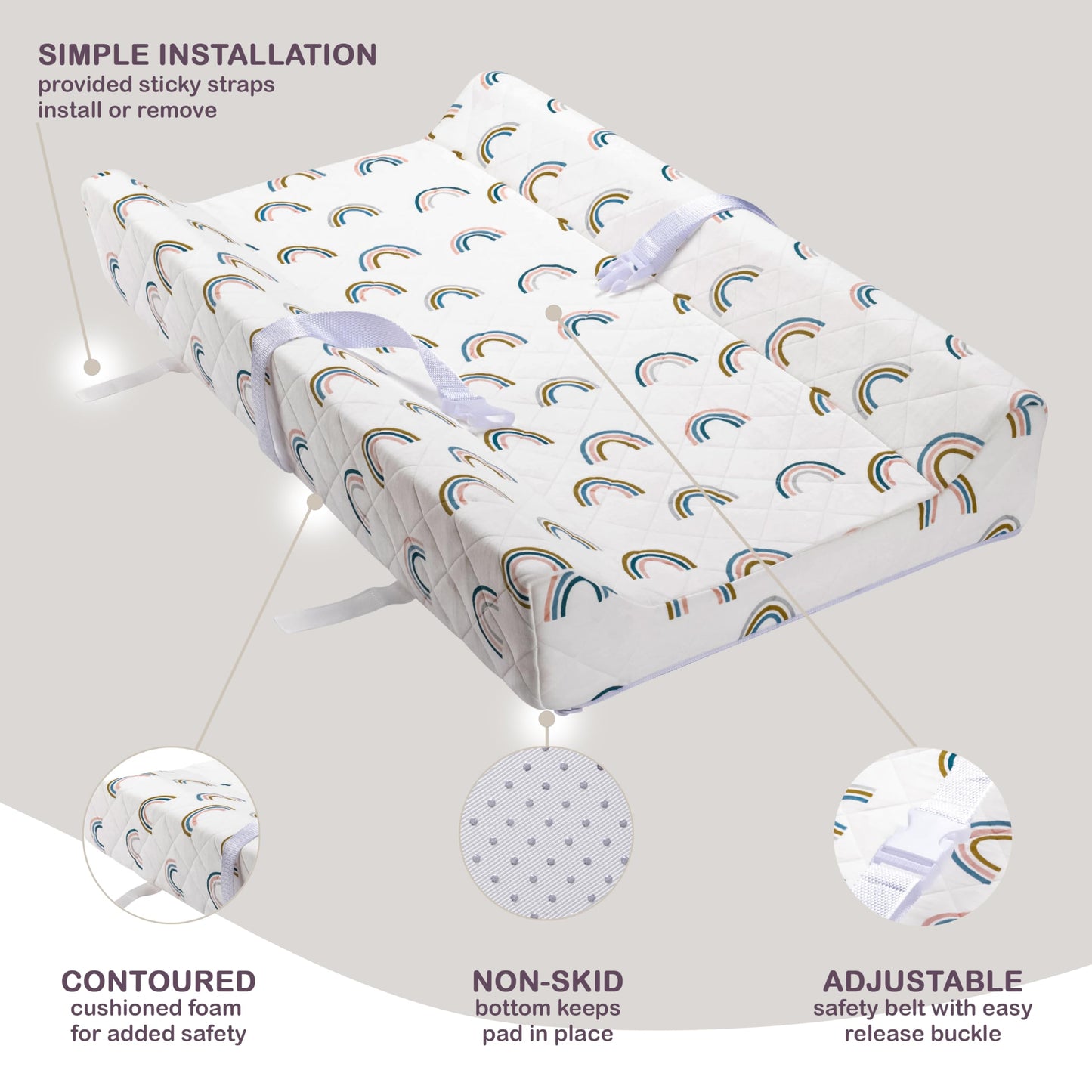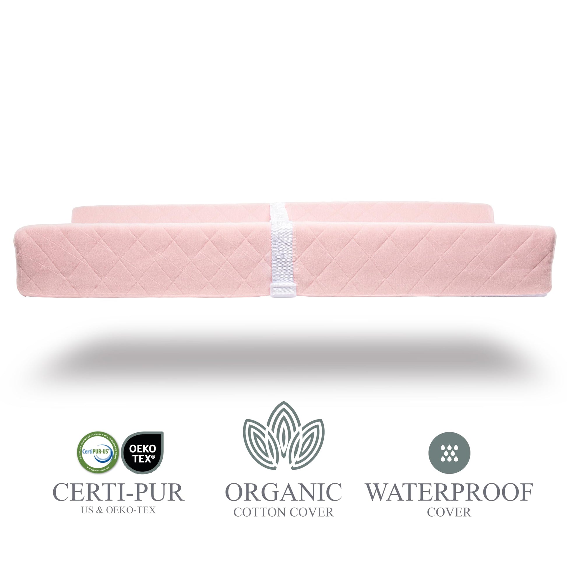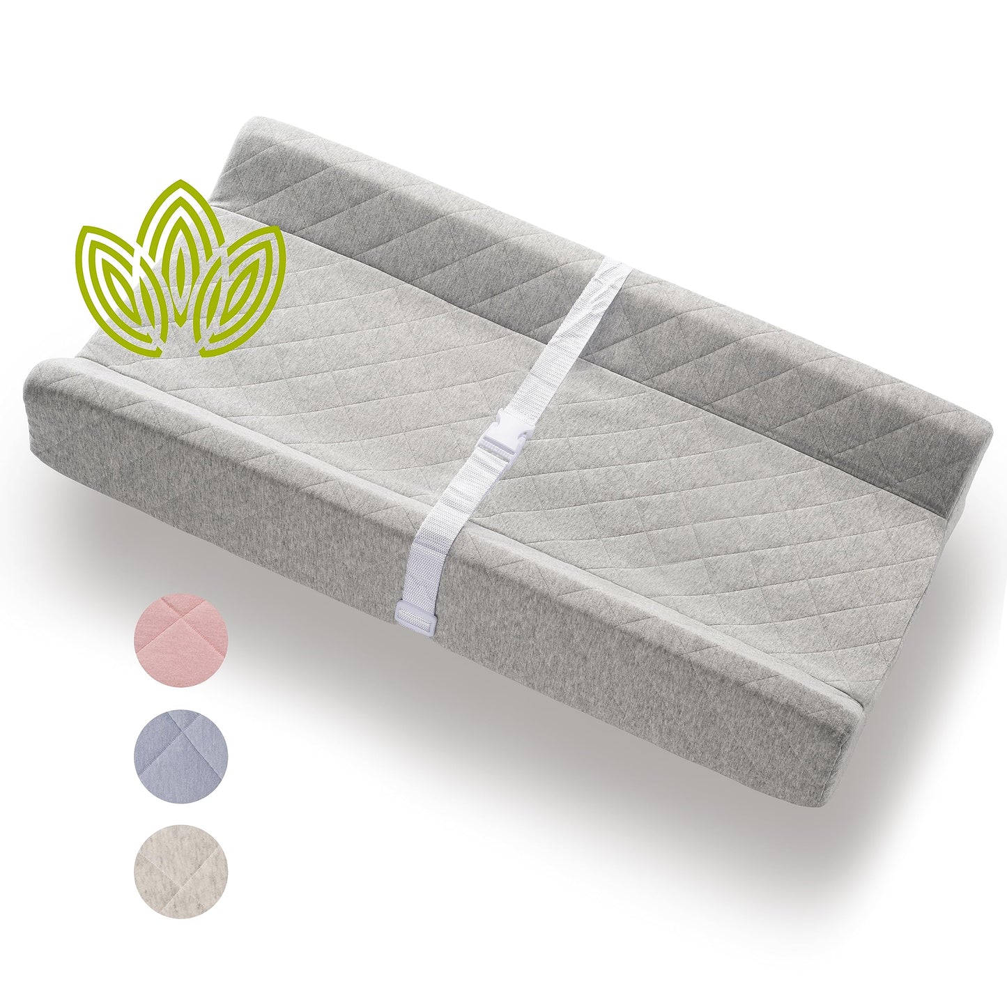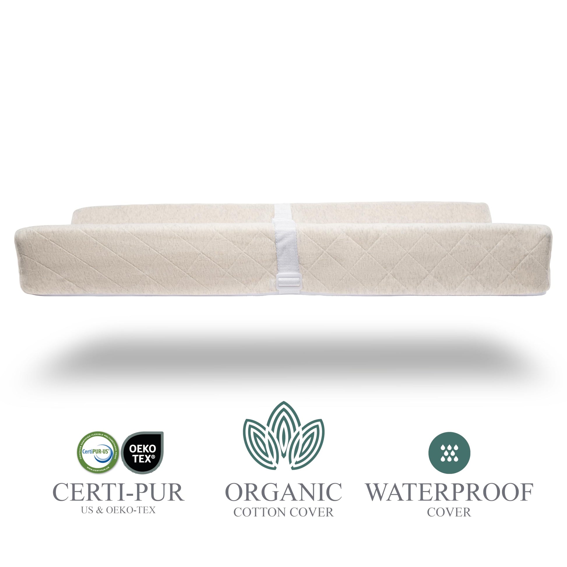Organic Cotton Contoured Baby Changing Pad w/Waterproof Foam Mattress, Includes Soft, Removable & Washable Cover, Safety Strap, Non-Slip Bottom, Topper for Standard Size Infant Diaper Table & Dresser