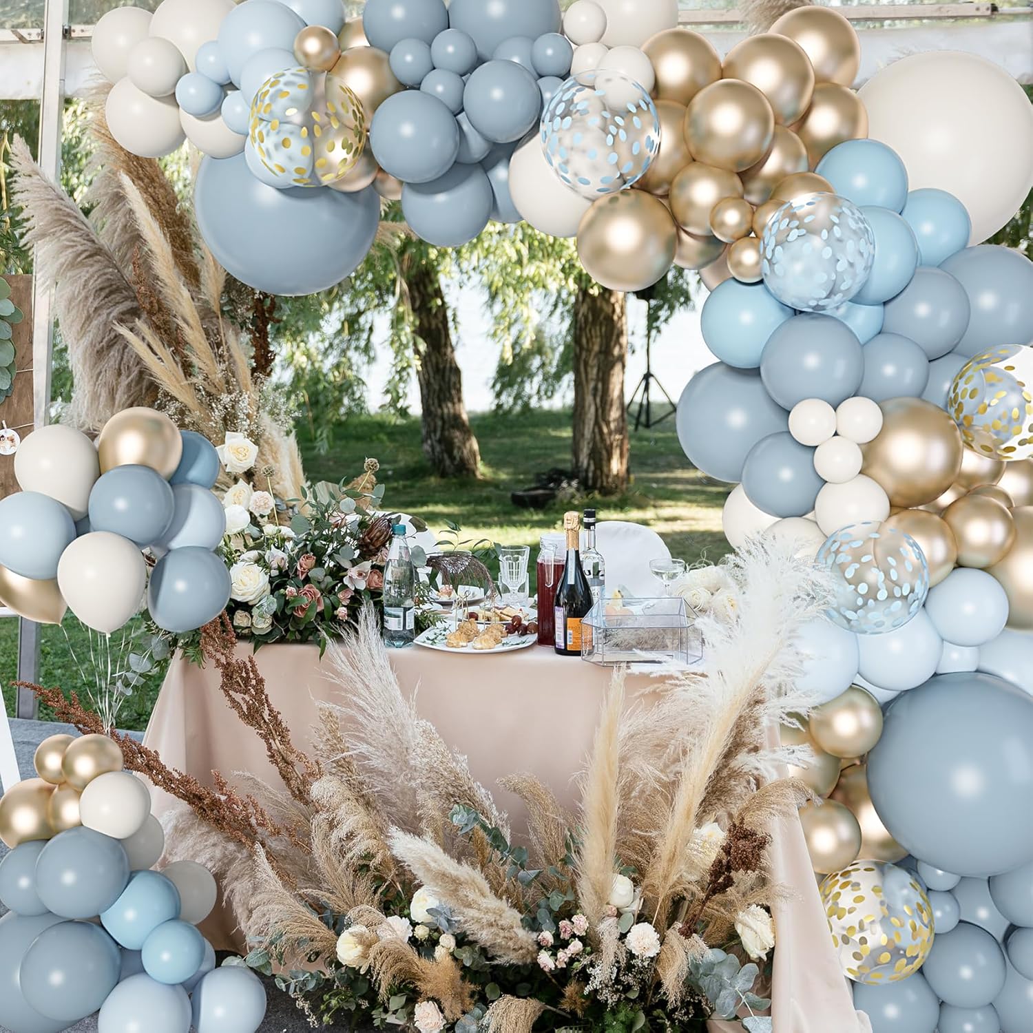 - Dusty Blue Balloons Arch Kit: Our dusty balloons garland kit contains 4pcs 18inch dusty blue/sand white balloons, 6pcs metallic gold/blue confetti balloons, 24pcs 12inch dusty blue/sand white/baby blue/champagne balloons, 82pcs 10inch dusty blue/sand white/baby blue/champagne/light blue balloons, 60pcs 5inch dusty blue/sand white/baby blue/champagne balloons, 1 knotter, 1 glue points, 1 balloon arch strip & 1 ribbon.
