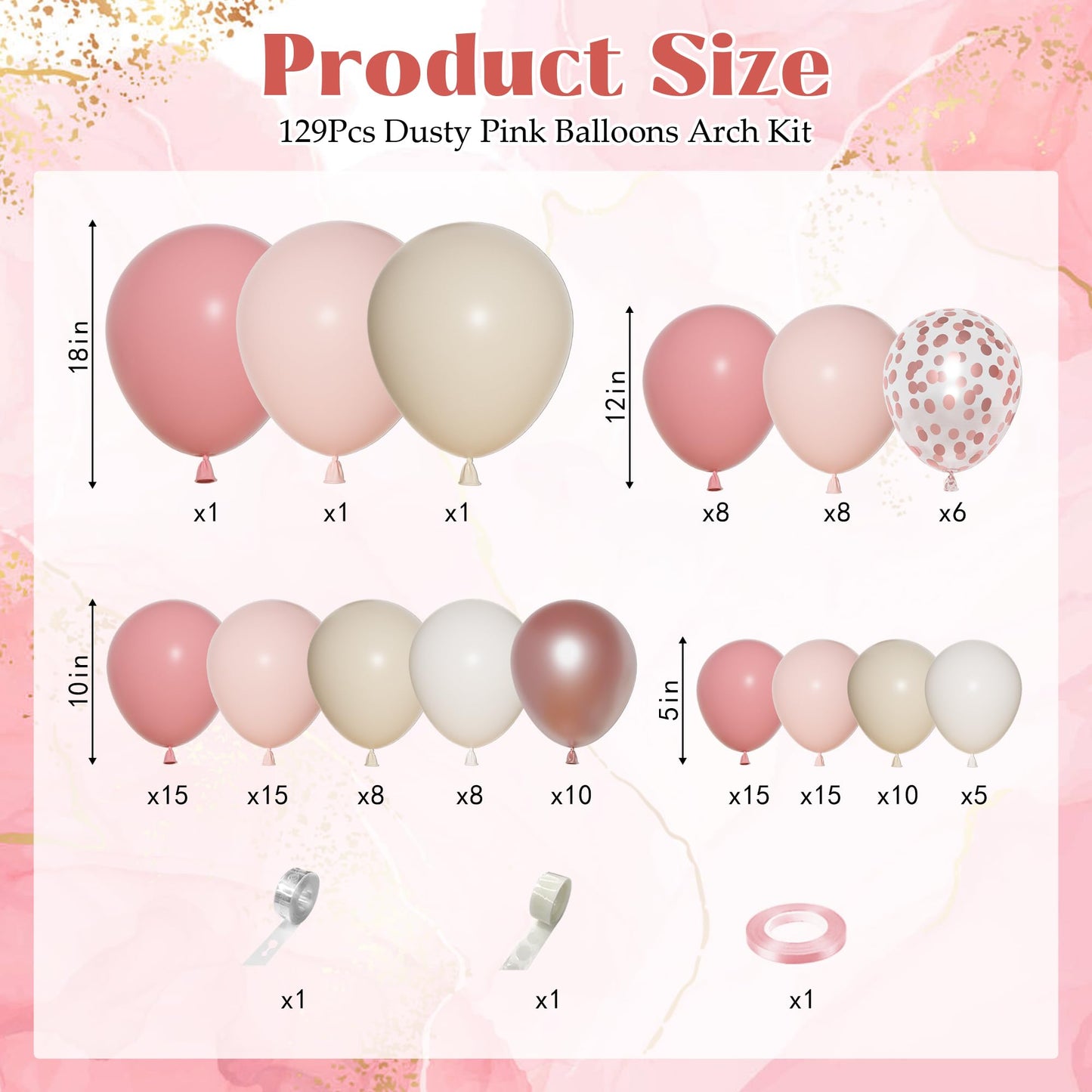 - Dusty Pink Balloons Kit: Includes 3pcs 18in balloons(dusty pink/nude pink/sand), 22pcs 12in latex/confetti balloons(dusty pink/nude pink), 101pcs 10/5in boho balloons(dusty pink/nude pink/sand/white/metallic rose gold), 3pcs balloon tools