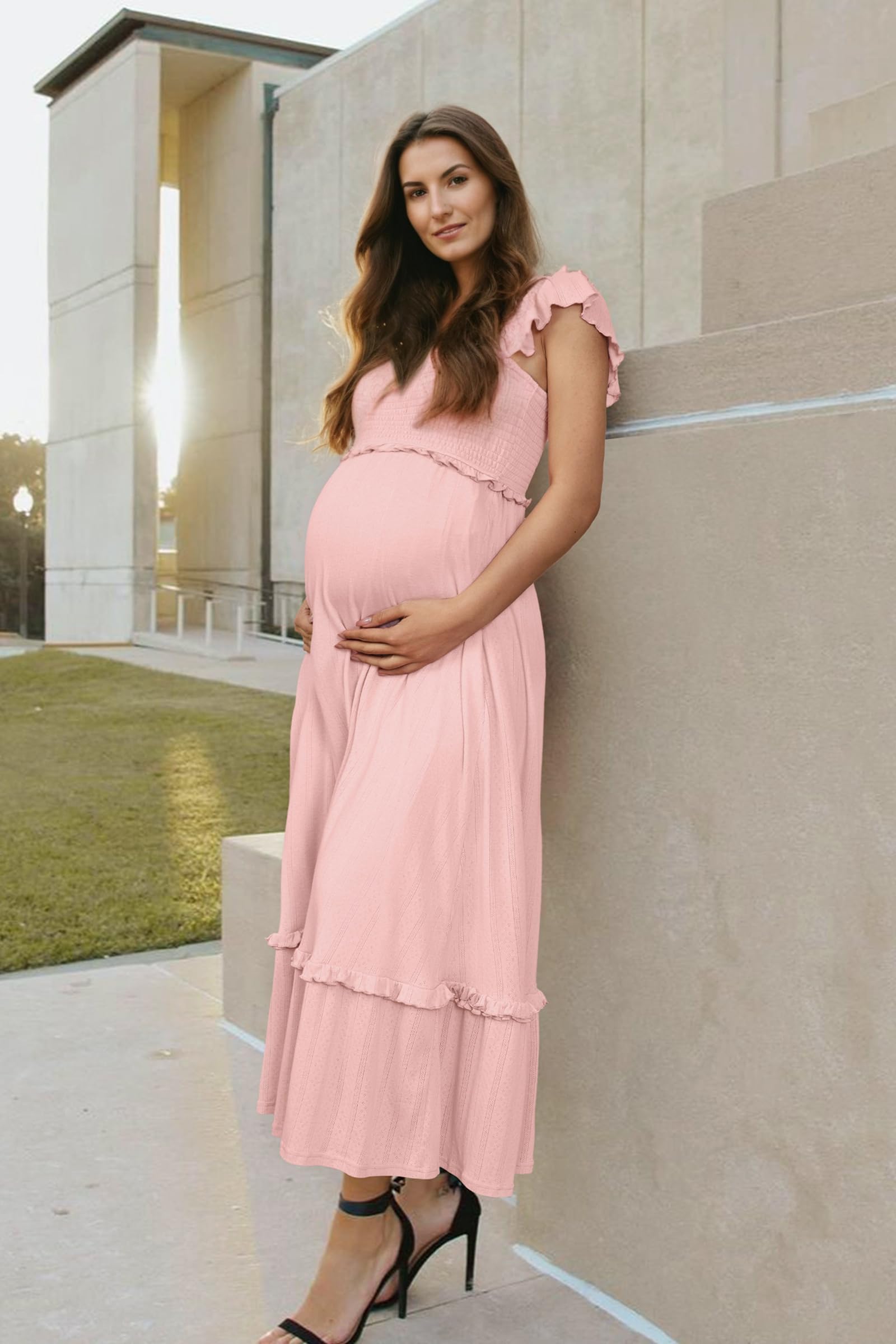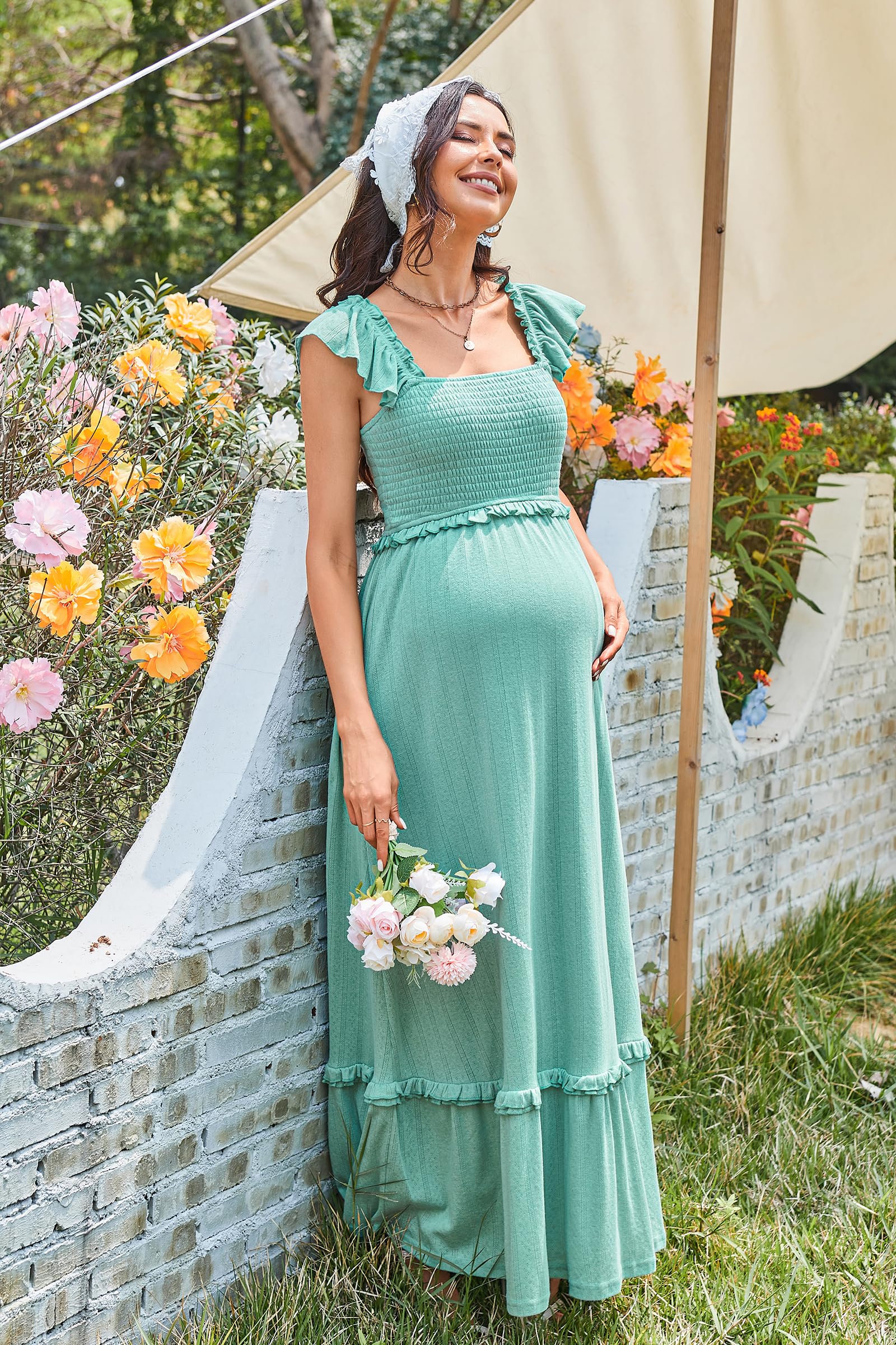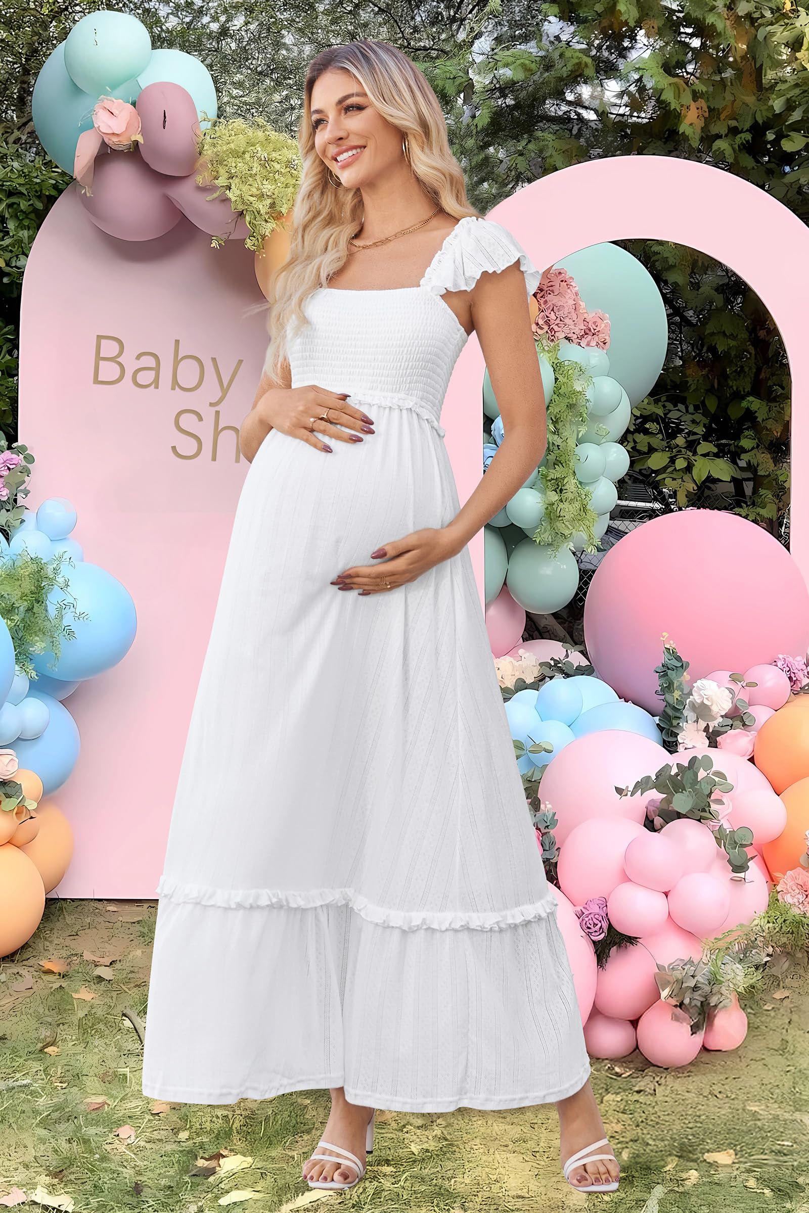 OUGES Womens 2025 Summer Maternity Photoshoot Dress Boho Maxi Smocked Baby Shower Dress Ruffle Sleeve Maternity Clothes