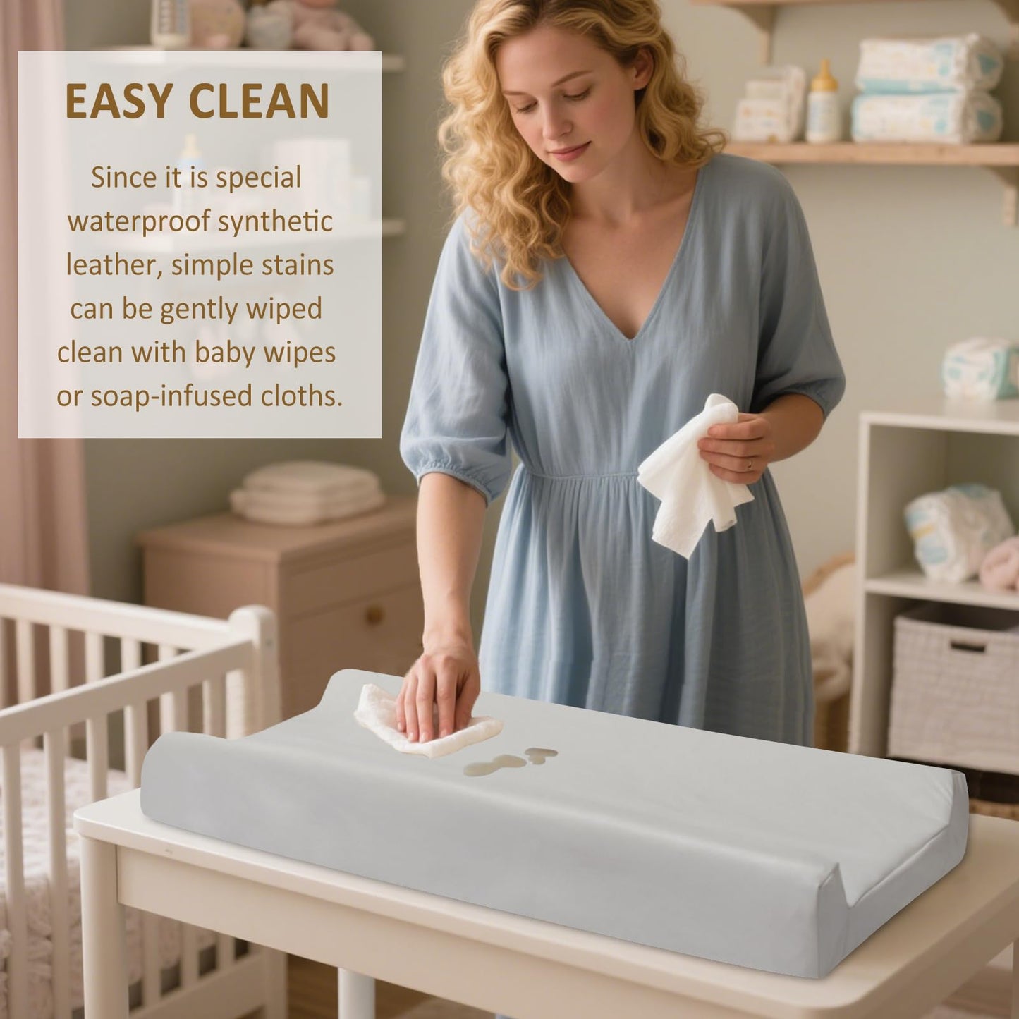 the wipeable changing mat cover is made from faux leather ,so messes wipe off quickly with a damp cloth .