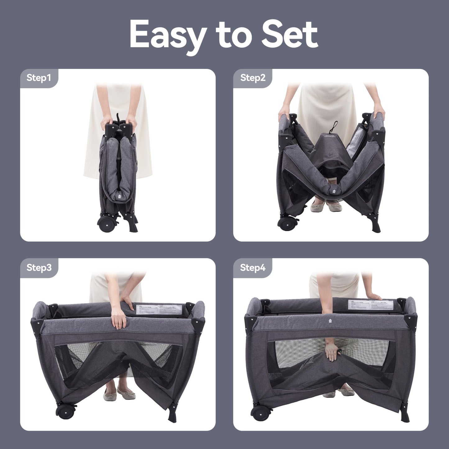 - 【Easy to Assemble】Very easy to assemble, the baby travel playard doesn't require a lot of setup and can be stored or reassembled in minutes. Just snap the bassinet's frame into place and the cot is ready to use. It's also easy to fold and pack or reassemble in seconds without any stress or complicated steps.