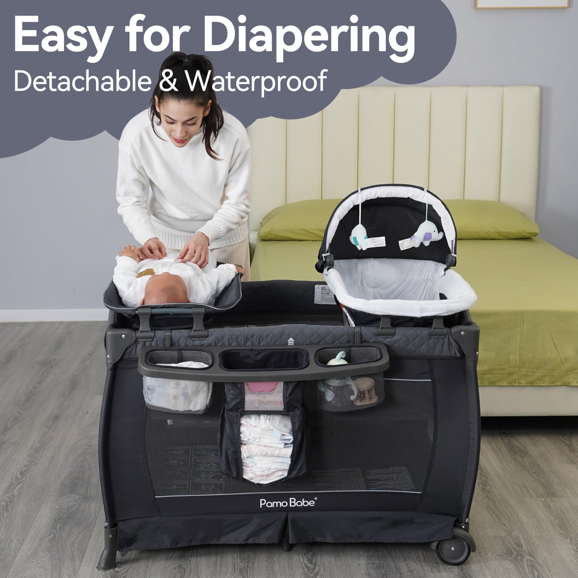- 【Multifunctional Play Area】Baby play area with detachable bassinet, soft sleeping nest, wipe-clean changing table and sturdy diaper organizer, 5 in 1 practical crib. A fully functional crib that you will love.