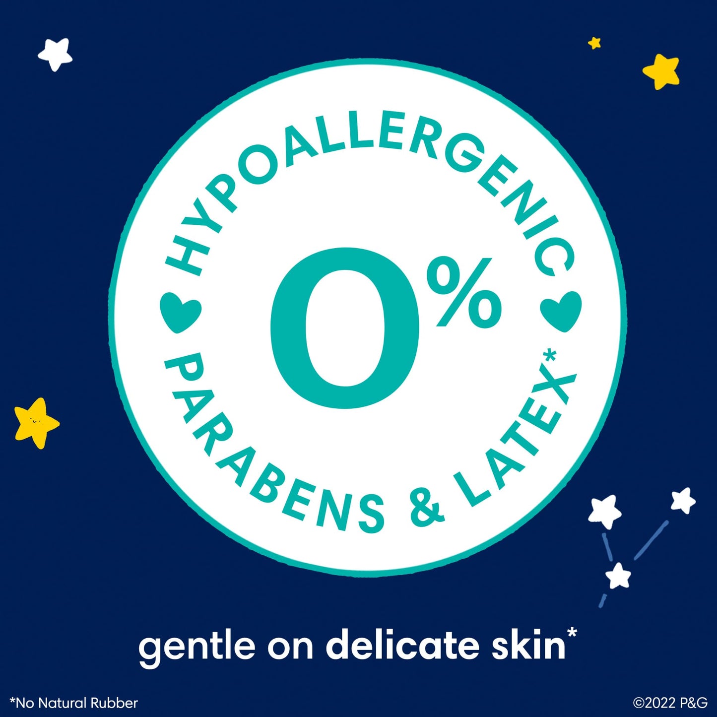 Say goodbye to overnight leakage with Pampers Swaddlers Overnights. Our nighttime diapers feature a Blowout Barrier at the back waist to help prevent leaks up the back of the diaper for enhanced overnight protection. Featuring 50% more absorbent zones than ordinary diapers* to help distribute wetness evenly and keep baby's skin dry and comfortable all night long. Less leaks mean more restful sleep. With Pampers Overnight Diapers, you can rest assured that you have superior absorbency, while keeping baby's skin dry and healthy, no matter how baby sleeps. The BreatheFree Liner in Overnight Diapers size 3-7 wicks away moisture, allowing baby's skin to breathe, while the LockAway Channels pull wetness into the core of the diaper to help prevent irritation. Also, our overnight diapers feature Dual Leak-Guard Barriers at the legs to help protect where leaks happen most. These nighttime diapers are dermatologist approved by the Skin Health Alliance, hypoallergenic, and free of parabens and latex, so you can trust them to be safe and gentle on your little one's delicate skin. Size 3-7 overnight diapers feature eight sweet nighttime prints. For trusted protection, trust Pampers, the #1 pediatrician recommended brand.** Product and packaging may vary. Download the Pampers Club App today and earn Pampers Cash*** Redeem your Pampers Cash for exclusive Pampers coupon savings and rewards. *Swaddlers Overnights vs. “leading value brand" ***Only redeemable via Pampers Club. No cash value. 0% PARABENS AND LATEX: Latex-natural rubber