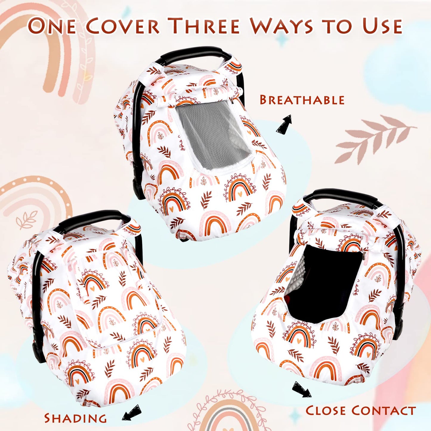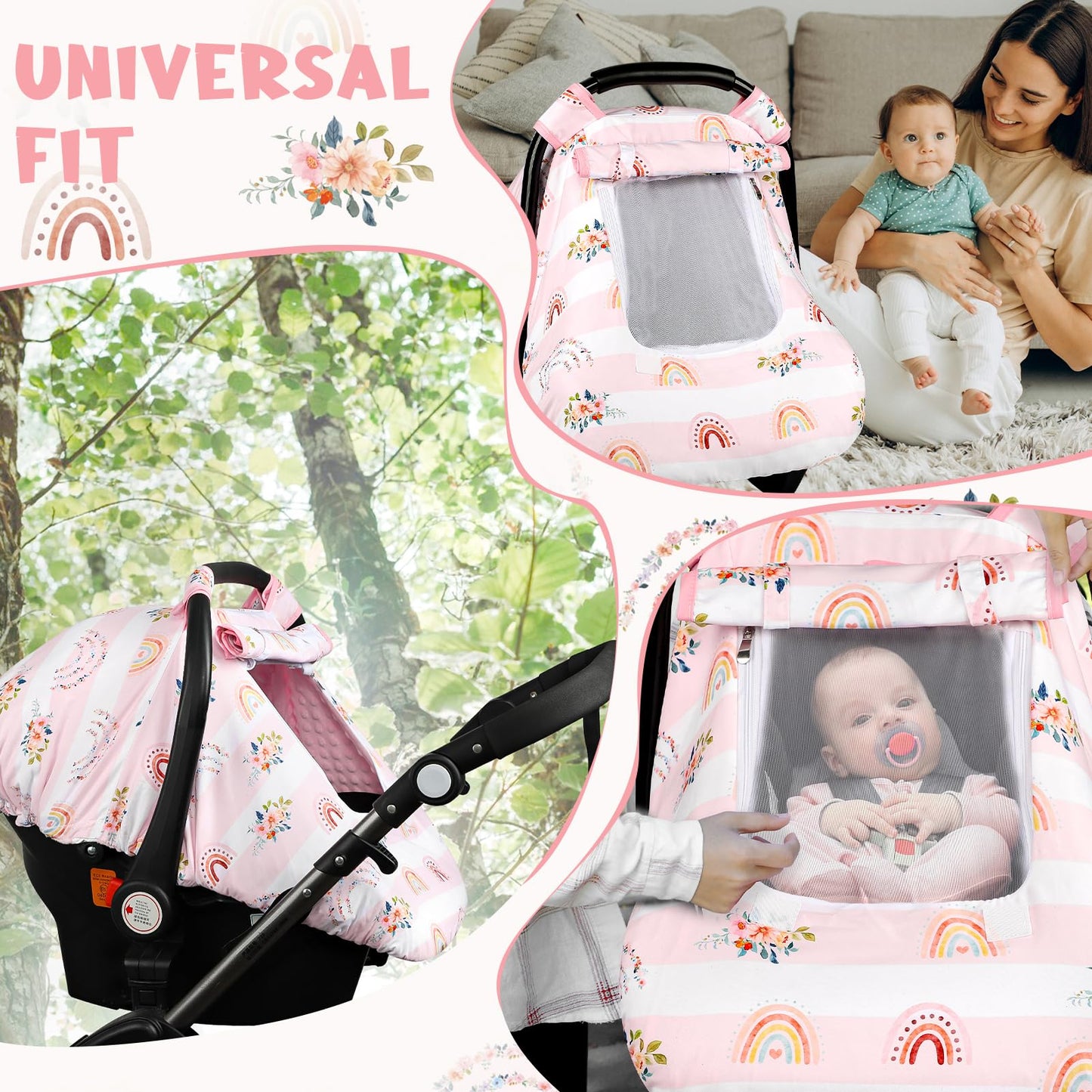 Pea Pod Car Seat Cover Baby, Infant Car Seat Canopy Covers for Newborn with 2 Layers Windows of Breathable Mesh Fabric, Lightweight Polyester/Soft Minky Dot Backing (Floral & Rainbow)