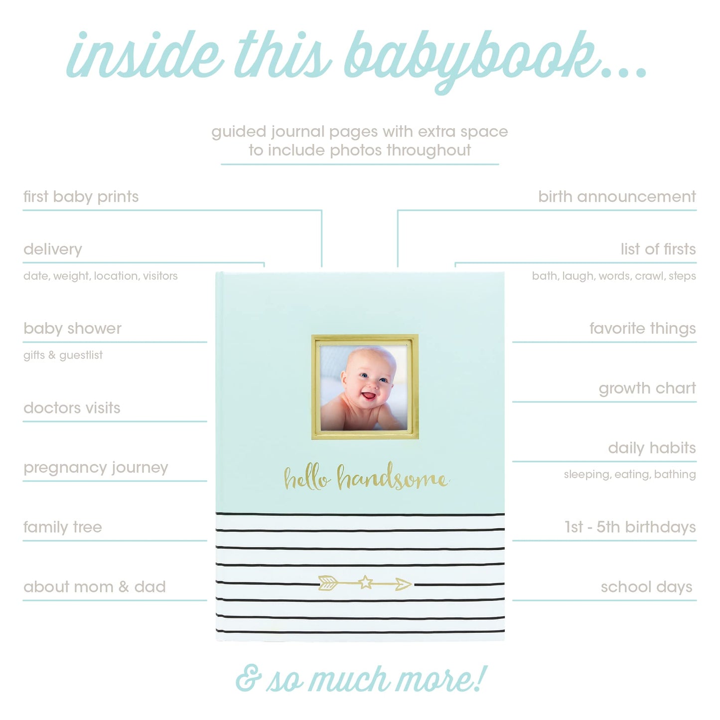 - Pretty in Pink: Introducing the 'Hello Beautiful' baby book, with its charming light pink fonts and 50 pages, perfect for capturing and sharing your precious stories. The stylish light pink cover, adorned with white and black stripes and a gold foil arrow, includes a 3” x 3” slot for your favorite baby photo.