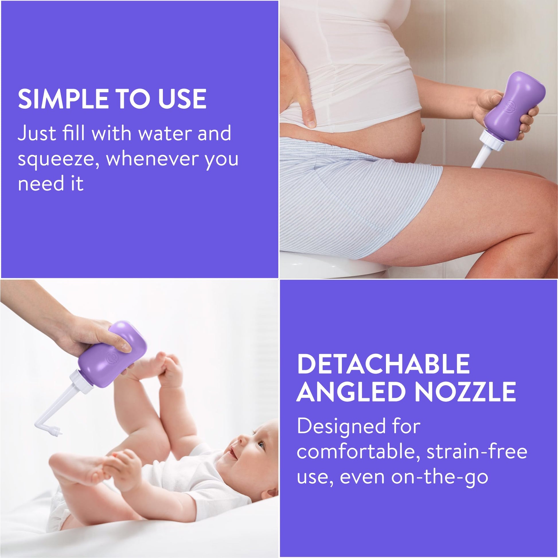 - SMART DESIGN - Fill with warm water, hold upside down, and enjoy a soothing spritz of freshness during those not-so-comfy moments in your first postnatal months. With an angle nozzle that features 10 holes instead of the average 6, you get pinpoint accurate relief, with no guesswork or struggle to get it right.