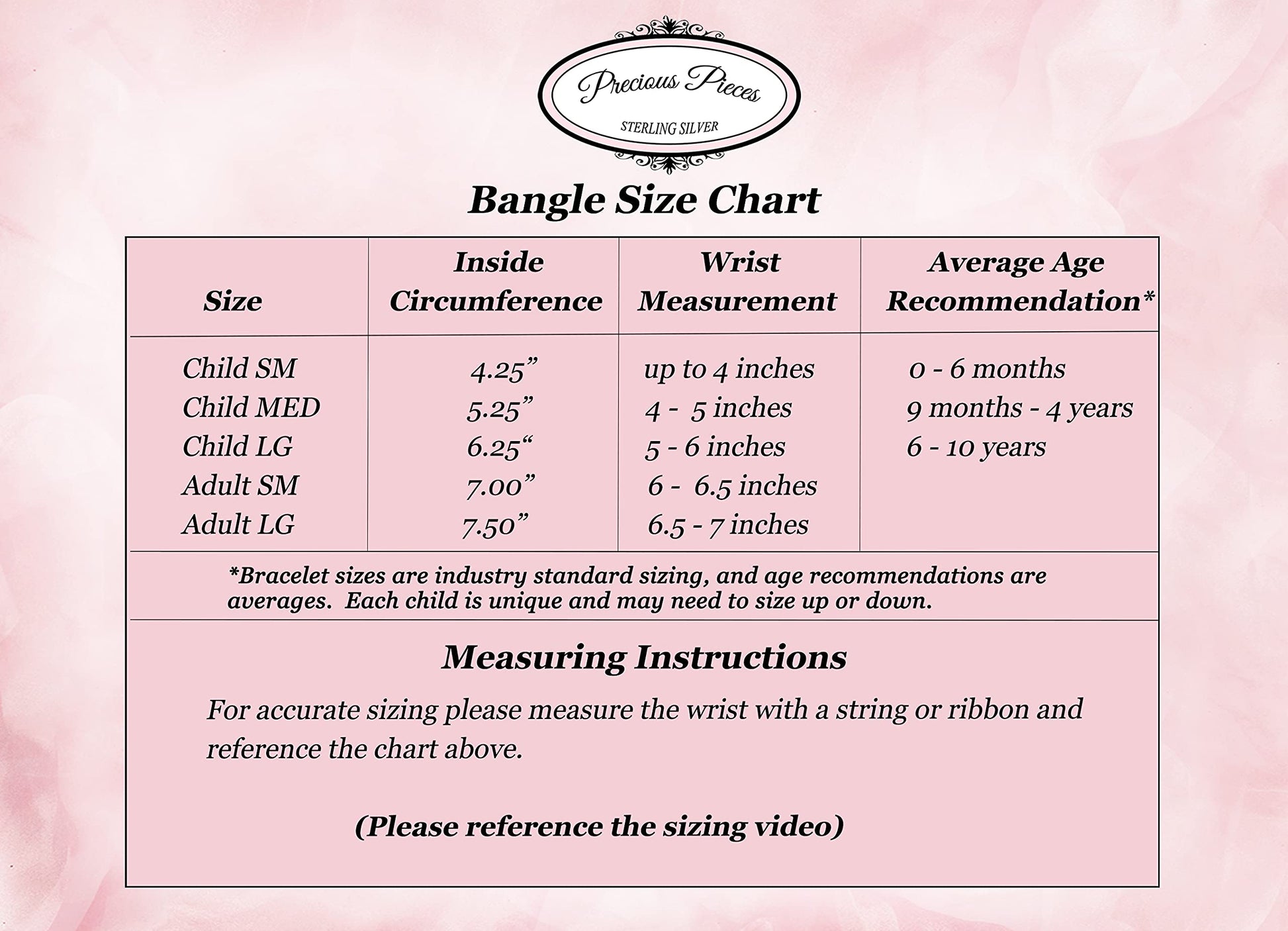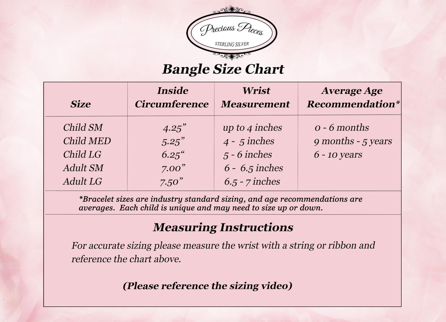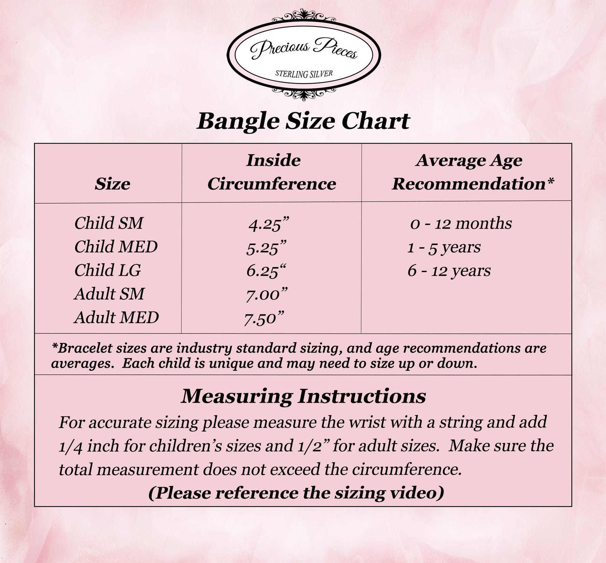 - SIZING – This custom bangle is designed to fit an average 0–6 month old child with the inside circumference measuring 4.25 inches. Please measure wrist and add a minimum of 1/4 inch for proper sizing. IMPORTANT: Please refer to the image of the "Bangle Size Chart" to choose a size and view sizing video as customized products are not eligible for return.
