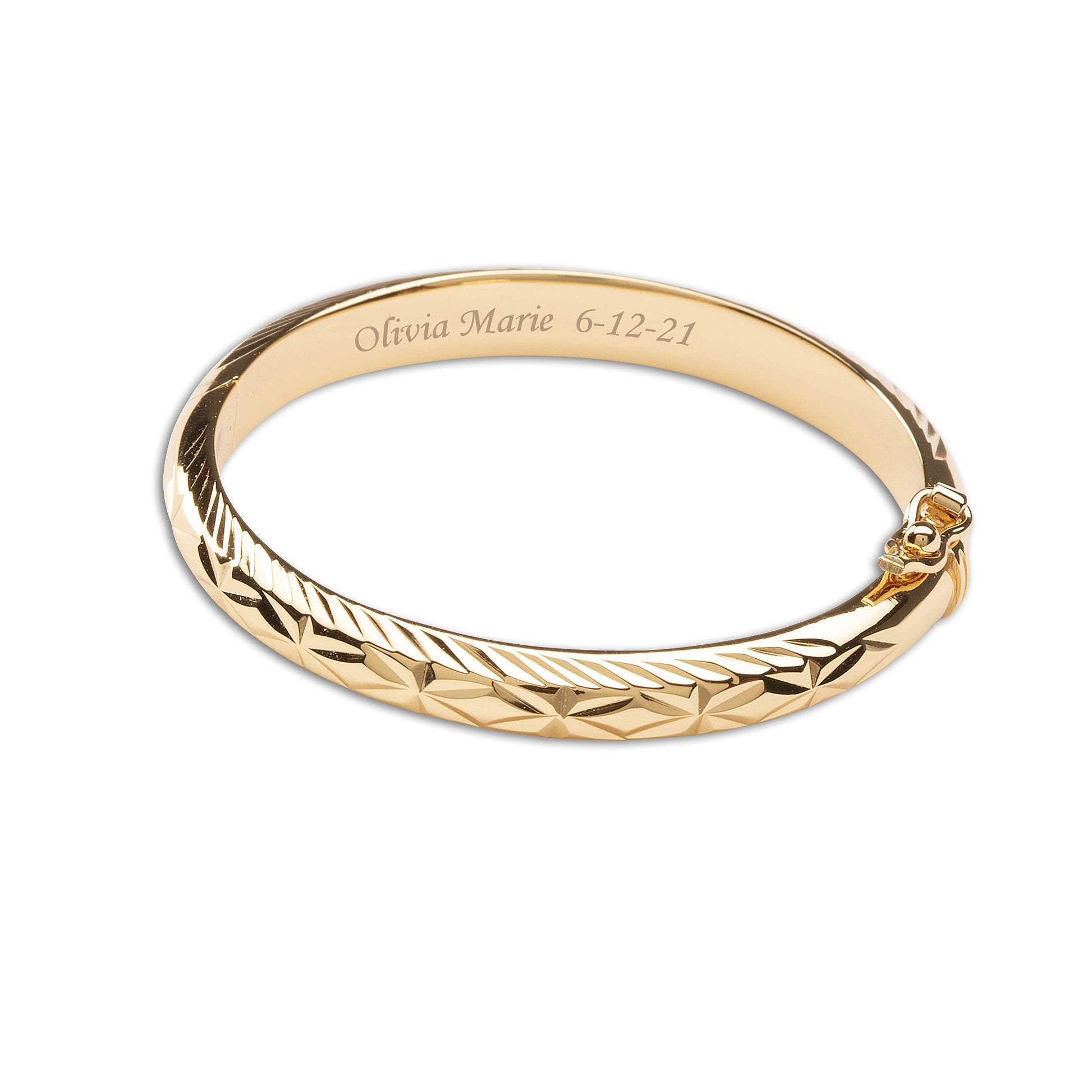 14K gold-plated custom personalized bangle bracelet includes engraved message up to 20 characters (engraved inside bracelet). This bracelet will be a keepsake she will treasure forever. Comes in a beautiful gift box and makes a timeless gift. (Safety age-graded for ages 0 and up).