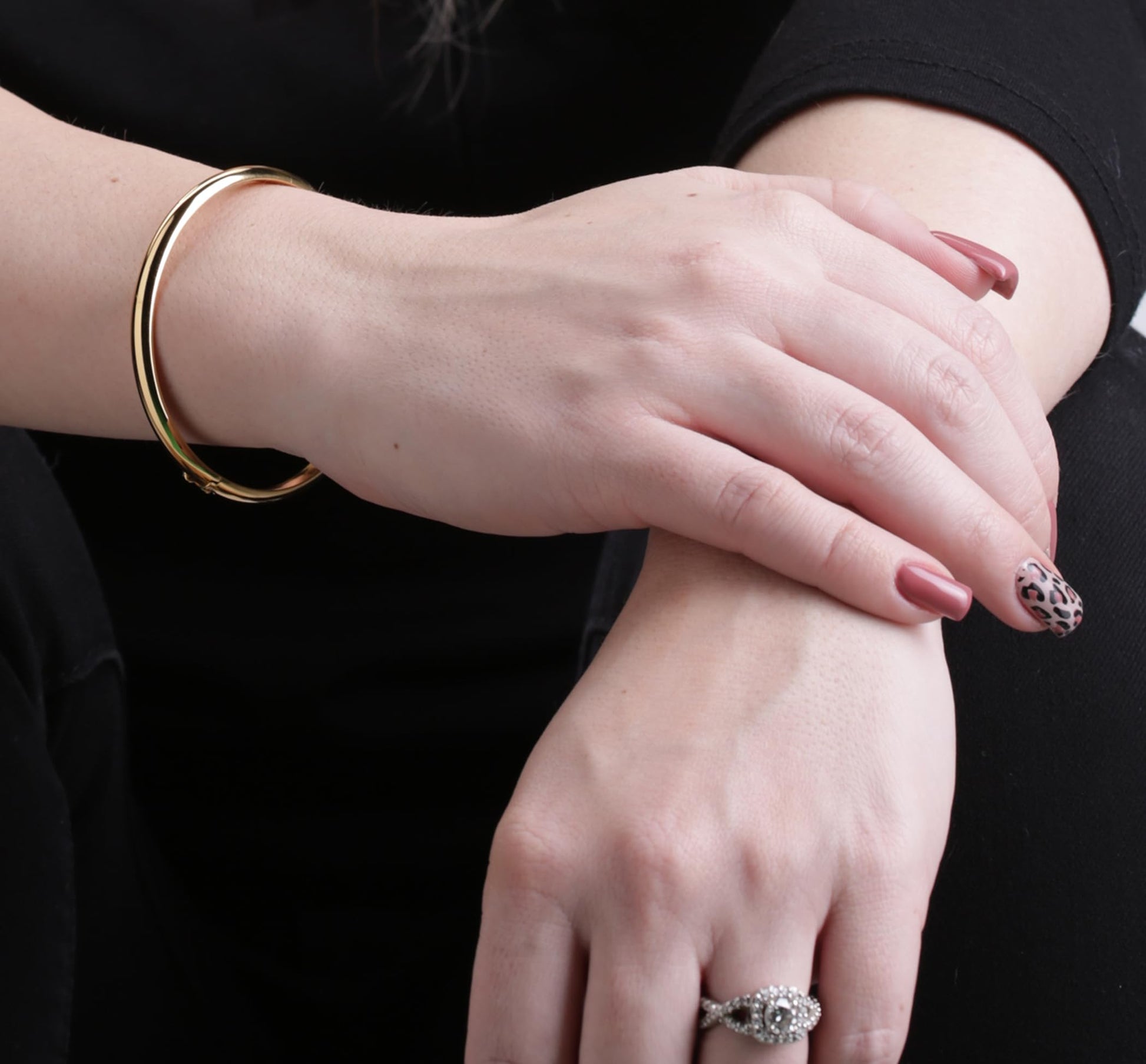 - PREMIUM QUALITY – 14K Gold-Plated (over sterling silver) hinged bangle bracelet features two durable safety latches to assure it isn't pulled off or lost. This jewelry makes a timeless keepsake piece she will treasure forever (Engraving included inside the bangle up to 20 letters).