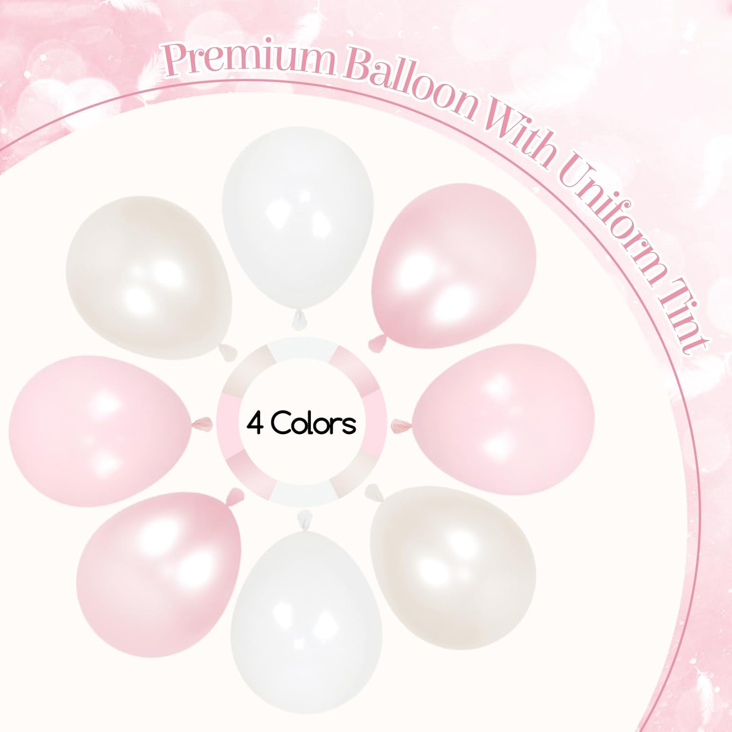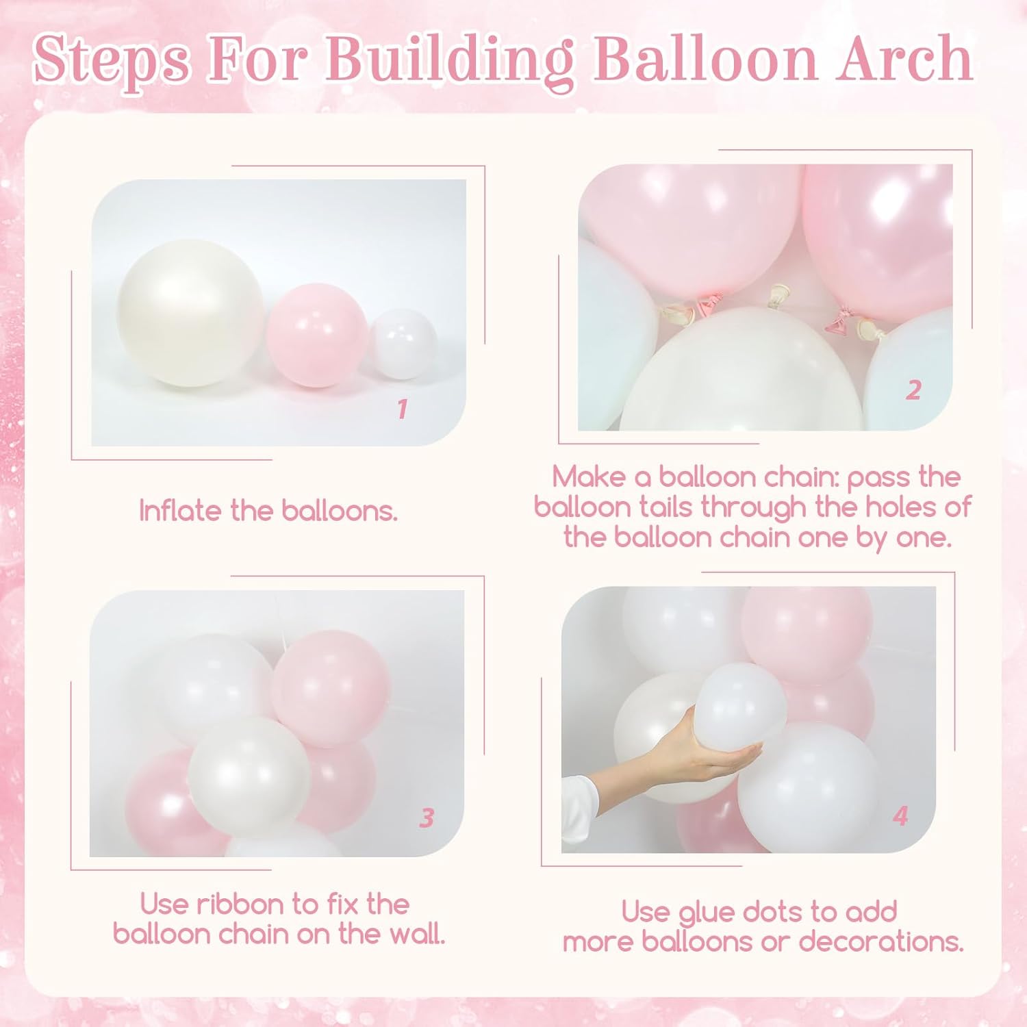 - What You Will Get: The pink bow balloon arch kit includes light pink balloons(18inchx1, 10inchx15, 5inchx15), pearl light pink balloons(18inchx1, 10inchx15, 5inchx15), pearl white balloons(18inchx1, 10inchx15, 5inchx15), white balloons(10inchx15, 5inchx15), 18inch clear balloonsx3, pink long balloonsx6, white long balloonsx4, pearl white decorationx1, decorative stripx1, white ribbonx1, glue dotsx100
