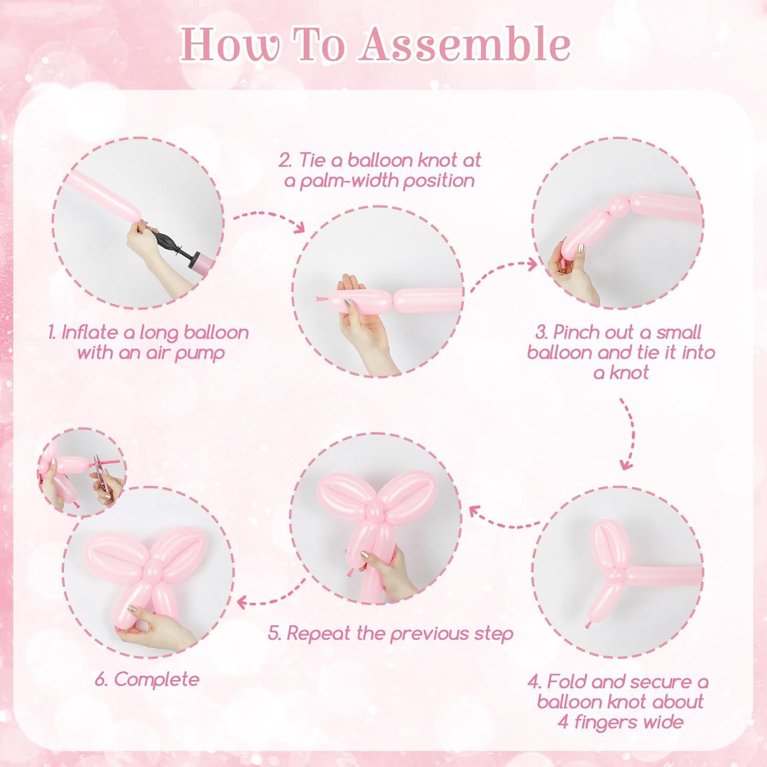 - How to Use: Inflate the pink and white balloons into various sizes with a pump, then group the pink bow balloons into clusters by crossing them over and tie them with a decorative strip or ribbons. Arrange the clusters into an arch shape. Finally, use glue dots to fill any space with 5in balloons for a fuller look