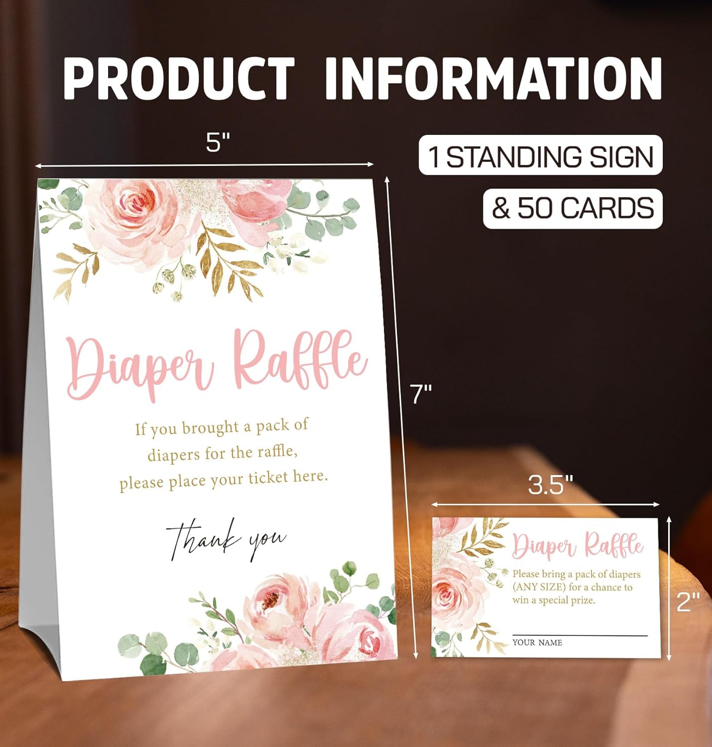 Pink Floral Diaper Raffle Cards for Baby Shower Game,1 Standing Sign & 50 Guessing Cards,Girl's Baby Shower Party Decoration,Guessing How Many Diaper Raffle Tickets