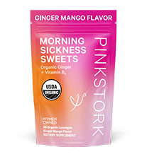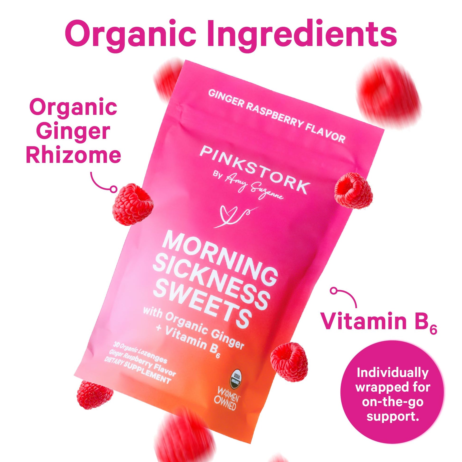 - Vitamin B6 and ginger is the dynamic duo for your morning sickness survival kit - pop a Morning Sickness Sweet 1-4 times daily, as needed. A: Pink Stork Sweets are vegan-friendly, individually and discreetly wrapped for convenience, and made without GMOs, gluten, soy, or dairy. Our lozenges do not contain any artificial flavors, colors, or sweeteners! We also offer an extensive line of Prenatals (including Premium Prenatal Vitamin Gummies!), Prenatal Probiotics, and Ginger Morning Sickness Tea.