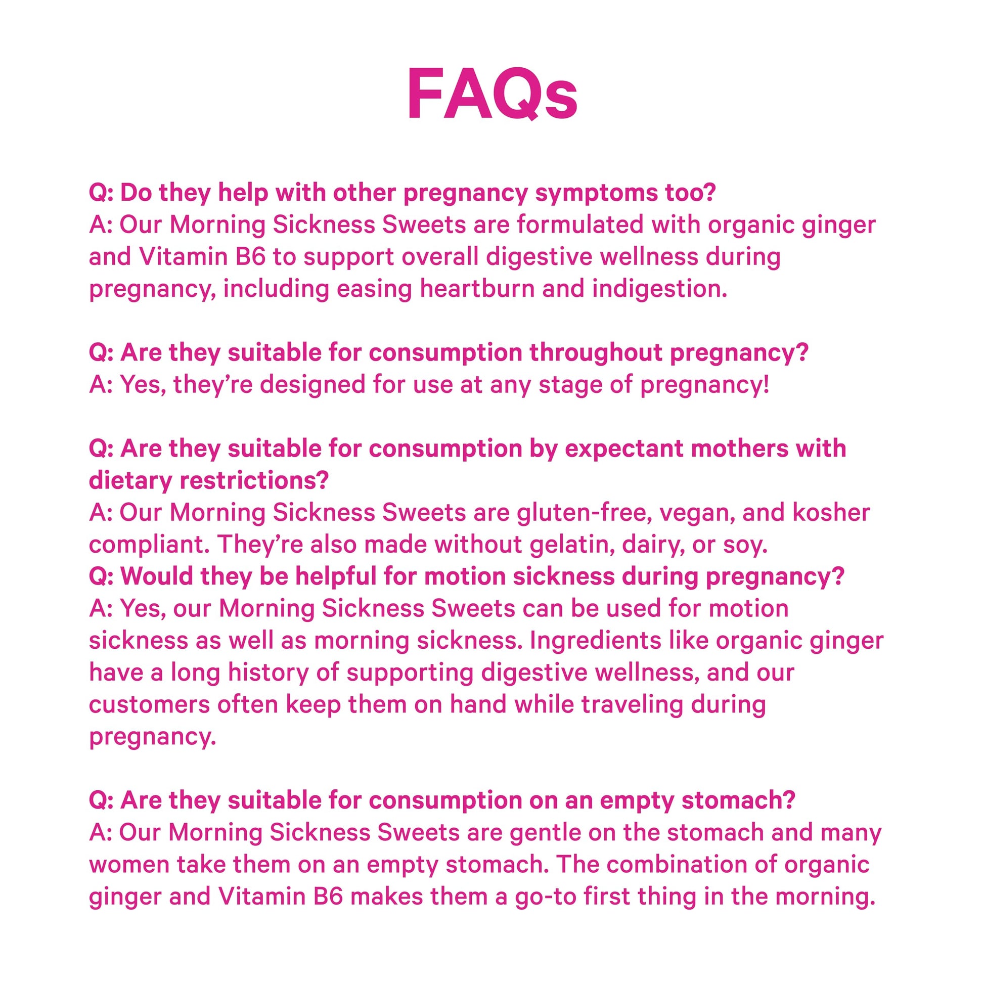 - Morning Sickness Sweets are first-trimester pregnancy essentials; we've added vitamin B6 to our lozenges to support digestion, energy, and help break down food. No need to stop use after the baby arrives - our sweets are breastfeeding-friendly!