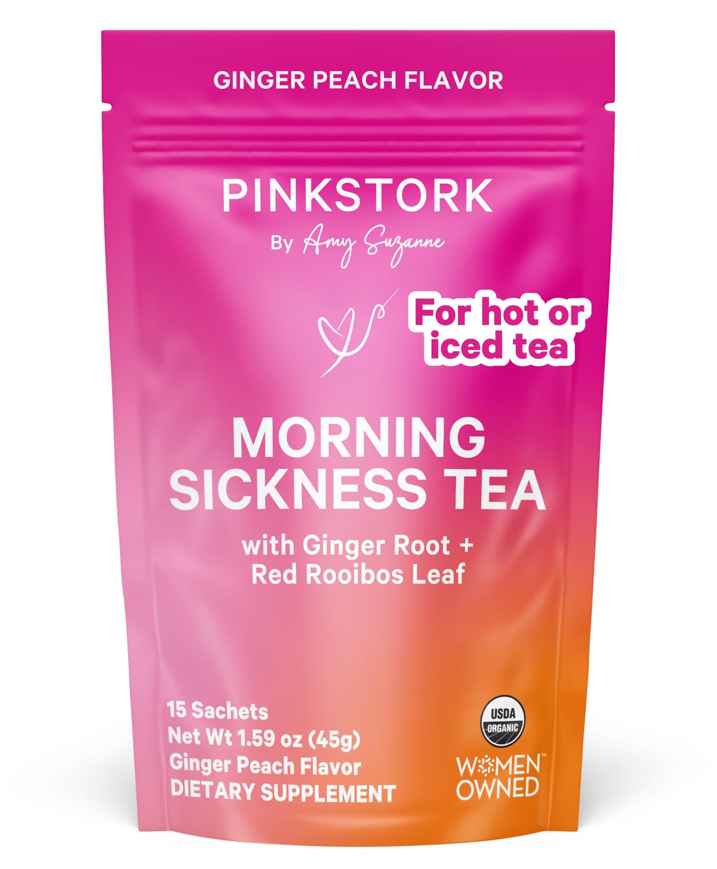 Pink Stork Organic Morning Sickness Pregnancy Tea - Hot or Iced Tea - Prenatal Heartburn, Indigestion, and Constipation Support - 1st Trimester Pregnancy Must Haves - Ginger Peach, 15 Sachets