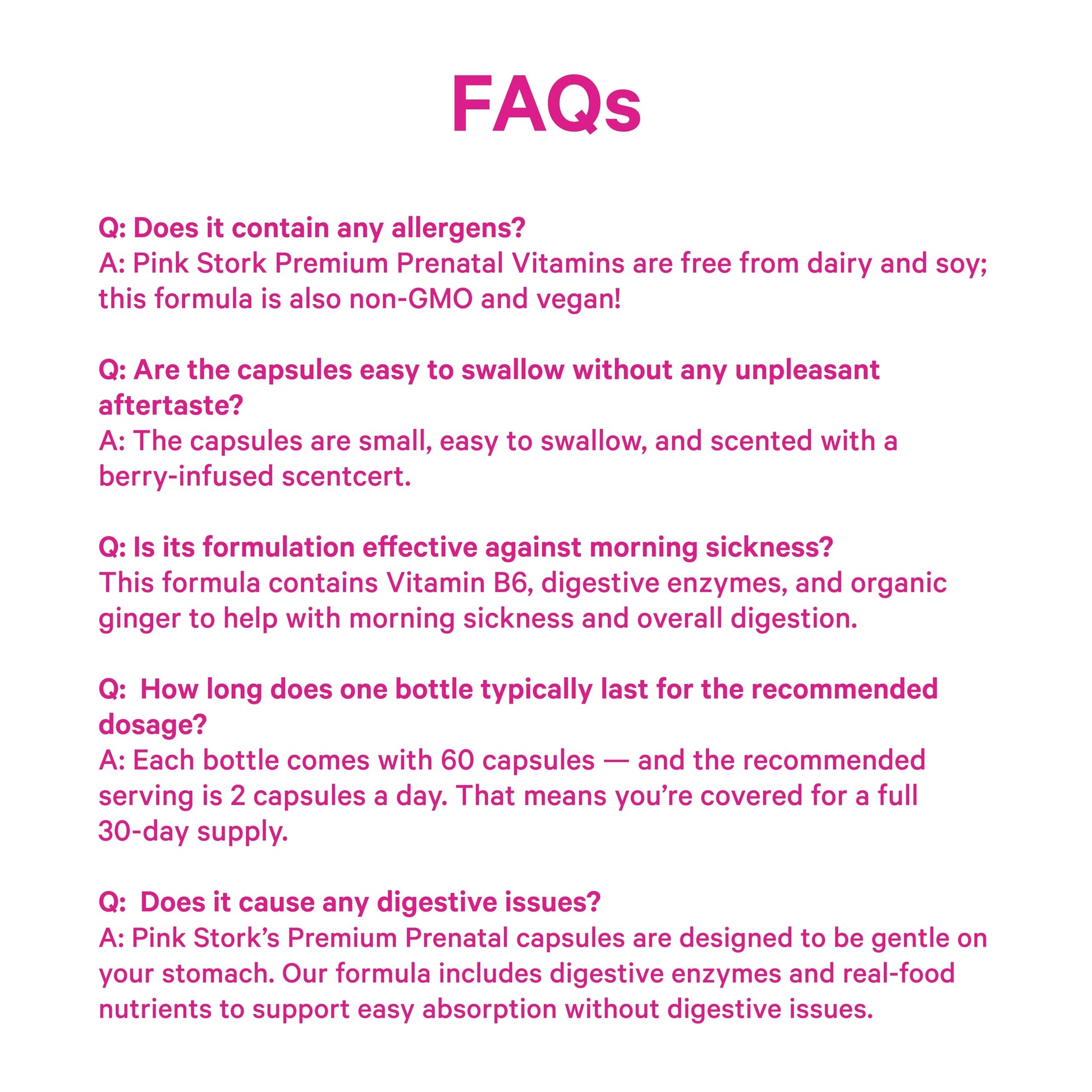 - Doctor-Formulated Prenatal for Women: Pink Stork Premium Prenatal Vitamin offers essential support for pregnancy, containing 100% of 21 OBGYN recommended nutrients and vitamins. PLUS prenatal-probiotics, organic and whole-food nutrient blends. Take two capsules daily as part of your prenatal ritual. 30-day supply.